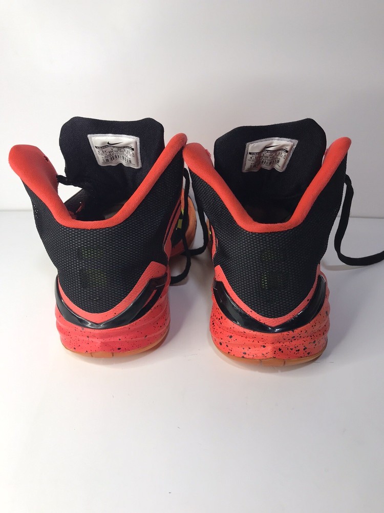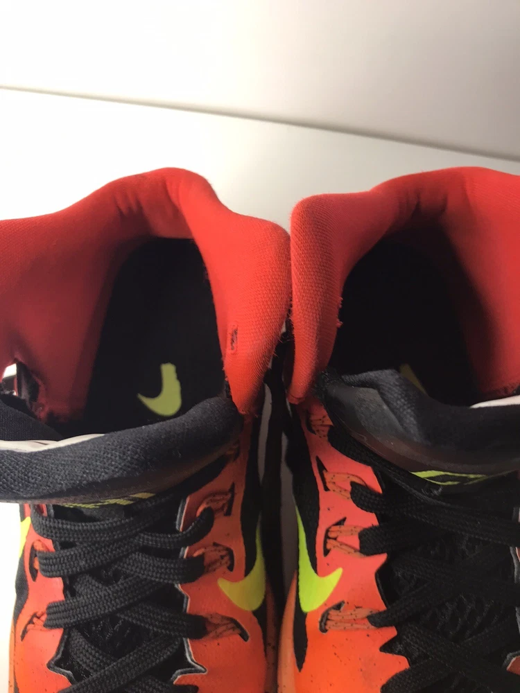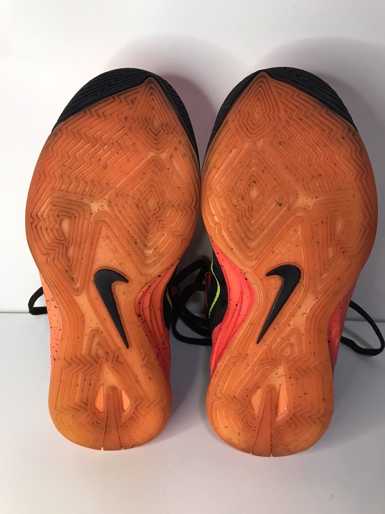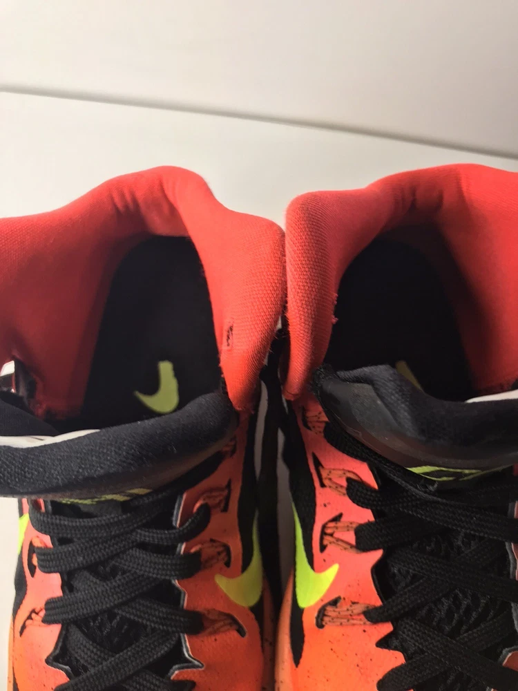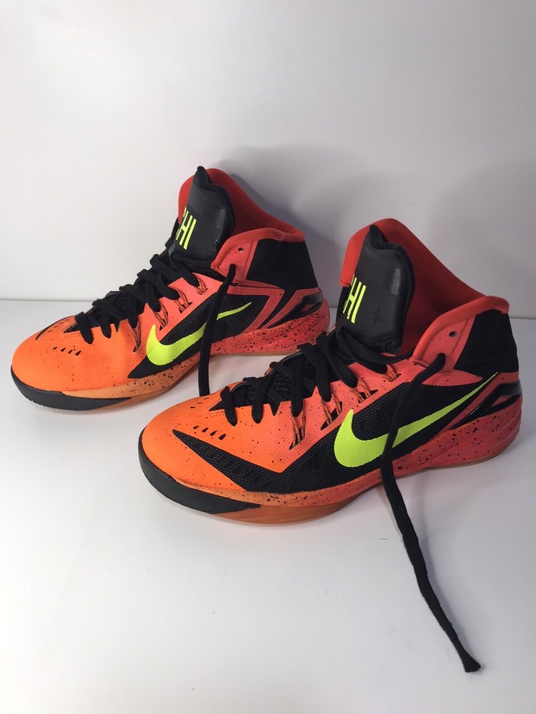For sale is a pair of Nike Hyperdunk 2014 Chi sneakers in orange color, with style code 698186-800. These sneakers are designed for boys who engage in basketball and have a mid-top shoe shaft style. The shoes were released in 2014 and belong to the Nike Hyperdunk product line, with model number 698186-800. The US shoe size for this pair is 4.5, The sneakers are pre-owned but still in good condition, ready to be used by their new owner. The soles are transparent orange that let the black speckles show through,