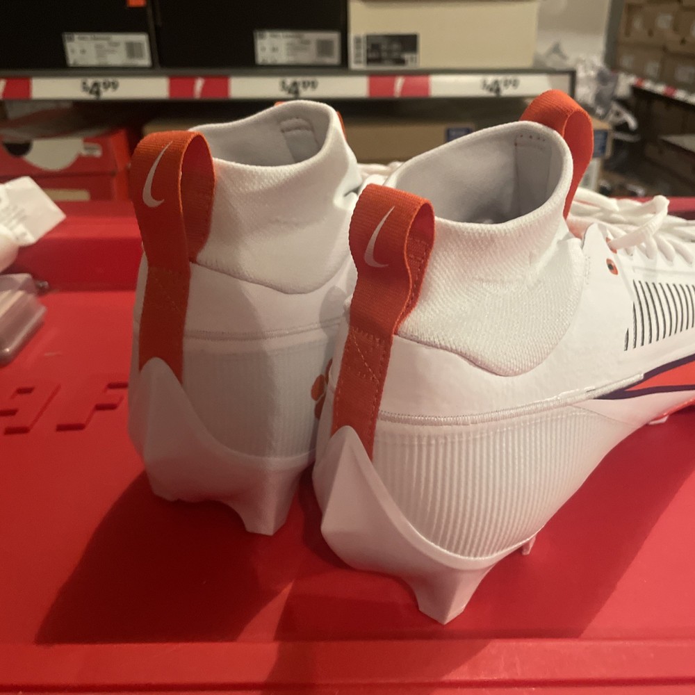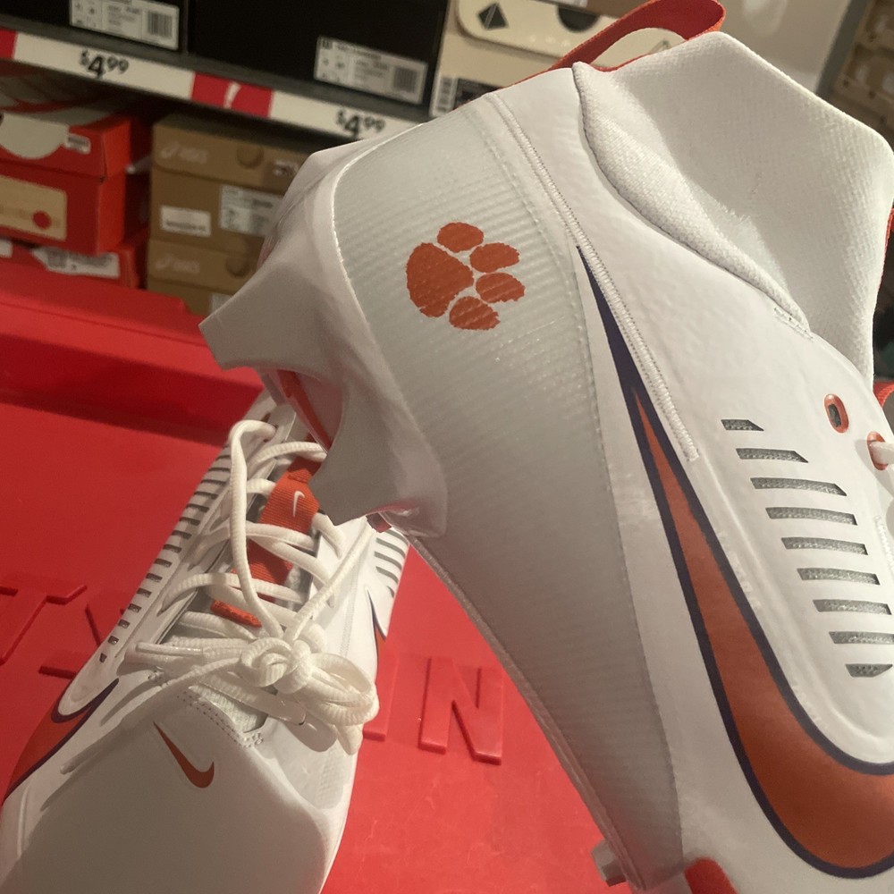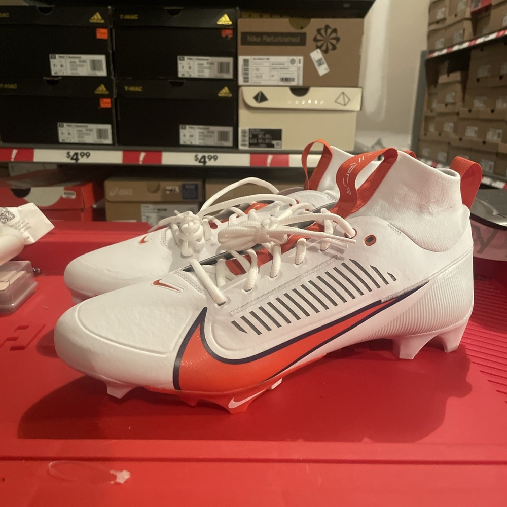 The Nike Vapor Edge Pro 360 2 Clemson Tigers PE in Orange and White is a stylish and performance-driven athletic sneaker designed for men. With a lace-up closure and mid-top shoe shaft style, this shoe offers a comfortable and breathable fit for all seasons. Featuring cushioning, lightweight design, and plastic cleat type, it is perfect for football players looking to enhance their performance on the field. The shoe also showcases a solid white color with the iconic Clemson character, making it a unique choice for fans and athletes alike. Made with synthetic upper material in Vietnam, this Nike Vapor Edge Pro 360 2 model is a standout addition to any athletic wardrobe.