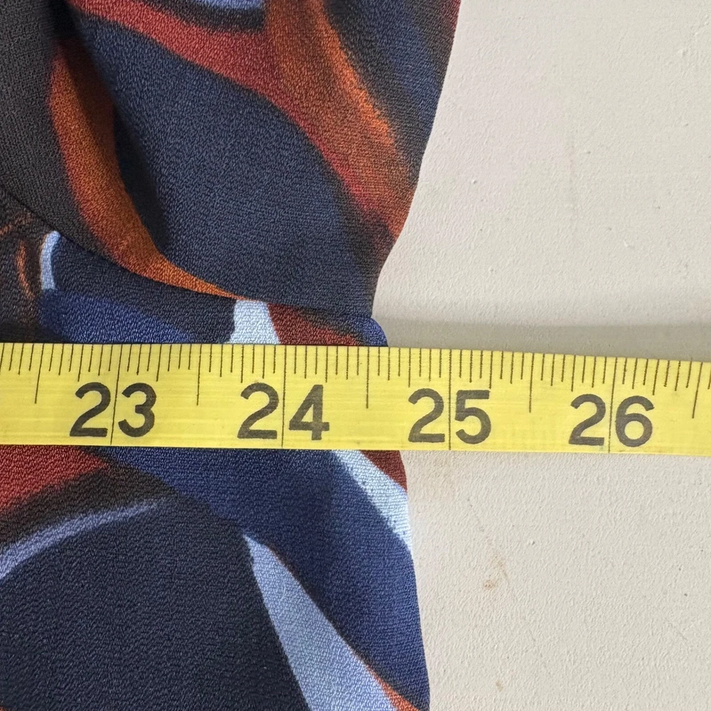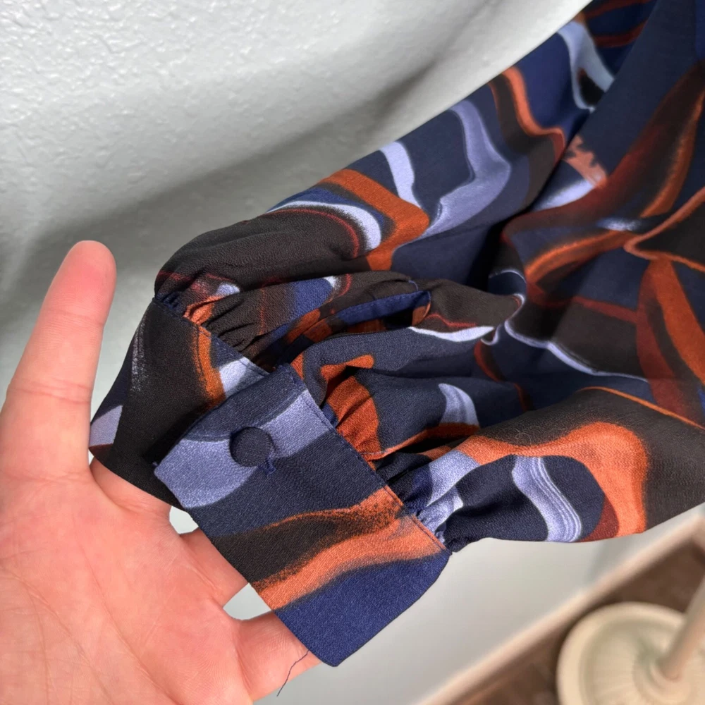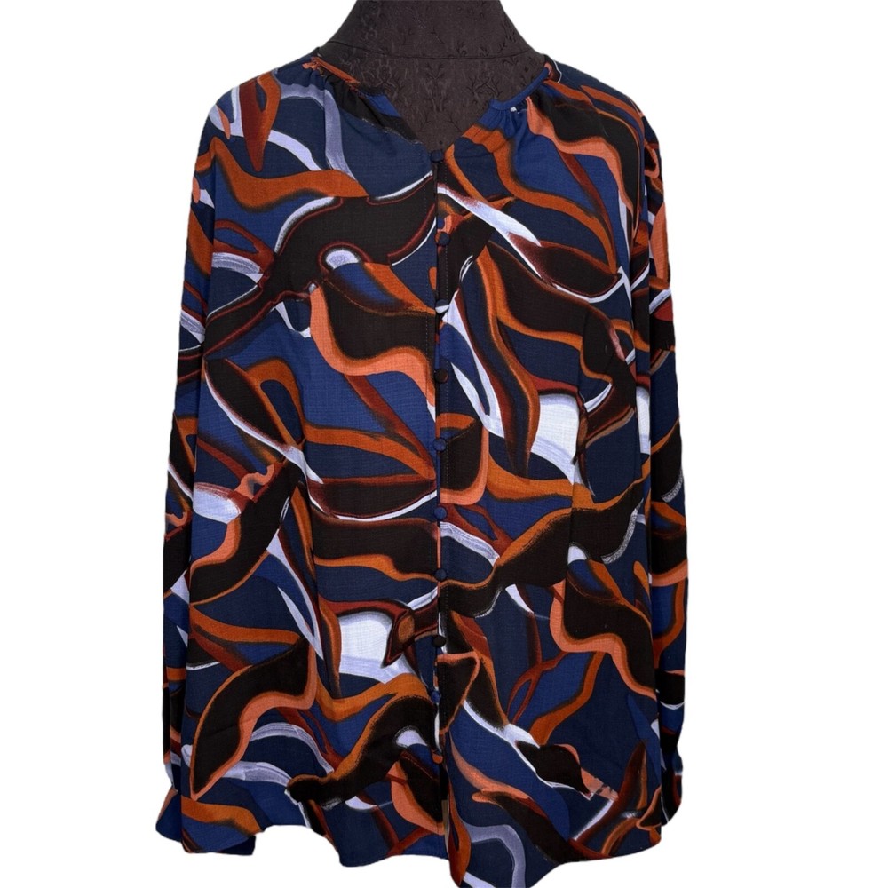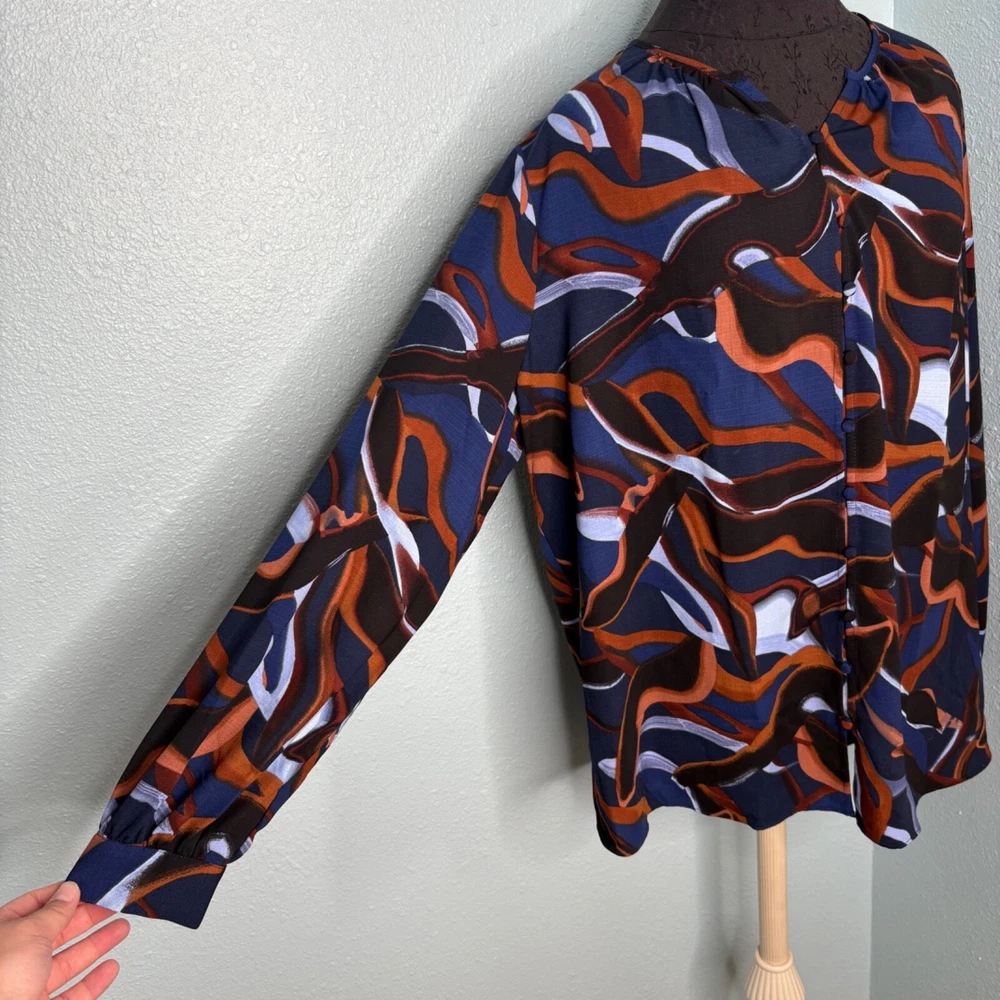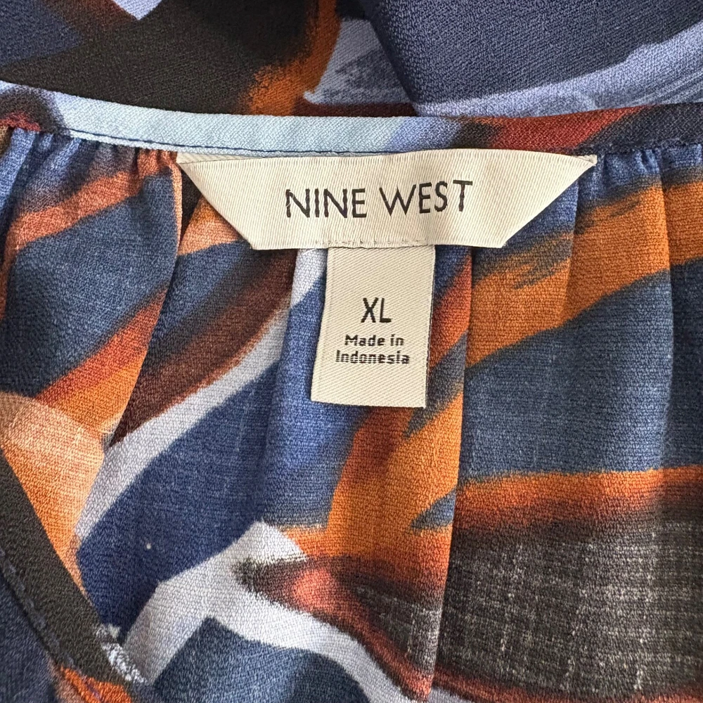 Nine West Colorful Navy Blue Blouse Shirt Top Size XL This blouse is navy blue, white, orange, red, and black. It has an abstract colorful pattern. The neckline is mostly round with a V at the center of the neckline. It is a long-sleeved shirt that buttons at the cuff. This blouse buttons down the front. It is a lightweight, relaxed-fit style blouse. Excellent Condition 100% Polyester Machine washable Measurements: All measurements are taken with the item lying flat. Bust: 24.5" Length: 28.5" Classic, Glam, Concert, Dinner, Date Night, Night Out, Date, Party, Special Event, Business Casual, Office, Workwear, Minimalist, Mid Century Modern, MCM, Holiday, Casual, Summer, Spring, Fall, Winter, 50s, 60s, 70s, 80s, 90s, Retro, Professional