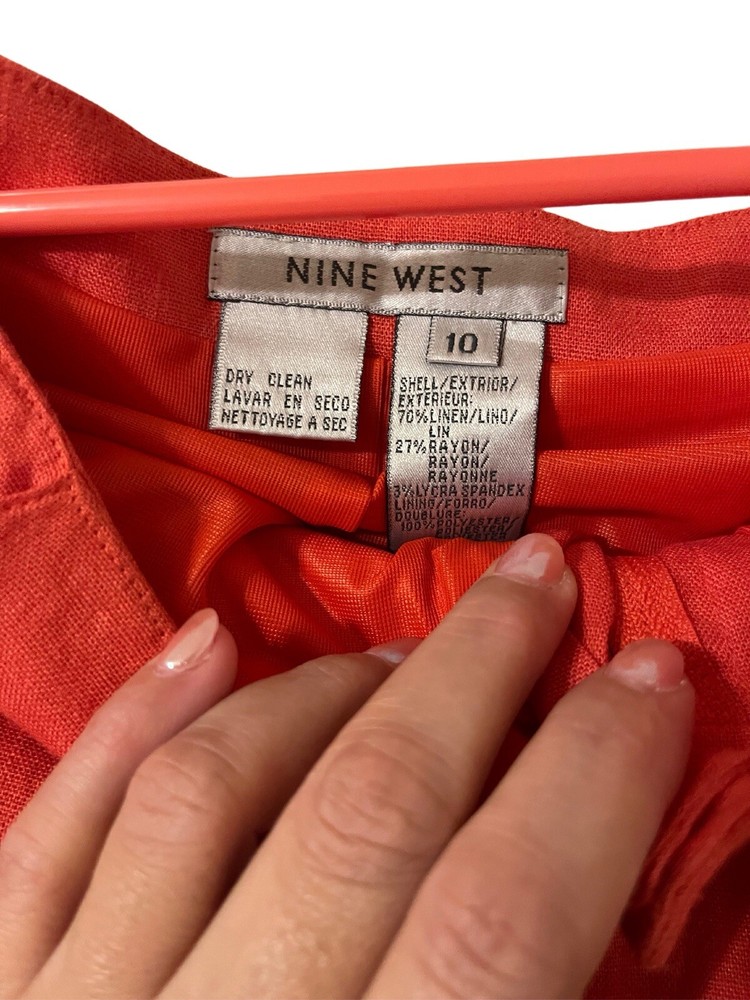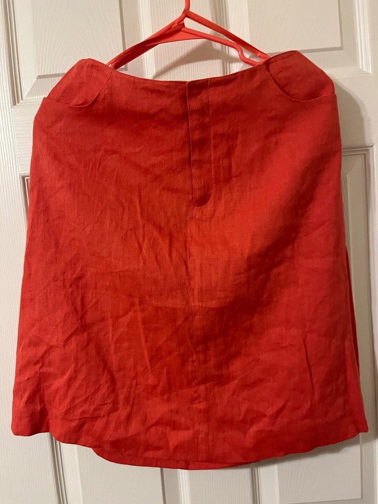 Nine West stylish orange A-line skirt in size 10. It features a solid pattern and a zip closure. Made of a blend of rayon and linen, this knee-length skirt is perfect for travel, casual or business occasions. The skirt is lined and has a vibrant color. It is suitable for all seasons, including winter, summer, fall and spring.