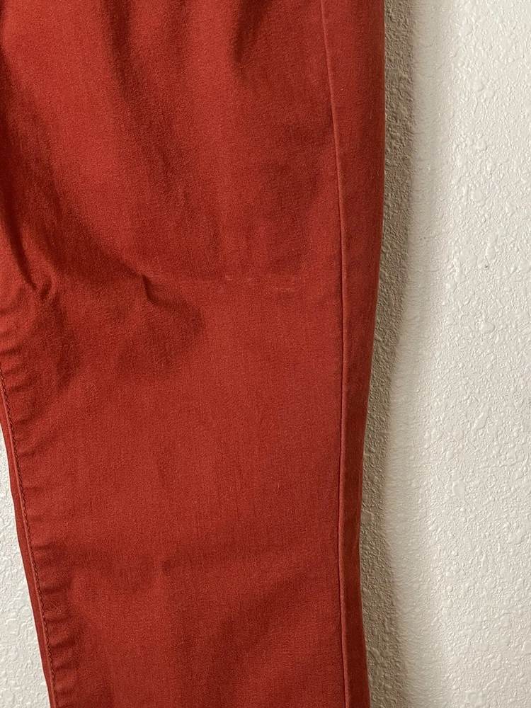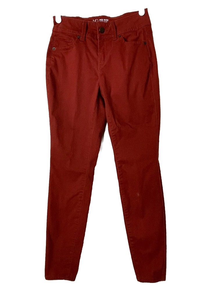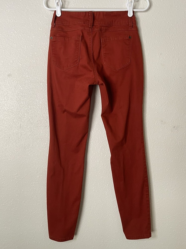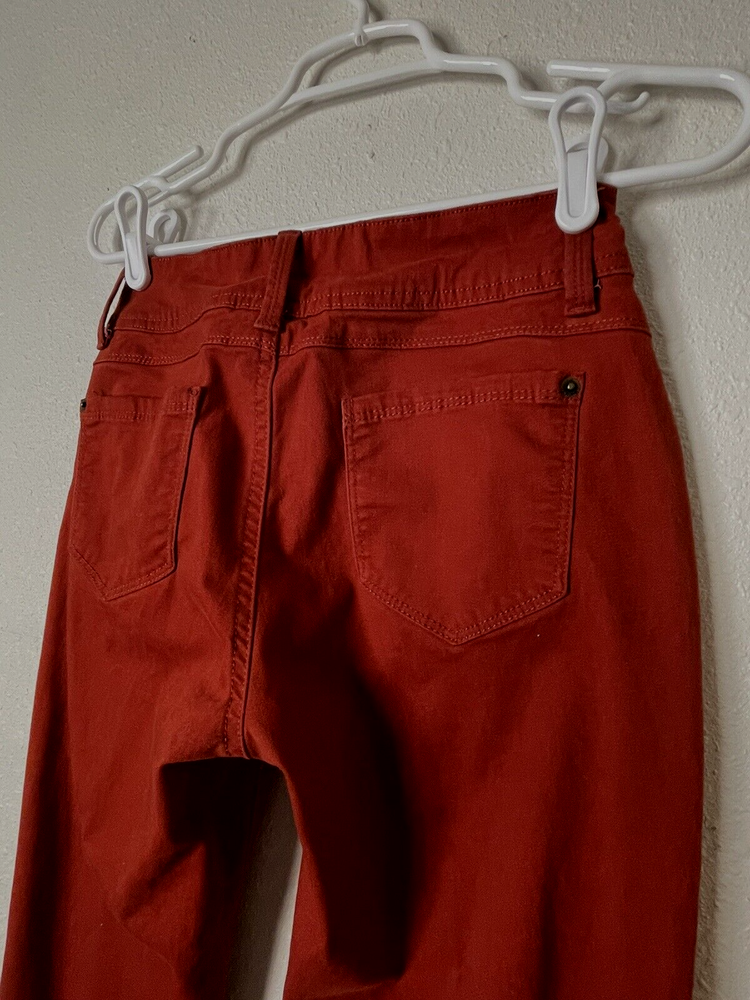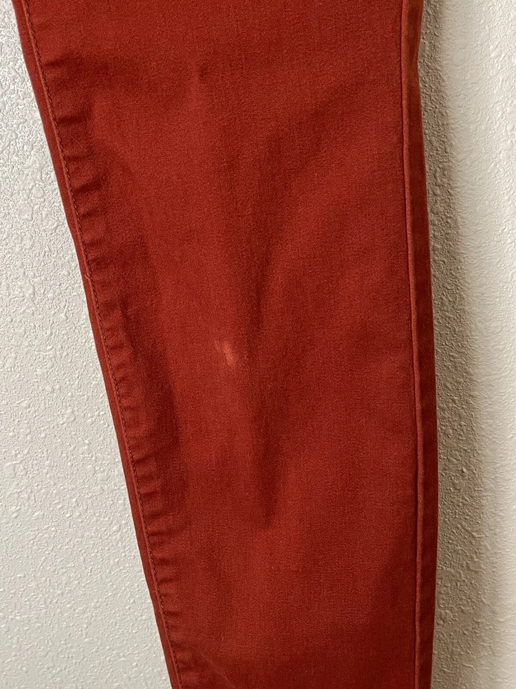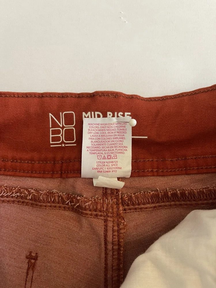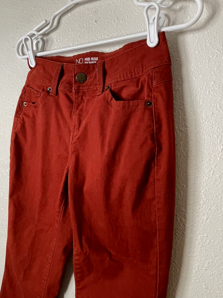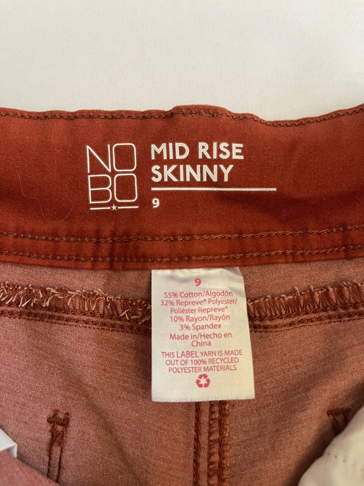NoBo Women's Rust/Dark Burnt Orange Mid Rise Skinny 5 Pocket Jeans Size: 9 Style: Skinny Wash: Dark Materials: 55% Cotton, 32% Repreve, 10% Rayon, 3% Spandex Measurements (approximate) Waist: 12.5" (25" total) Inseam: 28" Rise: 9" Front, 11.5" Back Leg Opening: 5" Condition: Gently Pre-owned - No Holes or Rips. *Small Fade Spots (See pics) *Due to lighting, slight differences in color may occur between photo and jeans. K
