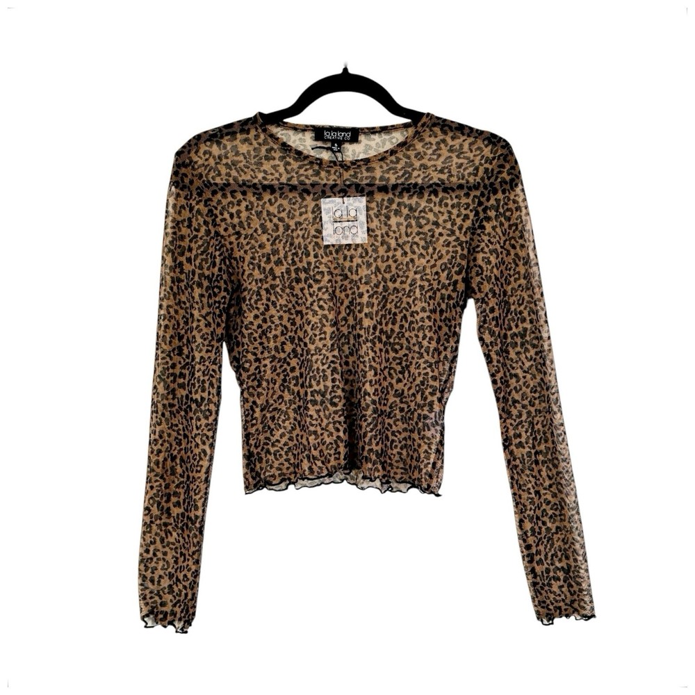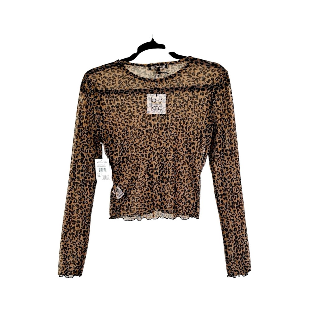Nordstrom La La Land Creative Co Caramel Black Animal Leopard Print Mesh Crew Neck Long Sleeve Lettuce Trim Cuffs & Hem Top Stretch Knit Lightweight Pullover Size Small - New with tag. Dress this top up or down. Certain images lightened for detail. Difficult to capture exact color in pics. - New with tag - Caramel & Black - La La Land Creative Co Animal Print Mesh Top - Leopard print - Pullover style - Crew neck - Long sleeve - Lettuce trim on cuffs & hem - Lightweight - Straight hem - Stretch - Mesh - 96% Polyester & 4% Spandex - Size Small
