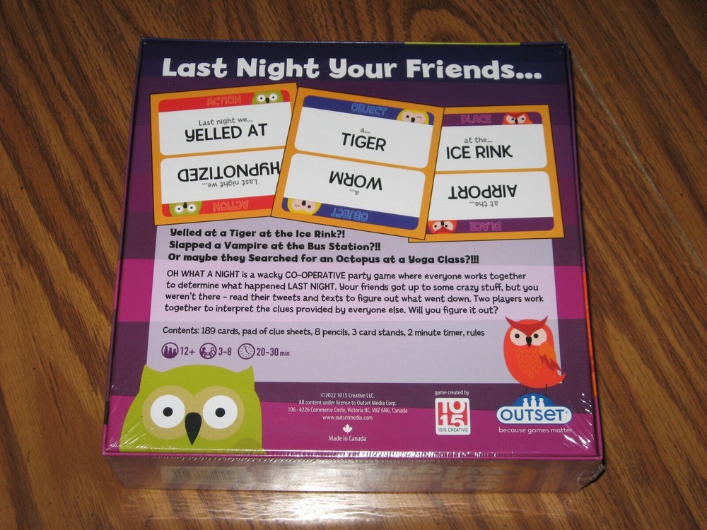 OH WHAT A NIGHT A CO-OPERATIVE PARTY GAME.THE ITEM WILL SHIP PRIORITY MAIL WITH TRACKING AND INSURANCE.THANKS FOR LOOKING....