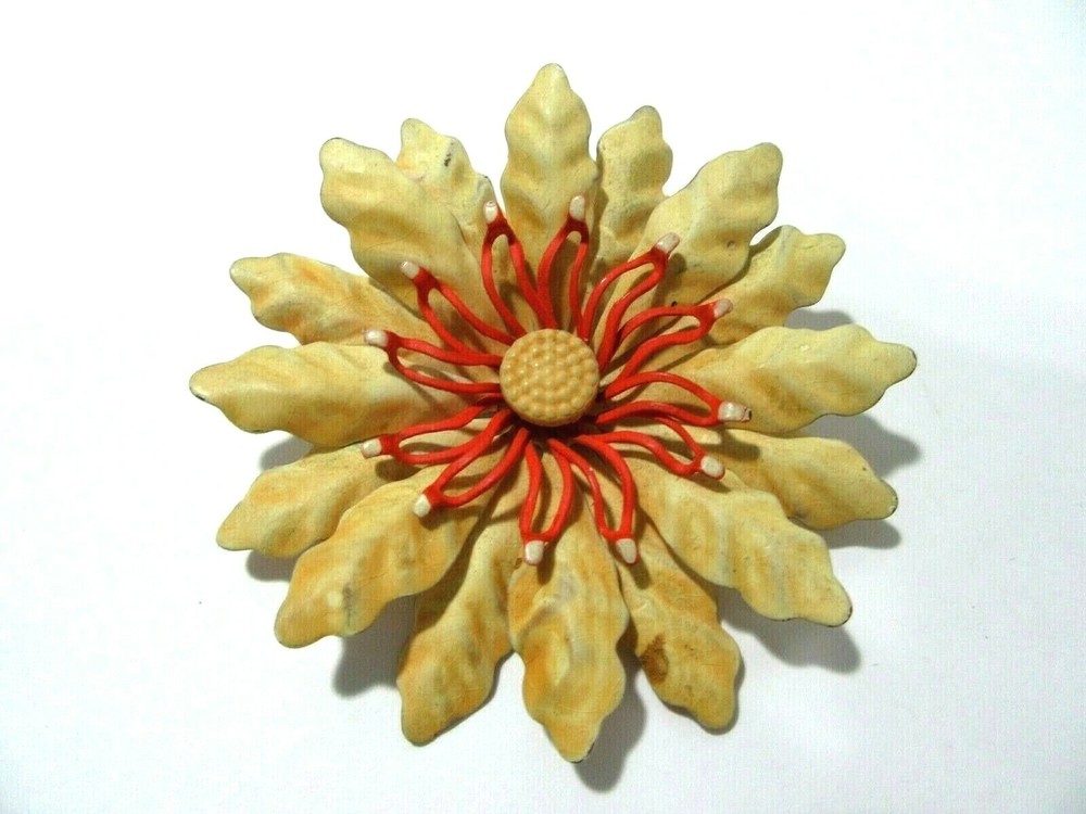 ORANGE, CREAM, WHITE ENAMEL FLOWER PIN. MEASURES APPROX. 2 5/8" IN DIAMETER. HAS SOME LIGHT GENERAL WEAR, MARKS, OVERALL GOOD VINTAGE CONDITION. SEE PICTURES. 001