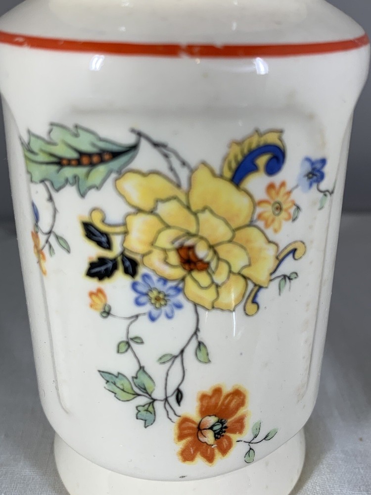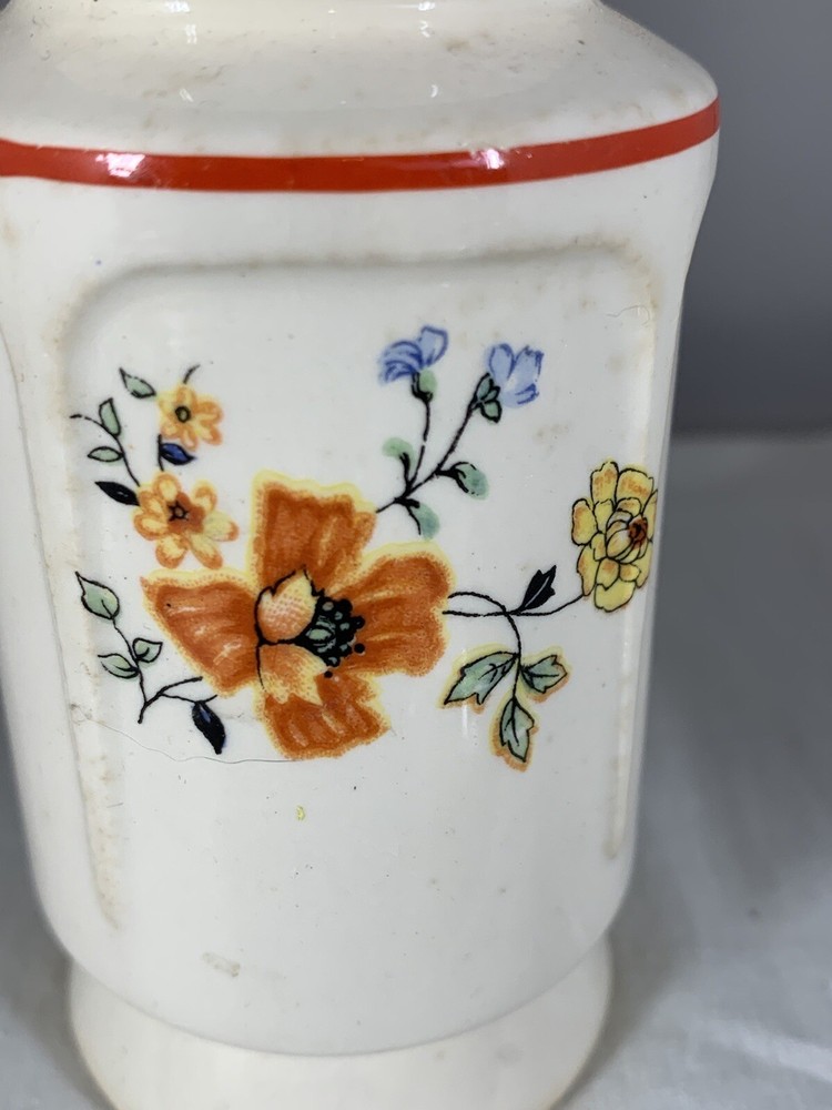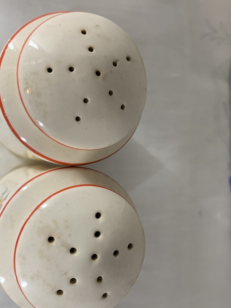 ORANGE PIN STRIPED FLORAL LG. SALT &PEPPER SHAKERS 4”T X 2”W. THESE SALT AND PEPPER SHAKERS ARE IN EXCELLENT CONDITION WITH NO CHIPS, CRAZING OR CRACKS. THEY ARE OF A NICE SIZE, HOWEVER THEY DO NOT HAVE THEIR END STOPPERS.