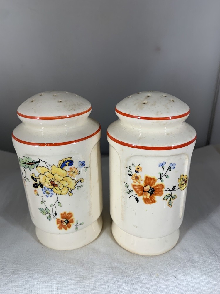 ORANGE PIN STRIPED FLORAL LG. SALT &PEPPER SHAKERS 4”T X 2”W. THESE SALT AND PEPPER SHAKERS ARE IN EXCELLENT CONDITION WITH NO CHIPS, CRAZING OR CRACKS. THEY ARE OF A NICE SIZE, HOWEVER THEY DO NOT HA...