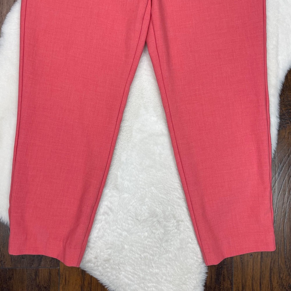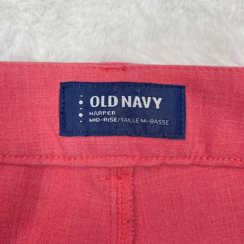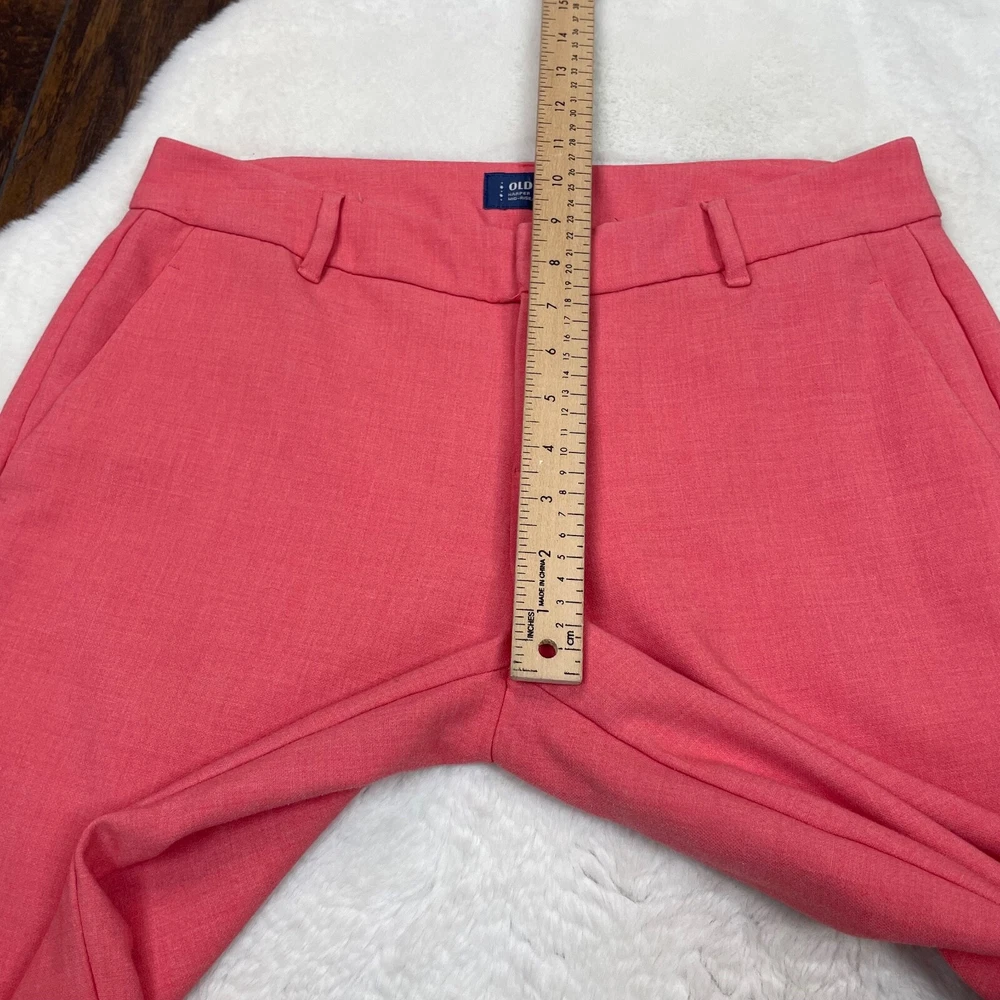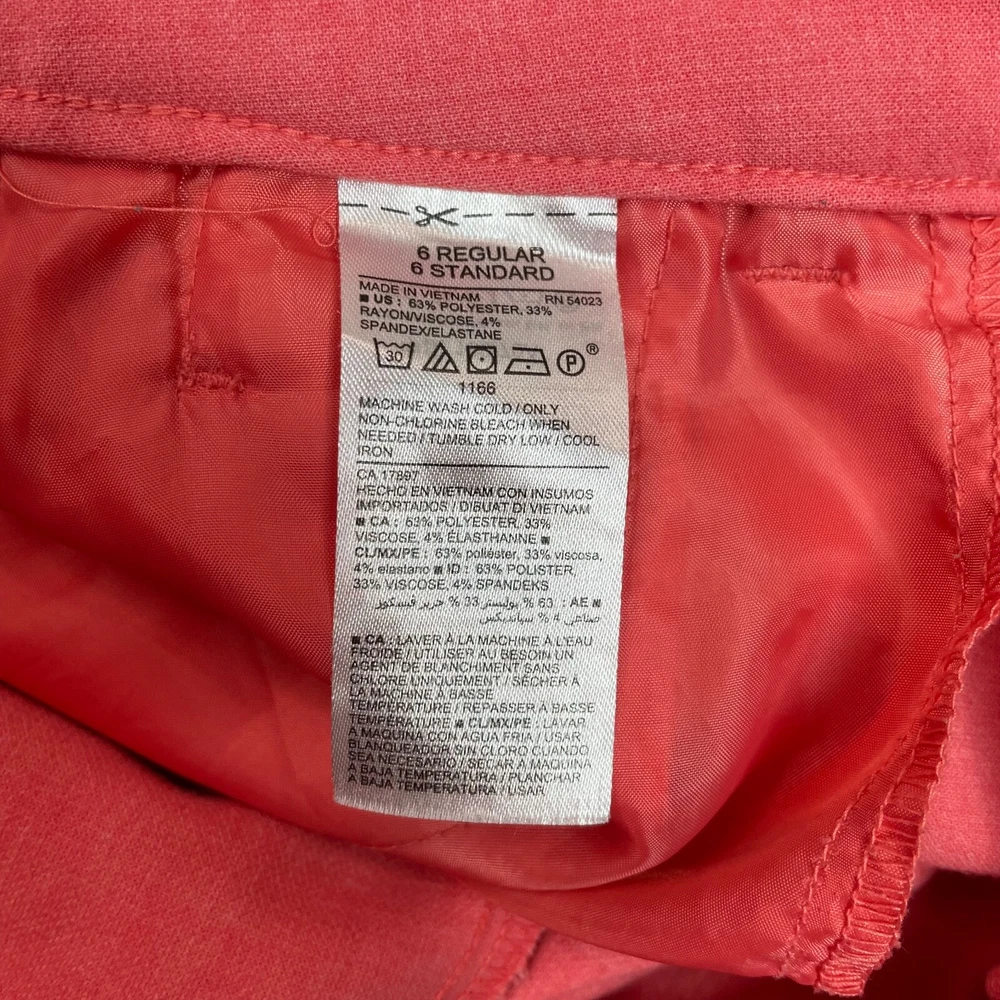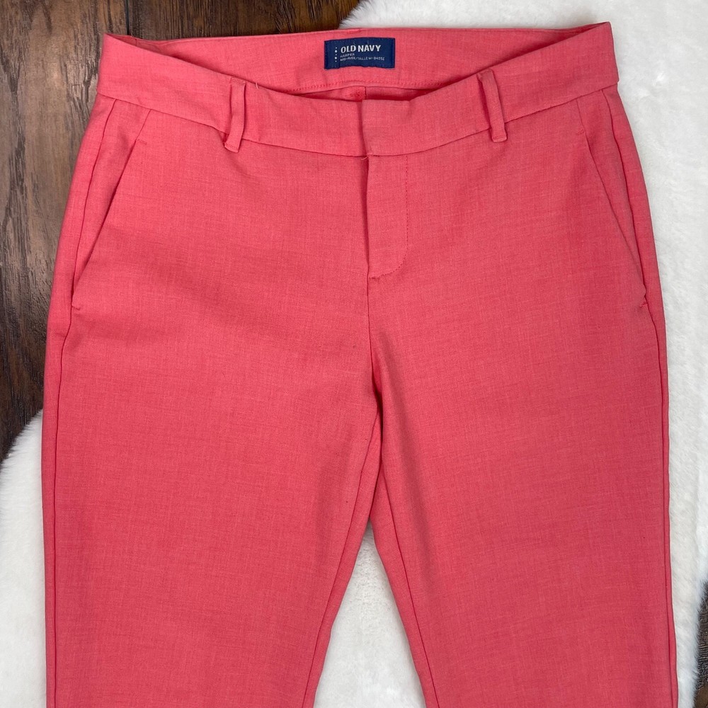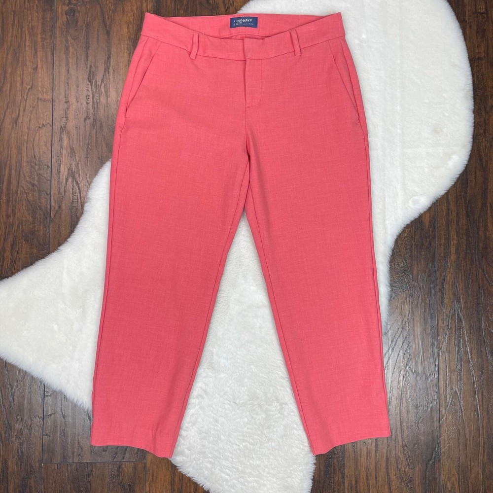 Old Navy Harper Pants Coral Orange Slim Leg Crop Mid-Rise Stretch Size 6 Measurements included in photos. Has a small dark spot on the left leg. Please see photos. No holes or tears.