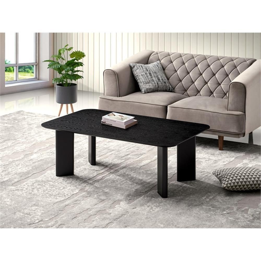 Introducing the Joss Coffee Table, a stunning blend of contemporary design and timeless craftsmanship. Featuring a rectangular shape with rounded corners, this coffee table adds a touch of sophistication to any living room. The solid wood legs provide stability and durability, while the walnut or ash veneered top showcases the natural beauty of the wood grain. With its versatile size and sleek profile, the Joss Coffee Table offers ample surface area for placing drinks, books, and decor items. Elevate your living space with the Joss Coffee Table, a functional and elegant centerpiece that effortlessly complements any interior style. Features: Material: Solid and Engineered Wood Finish: Black Ash Black Ash veneered top Solid rubberwood legs Modern design Minimal assembly required Specifications: Product Dimensions: 17"H x 47.2"W x 27.5"D Product Weight: 40.7 lbs