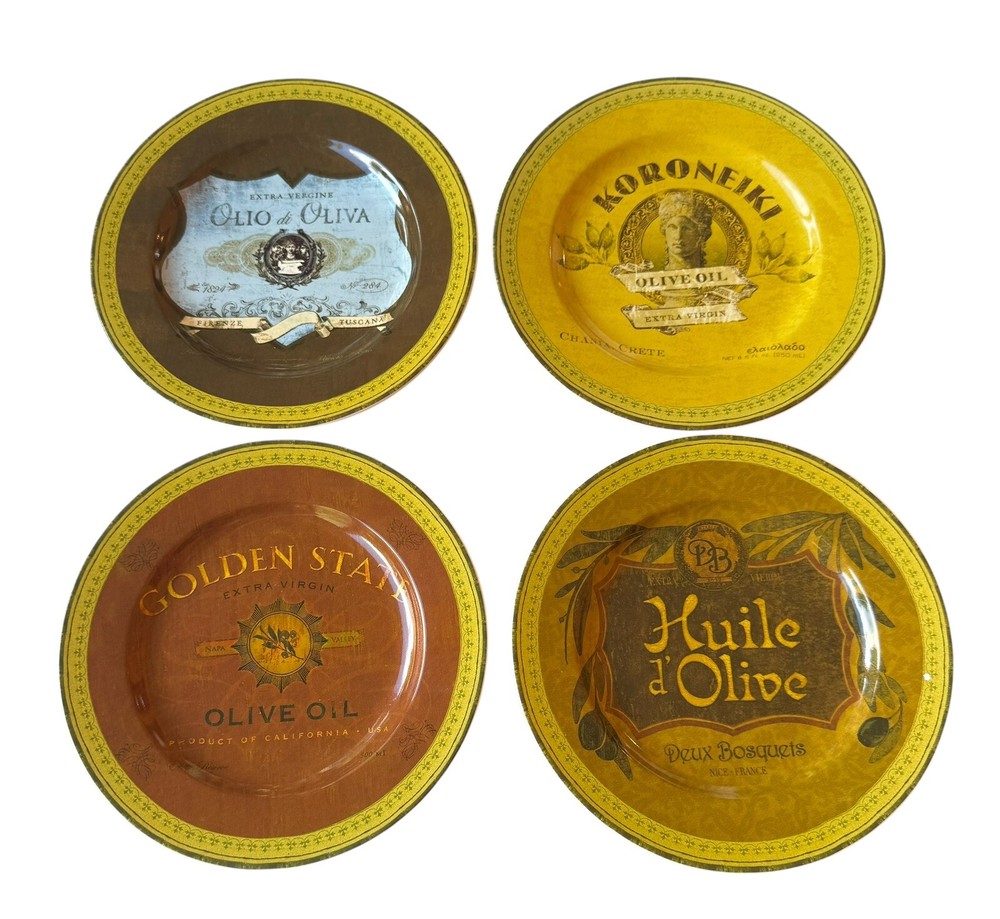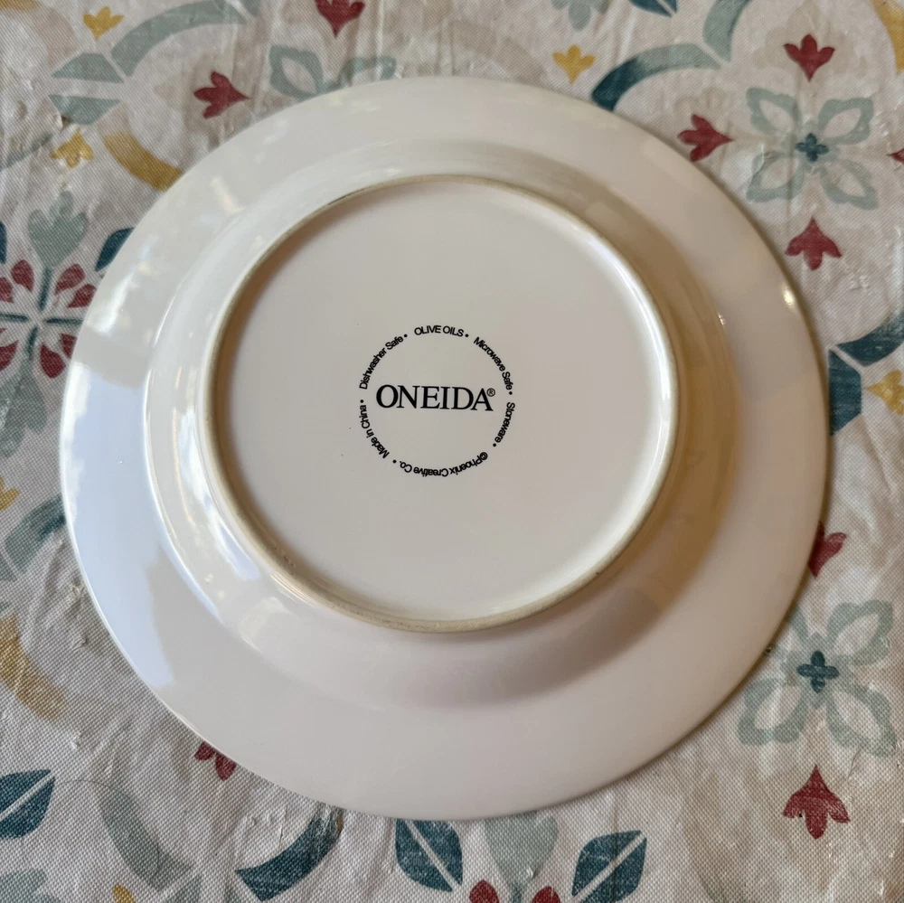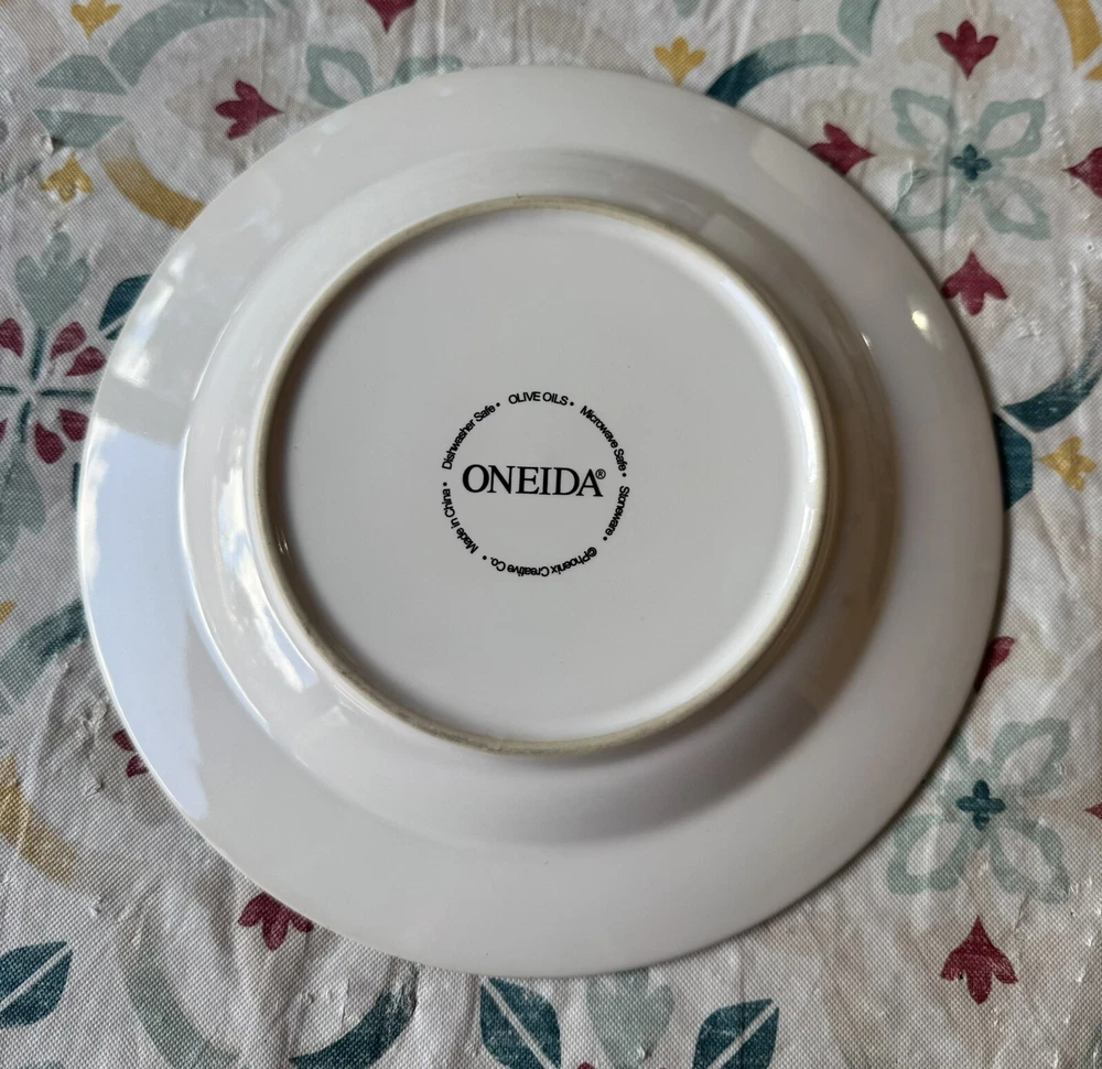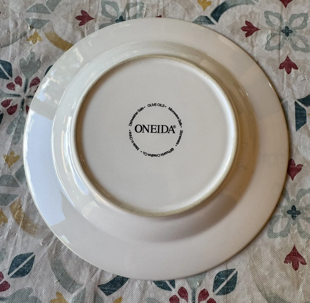 See pics for condition. This is a set of four round dessert plates with an Olive Oil theme by ONEIDA. Each stoneware plate measures 8.25" in diameter and weighs 15 oz. The design features a garden motif, suitable for all occasions. The plates are painted in olive color and have a country style, making them a charming addition to any table setting.