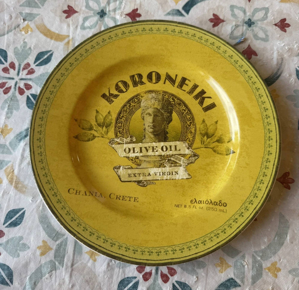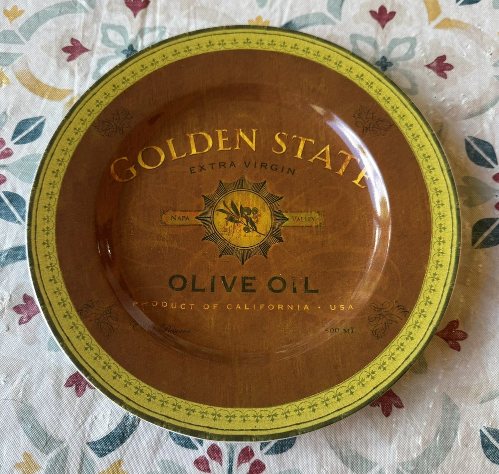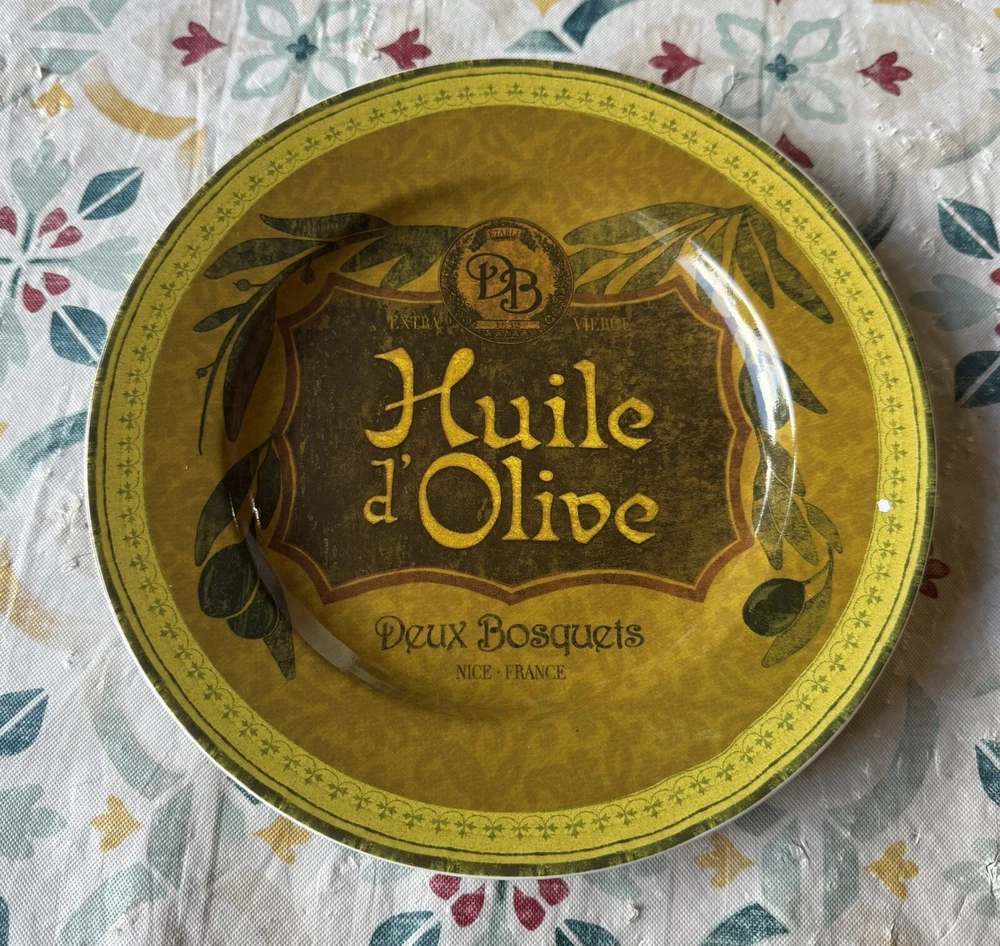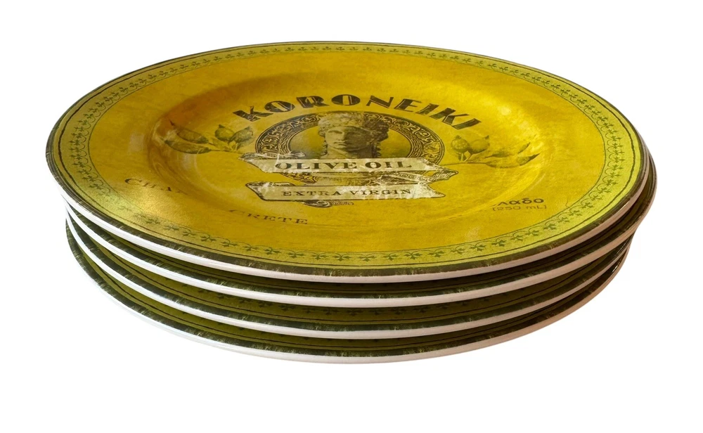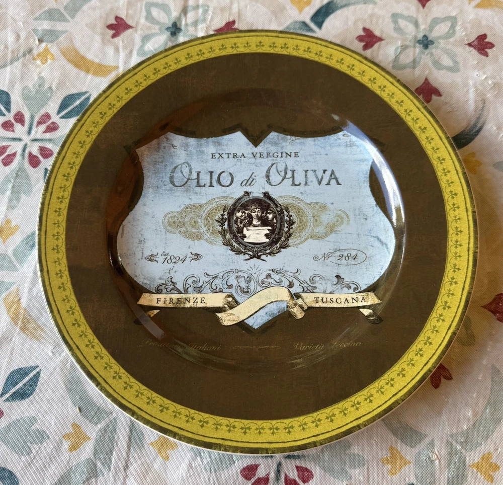 See pics for condition. This is a set of four round dessert plates with an Olive Oil theme by ONEIDA. Each stoneware plate measures 8.25" in diameter and weighs 15 oz. The design features a garden motif, suitable for all occasions. The plates are painted in olive color and have a country style, making them a charming addition to any table setting.
