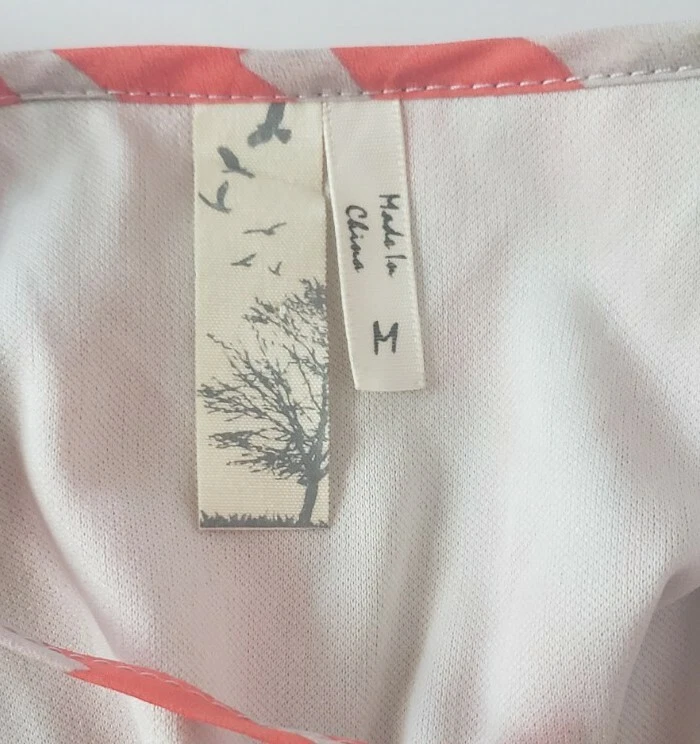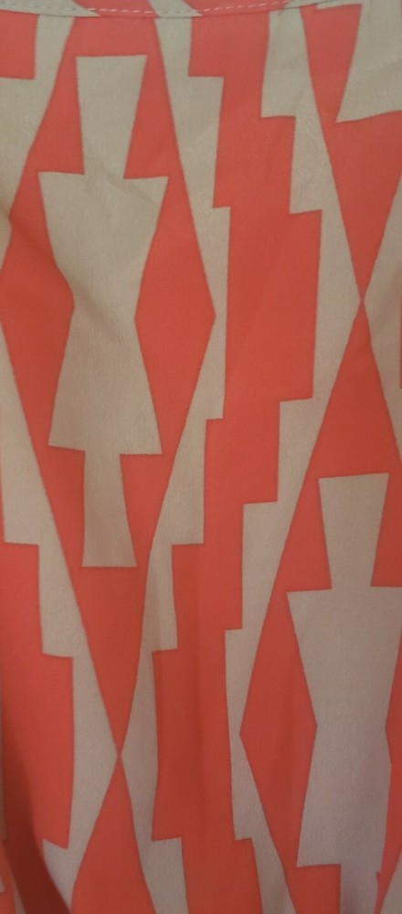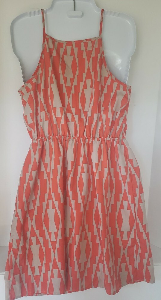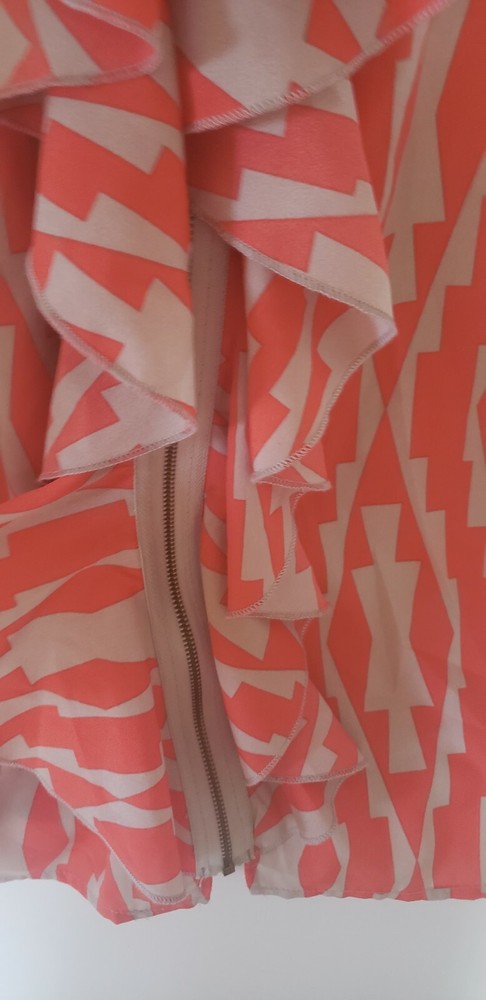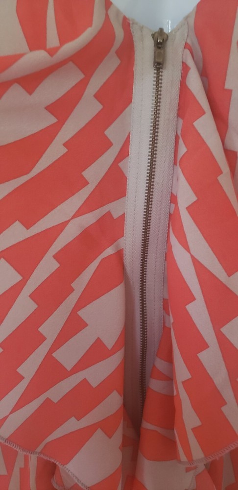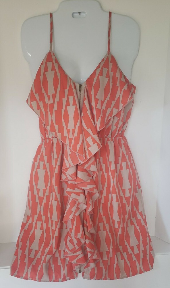 Listing is for a one of a kind Orange and tan/grey patterned Full Front Zipper and Ruffle Sleeveless Dress in Size Medium. Zipper runs the entire length of the dress and is in the front in the center of the ruffles. Chest measurement is 34". Waist measures 24" along elastic gathering. Brand name is unknown but tag has a tree and flying birds. Item is "Pre-owned but is clean and in excellent condition without flaws. Shipped with USPS First Class.