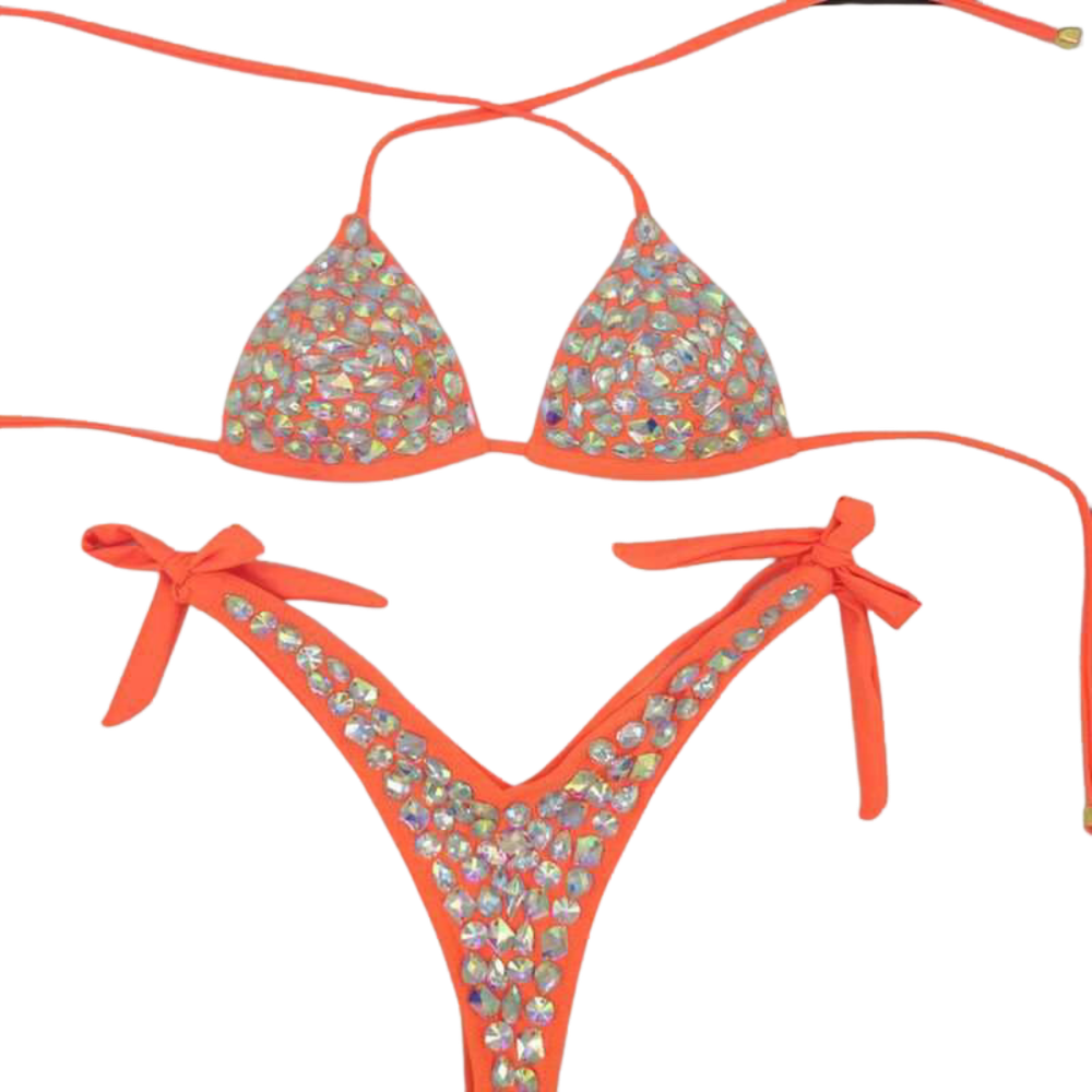 Welcome to boating season with this Blingkini Chique Orange swimwear! Perfect for those hot summer days spent at the lake, this sexy diamond swimsuit is sure to make a statement this season. With a unique rhinestone and crystal design, this polyester/spandex blingkini will turn heads wherever you go. Available in small, medium, and large, you're sure to find the perfect fit for your beach or bathing suit needs.