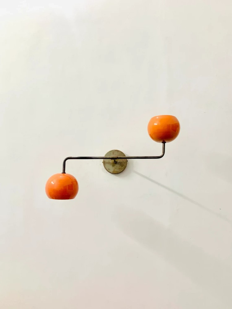 1950s Mid Century Brass Italian Diabolo Wall Sconce Light Fixture 2 Bulb. PRODUCT DETAILS:- Product: Wall Sconce Material: Metal , Brass Size: 11" H x 10" D x 18.5 W" Inches Canopy: 4" Inches Wall Sconce Diabolo Modern Italian Wall Lights White Wall Fixture Light . This is Stilnovo Style light fixture is made with UL approved parts. It has 1 arms/lights and measures 5" in diameter without light bulbs. It uses standard sconce socket light bulbs. We recommend 15W to 40W max. Light bulbs are not included. Wall canopy can be adjustable at different angles so you can mount this sconce. We hand craft all of our light fixtures. This chandelier has been made with brass material. Minor variations in finish are an inherent characteristic of such material and add to the beauty and uniqueness of the product. PRODUCT SPECIFICATIONS: • Premium quality mid-century Wall Fixture. • Made of pure brass brass shiny finish . other brass finishes are available at request. • Orange Glass Finish (all colour available) • Wall Fixture used standard sconce E-12 or E-14 light bulbs. (not included) • Canopy 4''inch • Reproduction Production Not Sold Antique. BULB TYPE: • Requires Four (4) 15 watt bulb type A (not included). • E-12 or E-14 socket Rated with 125 voltage, 75 watt max. • 7 watt to 15 watt bulbs are recommended. • Incandescent Bulbs, Energy Saying, LED Bulbs.