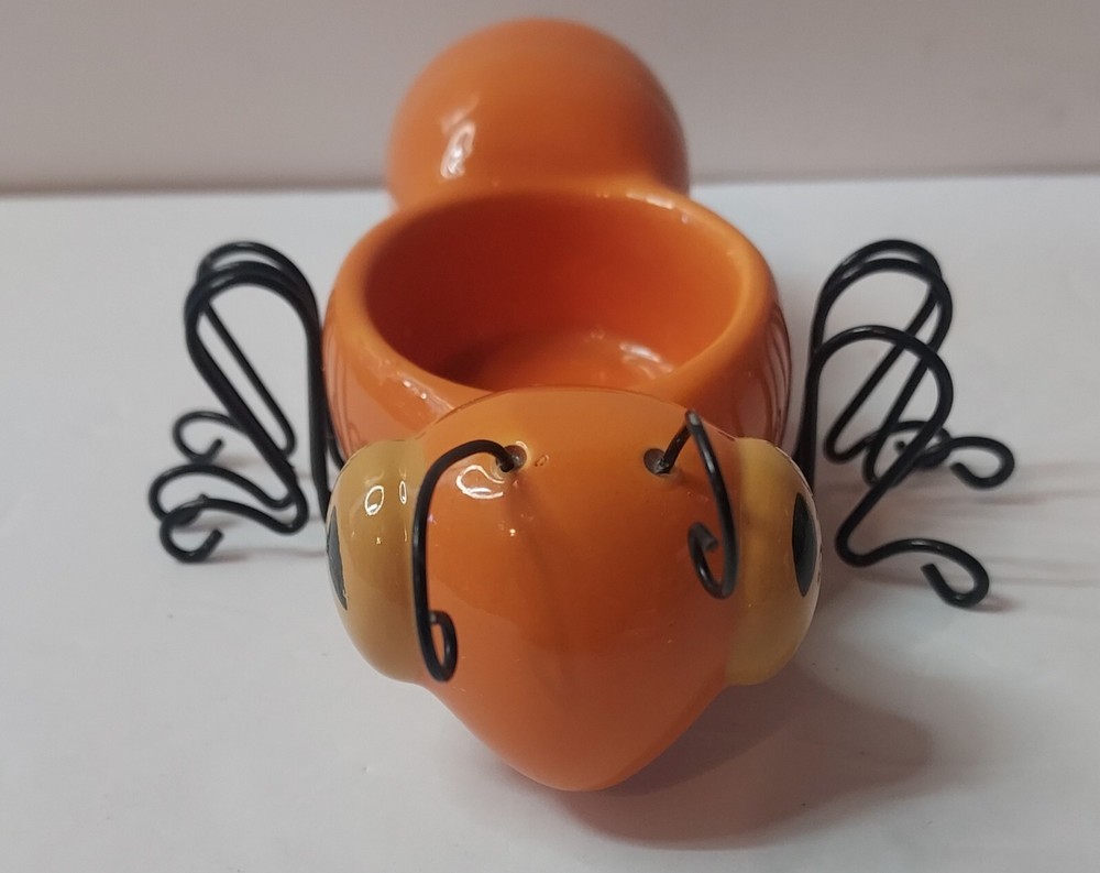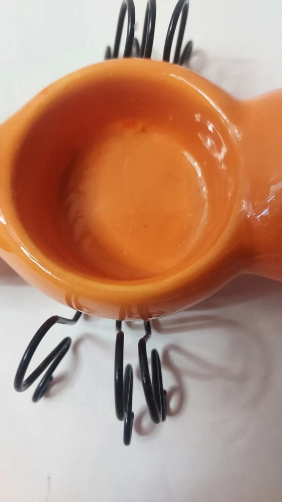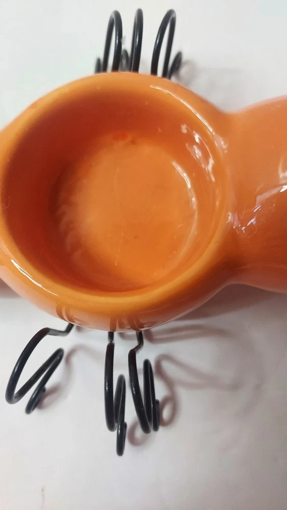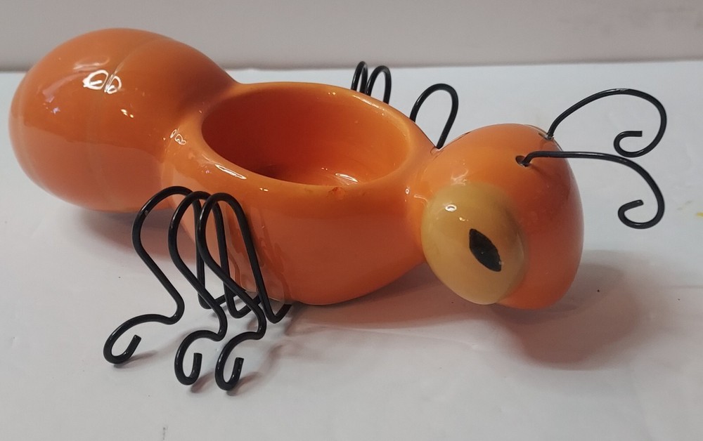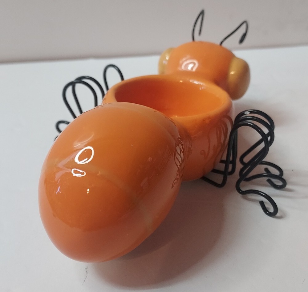 Add a touch of whimsy to your fall decor with this charming orange ceramic ant bug tealight candle holder. The insect-shaped holder has metal legs and a glossy finish, making it perfect for any room in your home. Use it as a centerpiece for your fall-themed dinner party or as a fun accent piece on your mantel. Crafted from high-quality ceramic and metal, this candle holder is easy to clean with a damp cloth. It measures 6" in length, 2" in height, and 3 1/2" leg to leg in width, making it a medium-sized piece that can fit almost anywhere. Whether you're an antique collector or simply appreciate unique decor, this item is sure to catch your eye. The tea light does have some slight scratches and a small chip, see pictures. Great decoration for fall.