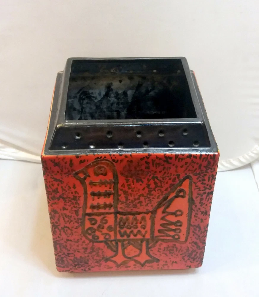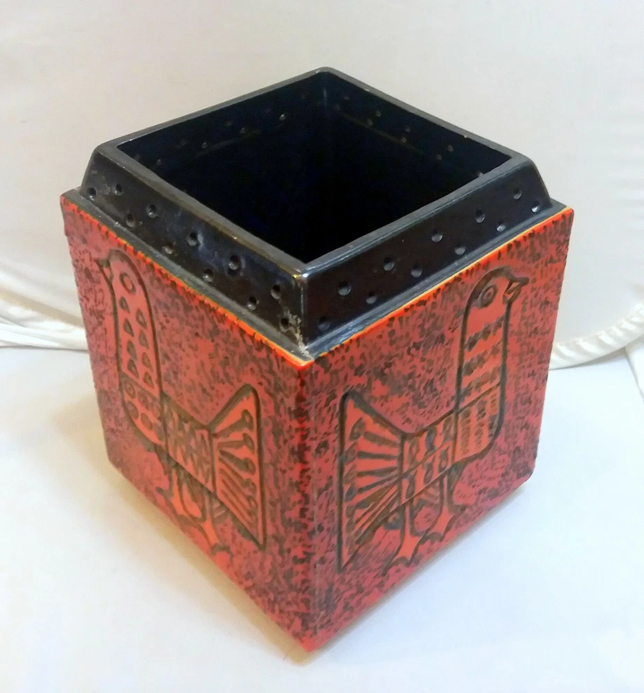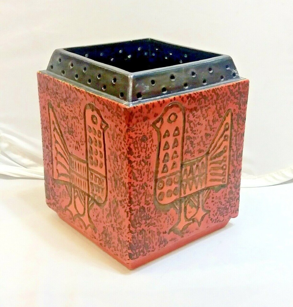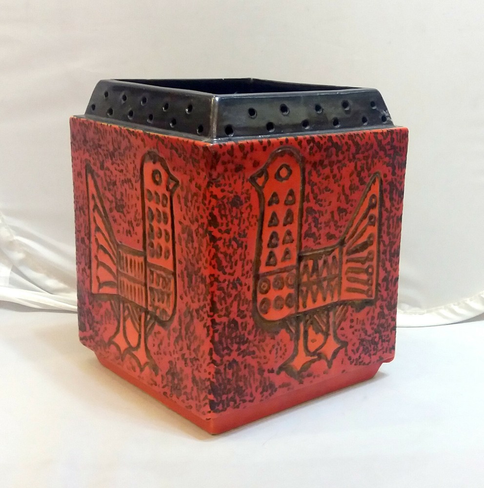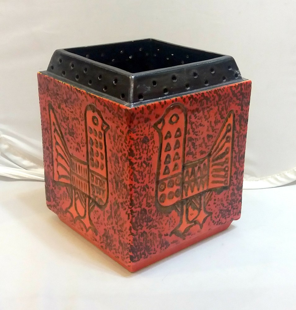 Hungarian Mid-Century Modern Pot with Pigeon decoration. Nádor Judit style, very good modern design. Hand made, hand painted item. Orange color, cube shape, a real modern form, can be a very good item in a modern enterieur. Age: 1960'. Size: 19,5x15,5x15,5cm/7,7x6,1x6,1inch. Perfect condition, no harm, no damage. The eBay listing photos are part of the description. We have many beautiful, collectable modern item, you can see these in our E-bay store. We wrap very safe with double box, bubble wrap and we can ship Worldwide. The eBay listing photos are part of the description.