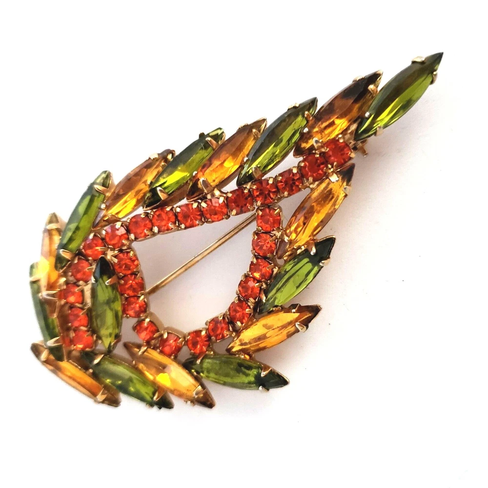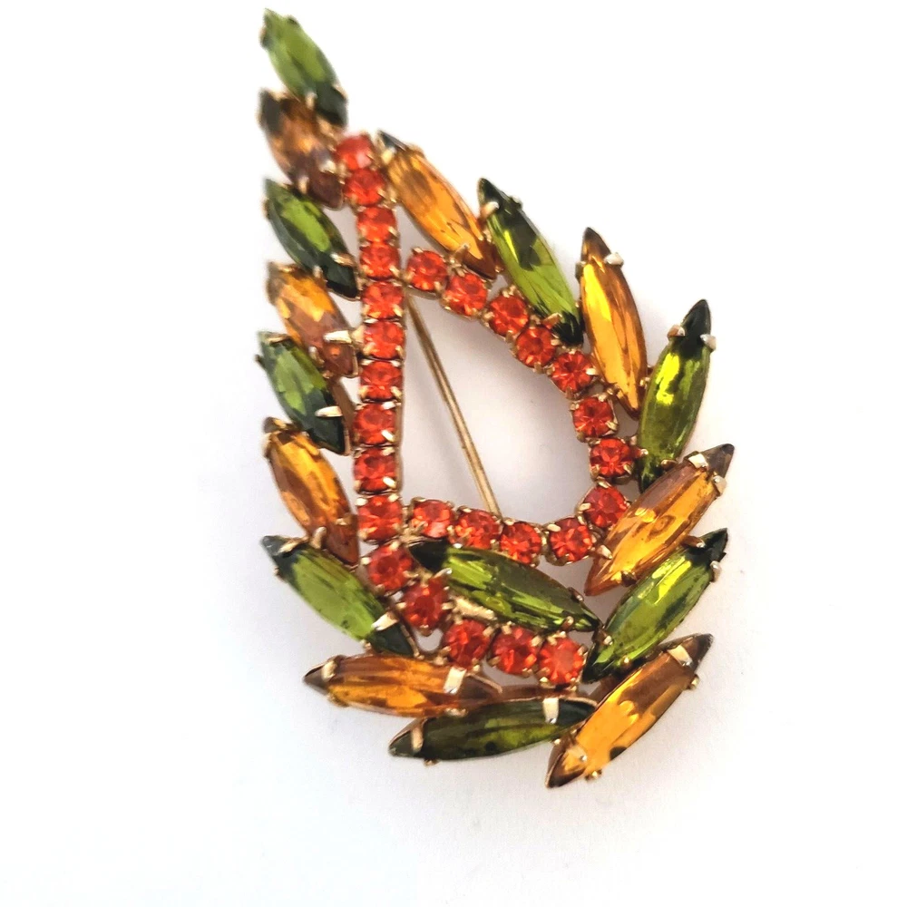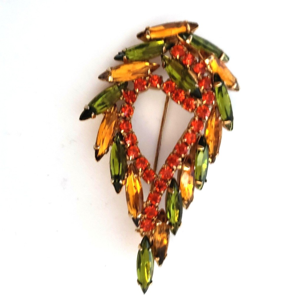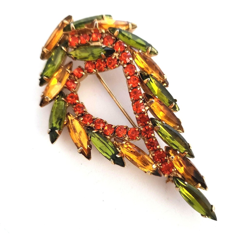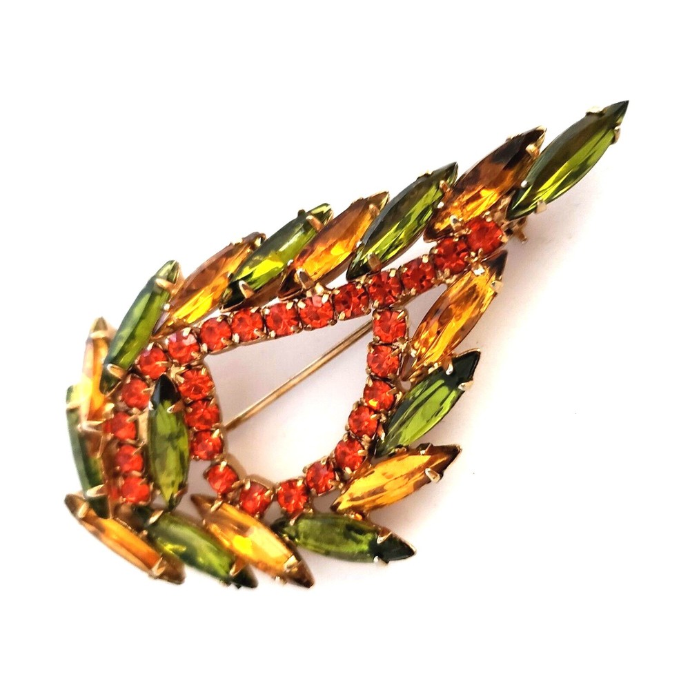 Vintage 50's/60's teardrop shaped wreath brooch in vibrant topaz, orange and green colored rhinestones. Unsigned. Beautiful topaz and green colored navettes almost look like feathers around an asymmetric center line of round cut dark orange crystals All rhinestones are prong set Closed back construction Measures approx. 2 inches tall and 2.5 inches wide Gold tone metal findings I thought this piece might be Juliana (sold to me as such) but I have not been able to verify it through my own research. It is not shown in the isitjulianajewelry database. Still and all, it is a beautiful high end piece. Another unsigned mystery!