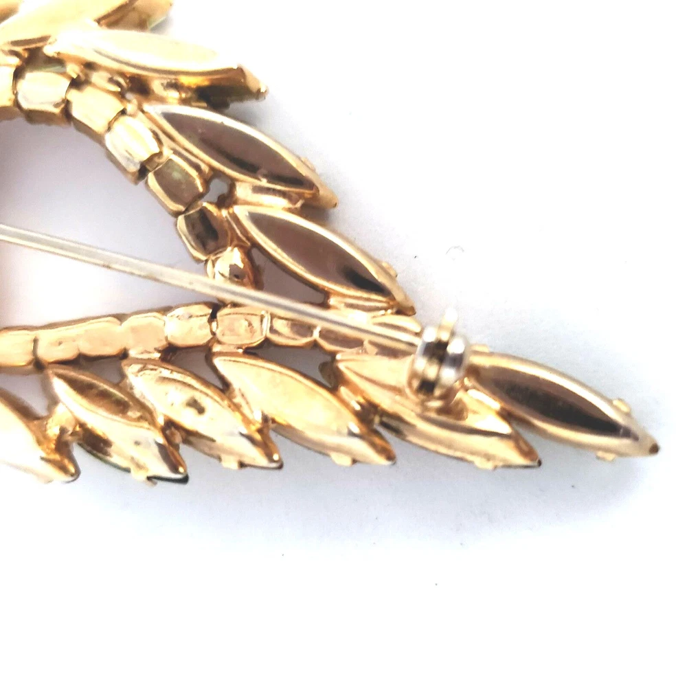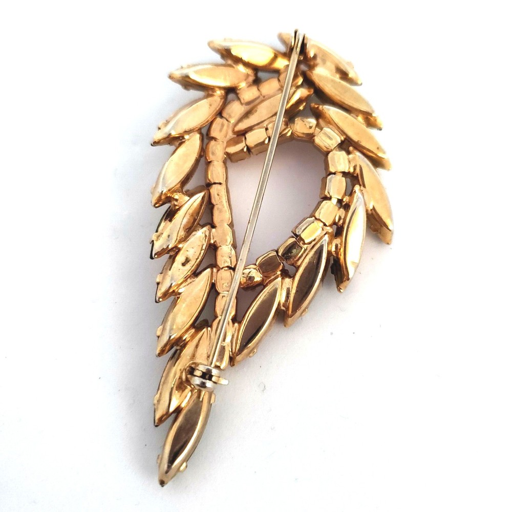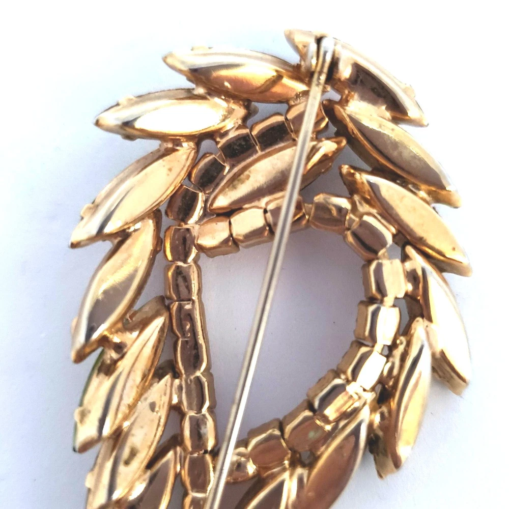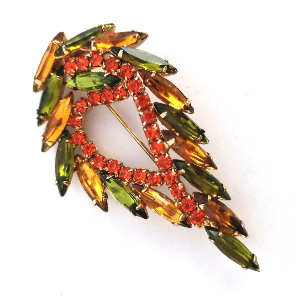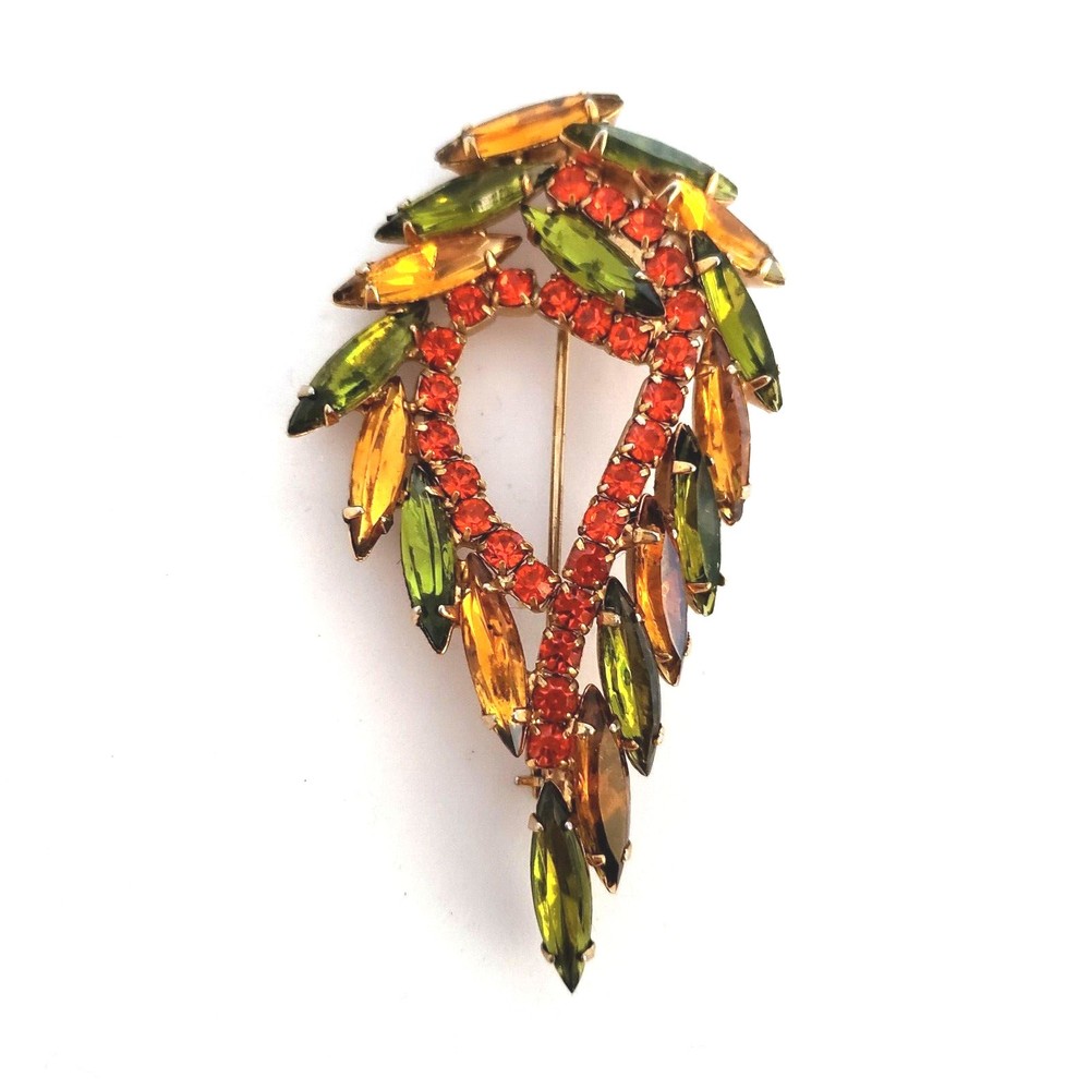 Vintage 50's/60's teardrop shaped wreath brooch in vibrant topaz, orange and green colored rhinestones. Unsigned. Beautiful topaz and green colored navettes almost look like feathers around an asymmetric center line of round cut dark orange crystals All rhinestones are prong set Closed back construction Measures approx. 2 inches tall and 2.5 inches wide Gold tone metal findings I thought this piece might be Juliana (sold to me as such) but I have not been able to verify it through my own research. It is not shown in the isitjulianajewelry database. Still and all, it is a beautiful high end piece. Another unsigned mystery!