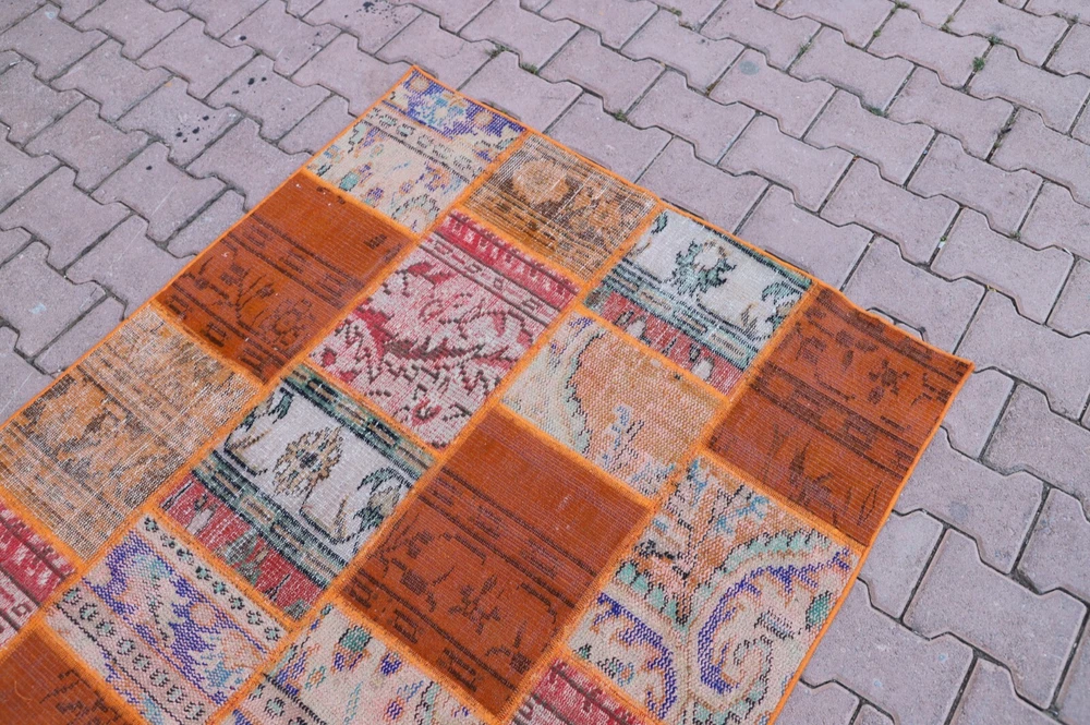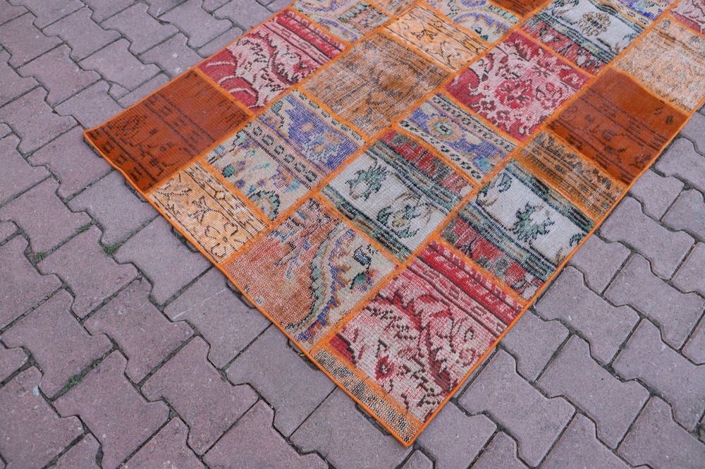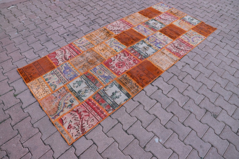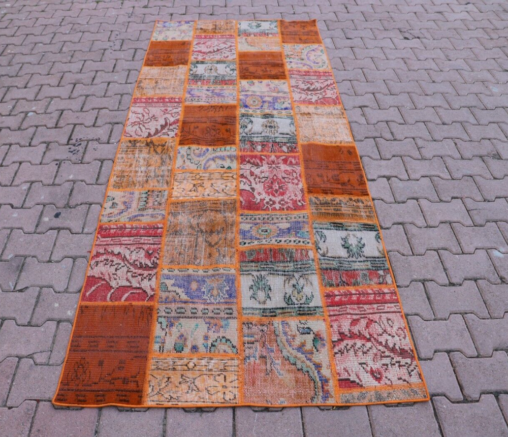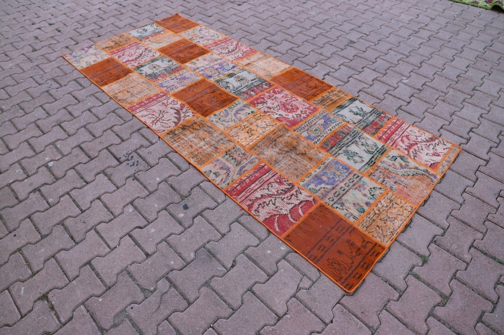 Orange Handwoven Carpet Anatolian Ethnic Vintage Wool Patchwork Large Rug Size: 3.8 x 9 ft (115 x 274 cm) 45 x 108 inches Color: Orange, Blue, Red, Green Material: 100% Hand Spun Organic Wool Condition:Professionally washed and cleaned.Ready to use. We offer only perfect rugs with no wear, stains, or odor. Perfect for an entry, kitchen, stair landing, library, bedroom, studio, loft lounge, office and living room. Fast Shipping: Delivery in 1-3 Business Days in your address. Return:The buyer is responsible for the returning shipping cost. All my rugs are vintage, handmade, village made Turkish rugs. Each one is a unique work of art and one of a kind. They are handwoven by the traditional tribes of Anatolia, Turkey. Each and every rug has an attached story with it. Don't forget to look at the other beautiful rugs of my store. Please don't hesitate to contact me if you have any questions! Thank you very much. Best Regards.