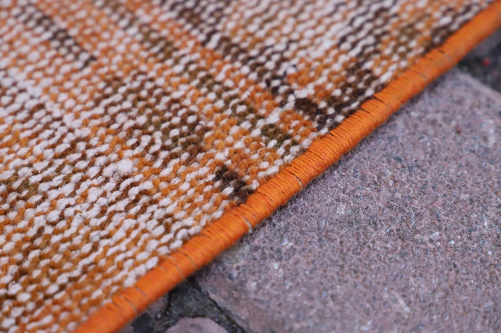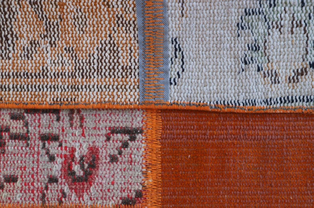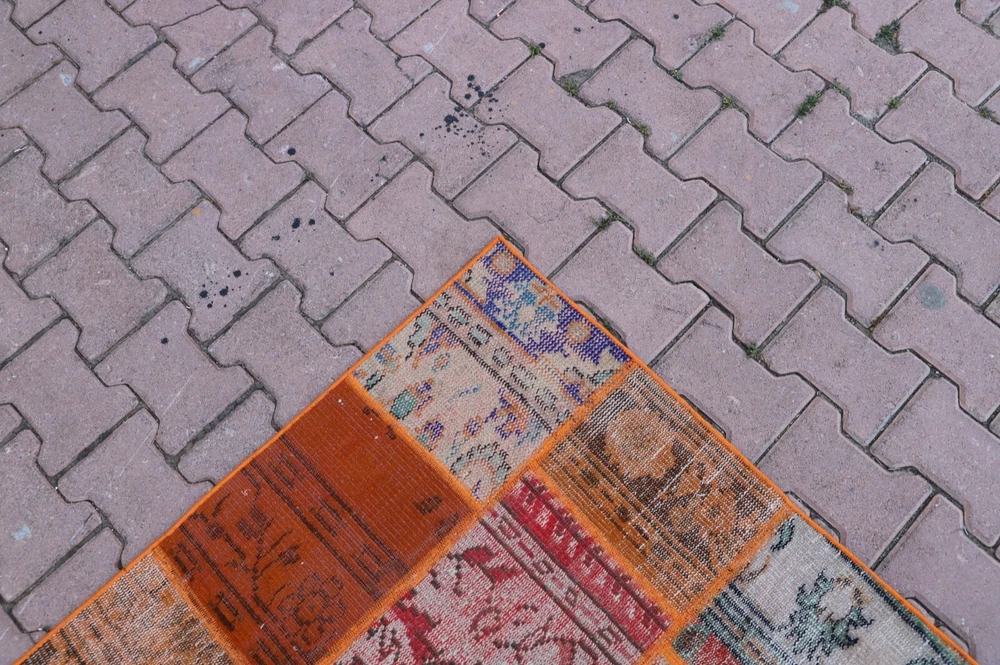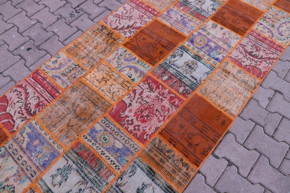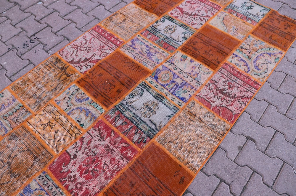 Orange Handwoven Carpet Anatolian Ethnic Vintage Wool Patchwork Large Rug Size: 3.8 x 9 ft (115 x 274 cm) 45 x 108 inches Color: Orange, Blue, Red, Green Material: 100% Hand Spun Organic Wool Condition:Professionally washed and cleaned.Ready to use. We offer only perfect rugs with no wear, stains, or odor. Perfect for an entry, kitchen, stair landing, library, bedroom, studio, loft lounge, office and living room. Fast Shipping: Delivery in 1-3 Business Days in your address. Return:The buyer is responsible for the returning shipping cost. All my rugs are vintage, handmade, village made Turkish rugs. Each one is a unique work of art and one of a kind. They are handwoven by the traditional tribes of Anatolia, Turkey. Each and every rug has an attached story with it. Don't forget to look at the other beautiful rugs of my store. Please don't hesitate to contact me if you have any questions! Thank you very much. Best Regards.