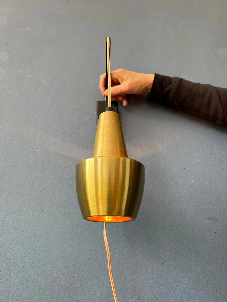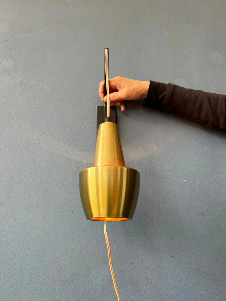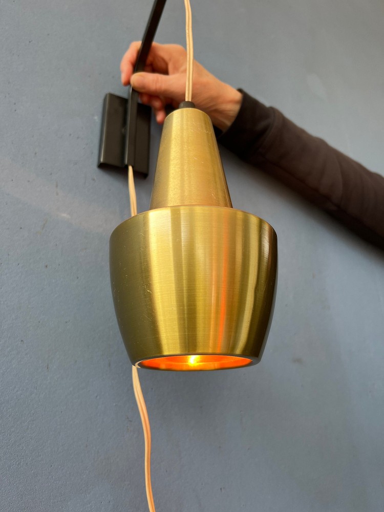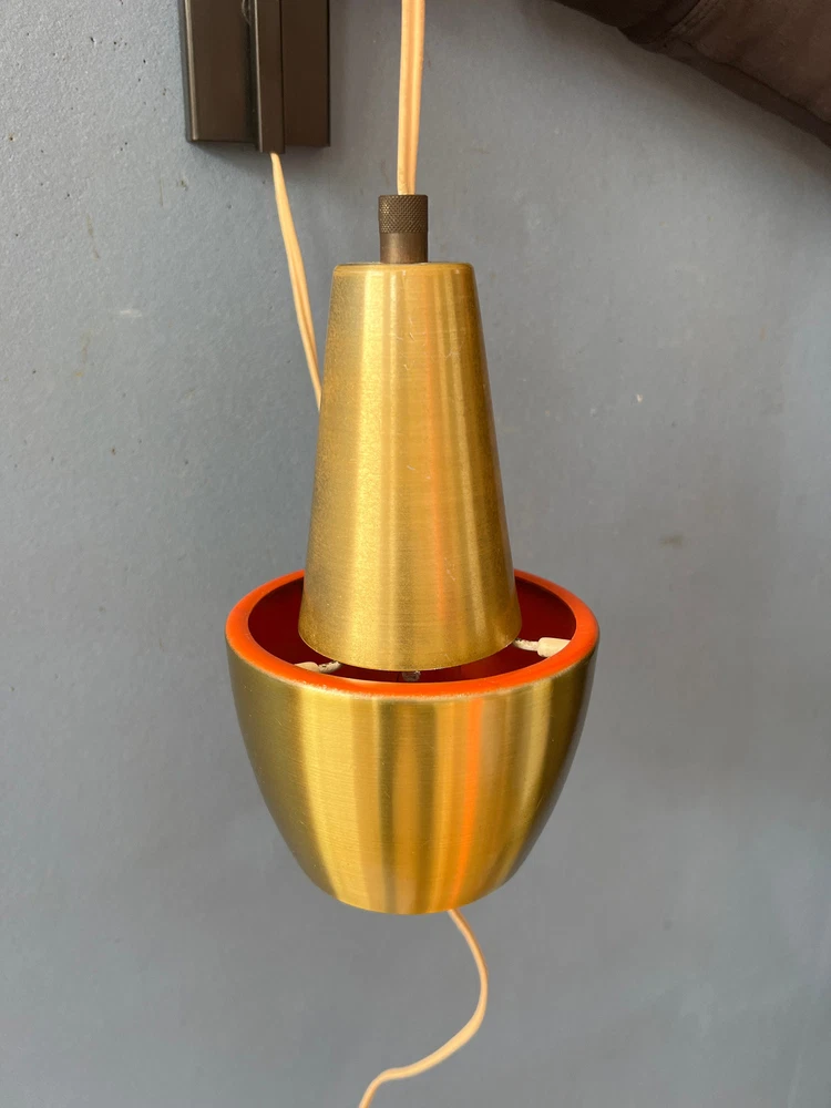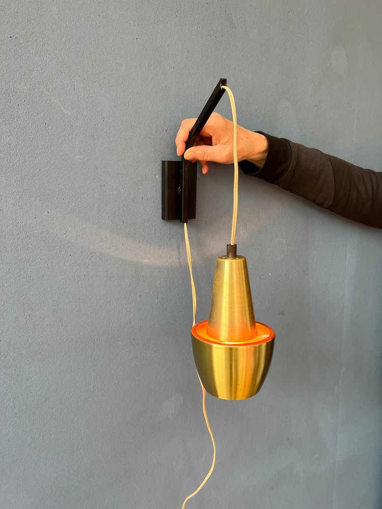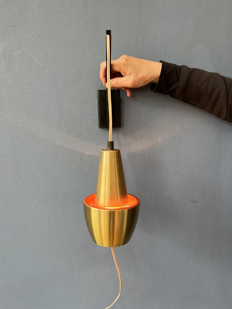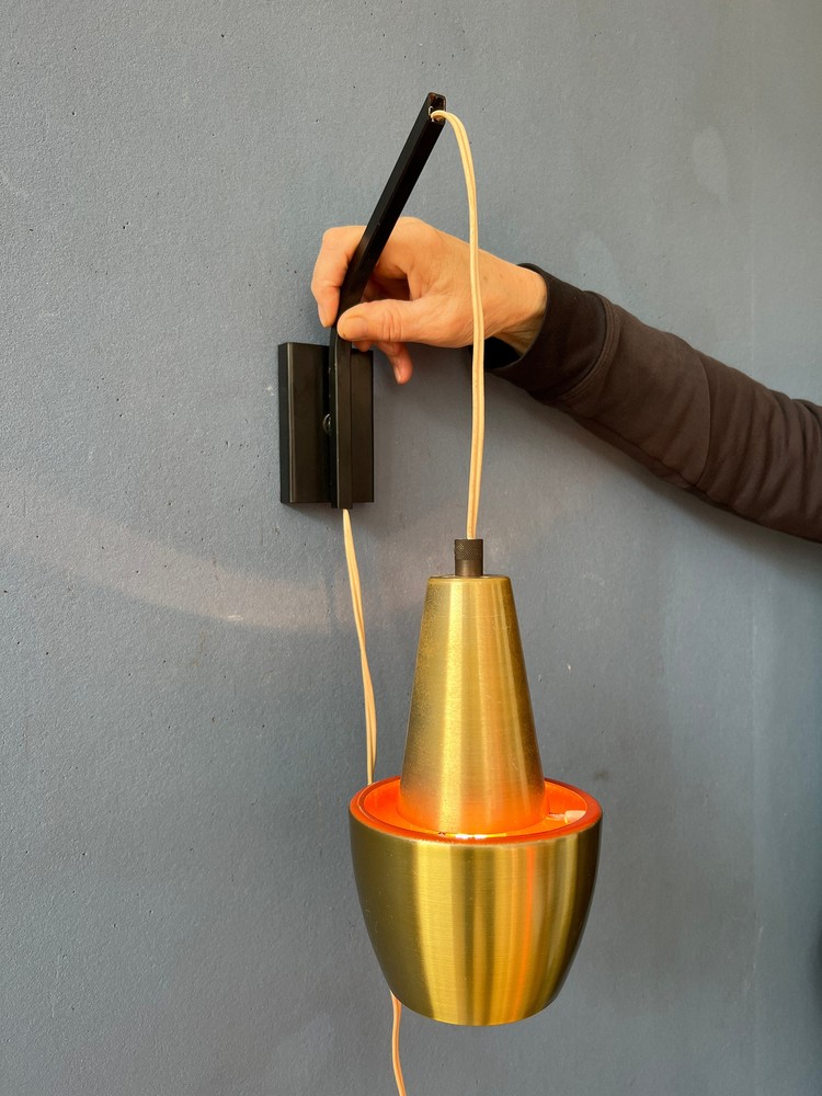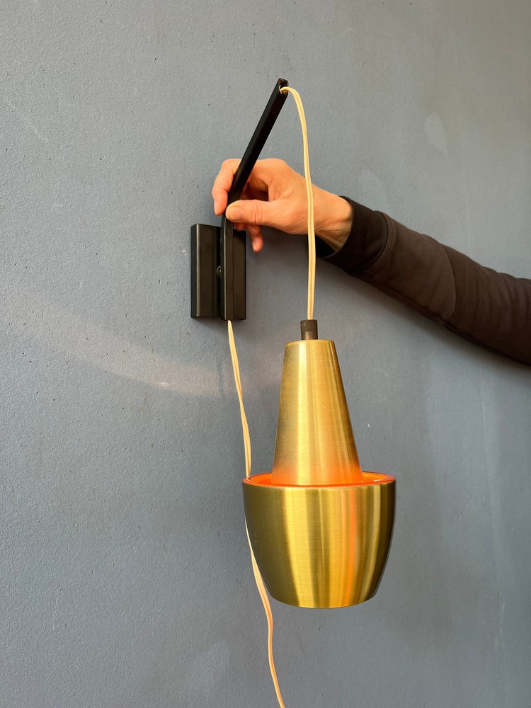 Rare Danish mid century space age rod wall lamp with orange vulcanic light. The height of the hanging shade can easily be adjusted by the pulling the wire through the wall bracket. The wall bracket is made out of metal and the shade made of aluminium. The shade has an orange lacquer from the inside. The lamp requires one E27/26 lightbulb and currently has an EU-plug. [Condition] Very good. Both the shade and wall bracket are in good condition, only very minor user-wear. [Dimensions] ø: 12 cm Height (adjustable): 37 cm [Shipping] All our products are shipped with track & trace and full insurance. We carefully pack our lamps in bubble plastic.