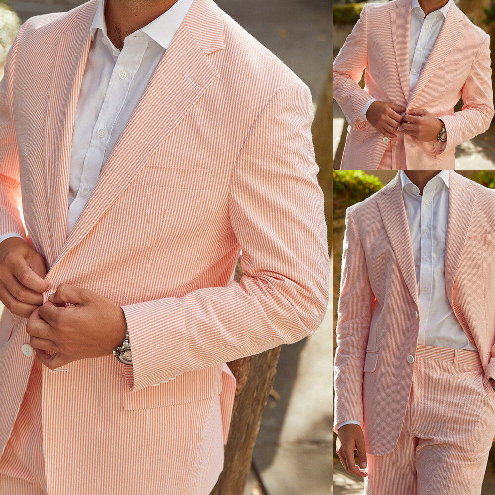 This stylish orange seersucker suit is perfect for summer weddings or casual events—lightweight, breathable, and sharp-looking! The two-piece set offers a great fit, and custom color options make it even more versatile. Fast shipping and excellent customer service ensure a smooth buying experience. Highly recommend for grooms or anyone wanting a fresh, trendy look!