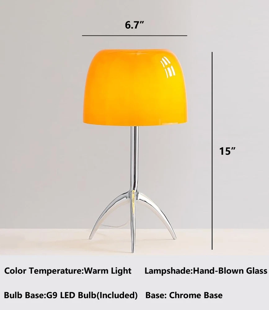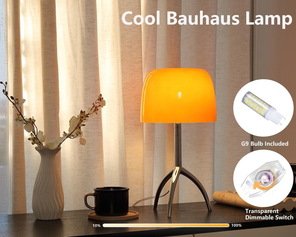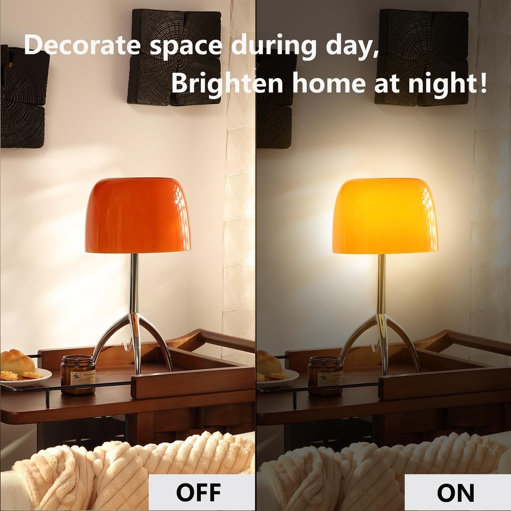 Orange Mushroom Modern Table Lamp,Unique Mid Century Modern Lamp for Bedroom,Cool Retro Bauhaus Lamp,Bedside Nightstand Donut Lamp Dimmable Lamp for Room Decor (Orange) Product Details Color: Orange Brand: Mgchayoli MPN: MCY01 UPC: Does not apply EAN: Does not apply Finish Type: Polished Base Material: Chrome Bulb Base: G9 Product Dimensions: 15"D x 6.7"W x 6.7"H Item Weight: 2.8 Pounds Product Dimensions : 15 x 6.7 x 6.7 inches; 2.8 Pounds Item model number : MCY01 Date First Available : October 3, 2024 Manufacturer : Mgchayoli Country of Origin : China Customer Reviews: 4.1 4.1 out of 5 stars 13 ratings Finish Type: Polished Base Material: Chrome Bulb Base: G9 Product Dimensions: 15"D x 6.7"W x 6.7"H Item Weight: 2.8 Pounds Lamp Type: Table Lamp Shade Color: Orange Shade Material: Glass Switch Type: In Line Style: Retro Brand: Mgchayoli Color: Orange Special Feature: 3-Way Light Source Type: LED Material: Glass, Chrome Room Type: Kids Room, Entryway, Loft, Basement, Study Room Power Source: Corded Electric Shape: Mushroom Number of Light Sources: 1 Included Components: Stand, Bulb, Power Cable, Adapter, Shade Age Range (Description): Adult Is Waterproof: False Mounting Type: Tabletop Wattage: 9 watts Number of Items: 1 Lighting Method: LED Indoor/Outdoor Usage: Indoor Specific Uses For Product: Decoration Efficiency: Moderately Efficient Voltage: 5 Volts Base Diameter: 6.2 Inches Is Cordless?: No Manufacturer: Mgchayoli Shade Height: 4.5 Inches Part Number: MCY01 Item Weight: 2.8 pounds Country of Origin: China Item model number: MCY01 Finish types: Polished Special Features: 3-Way Batteries Included?: No Batteries Required?: No Color Temperature: 2700 Kelvin Date First Available: October 3, 2024 [Bauhaus Style Table Lamp]Mgchayoli's warm vintage orange glass table lamp takes on a unique mid-century aesthetic, with a stained hand-blown glass shade and a three-legged, unique chrome base combining to form a one-of-a-kind, modern aesthetic lighting table lamp. [Infinitely Dimmable Bedside Lamp] Mgchayoli mushroom shaped bedside lamp features a warm and soft monochrome warm light bulb. It is a cool warm light lamp. The regulator is on the wire of this antique lamp, and stepless adjustment of 0-100% brightness is achieved by rotating the regulator. Whether placed in the living room, bedroom, kitchen, office, cafe, bar, showroom, also a fine home decoration. [Home decor desk lamp]This retro desk lamp features a triangular chrome base that is very sturdy and a clear colored cord that is hidden behind the base. Even without the light on, it is a timeless classic and aesthetic bedside high lamp. [Decorative lighting for gifts]This funky bedside lamp is very cute and exquisite, it can be used as a night time decorative lamp and as a holiday, birthday, Valentine's Day, Christmas, wedding gift, housewarming gift for friends, men, women and families as home decoration and lighting. [Friendly after-sales guarantee]After-sale customer service:We provide 180 days after-sale services.If the item has any defects or stopps working during warranty period,please feel free to contact us.