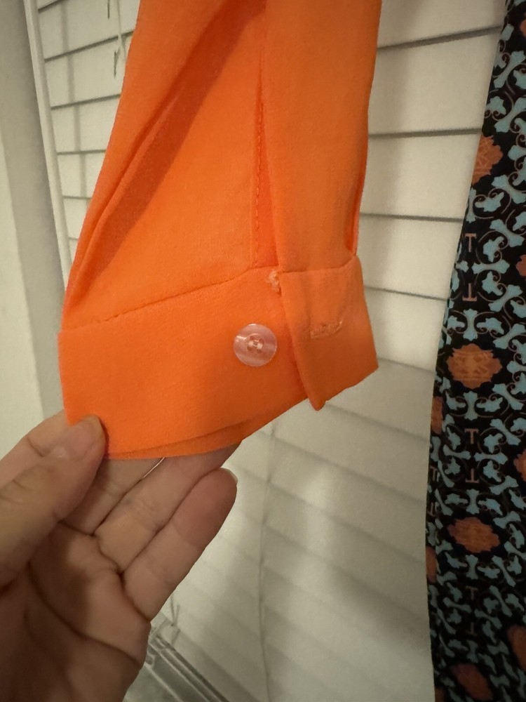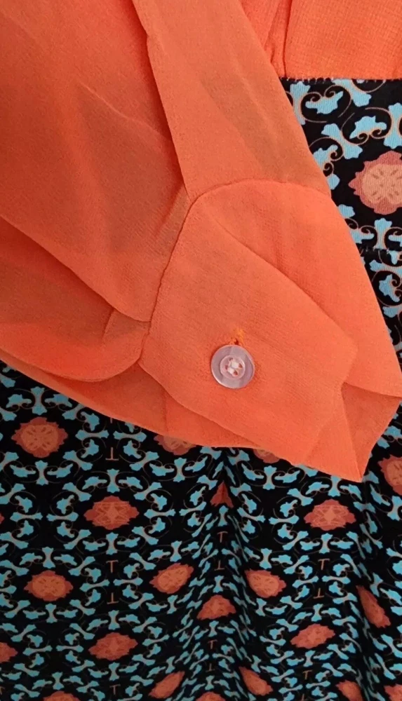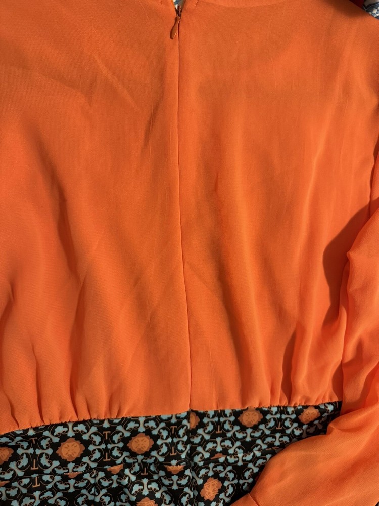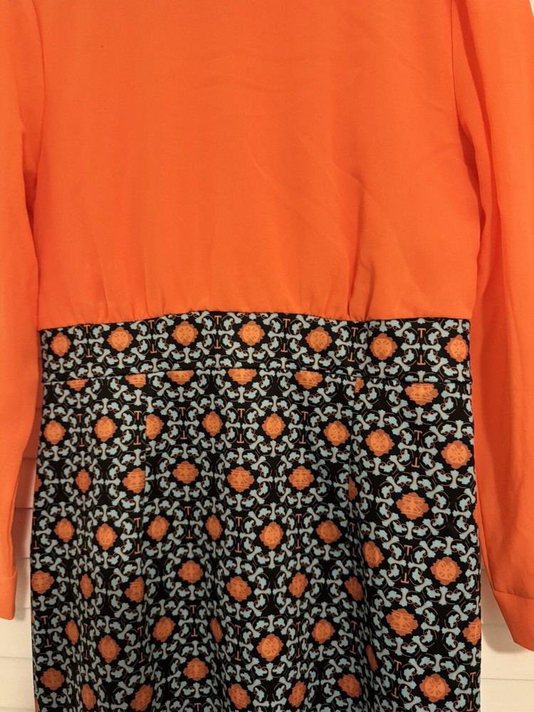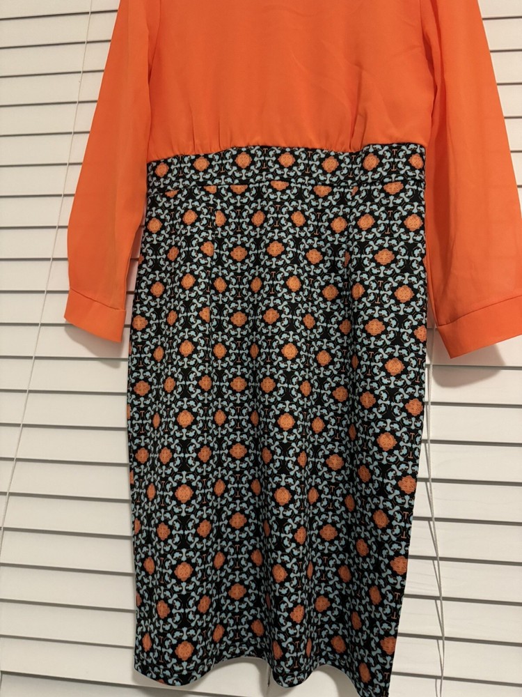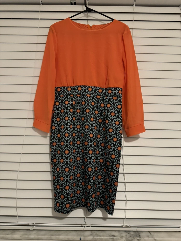 This stunning dress from OrderPlus is perfect for any occasion, whether it be a wedding, party, or business event. The dress features a beautiful orange and navy printed design with blue accents, a round neckline, and long sleeves. It is made from a comfortable and high-quality blend of polyester and spandex, ensuring both style and comfort. The knee-length pencil sheath dress is a size large, but it runs small so it is equivalent to a size 8. The garment care instructions advise that it is hand wash only. The dress also features a zipper accent for added style. Don't miss out on the opportunity to own this gorgeous dress!