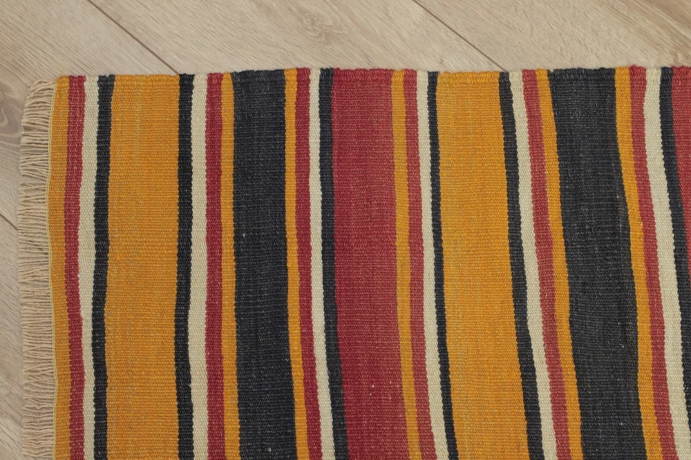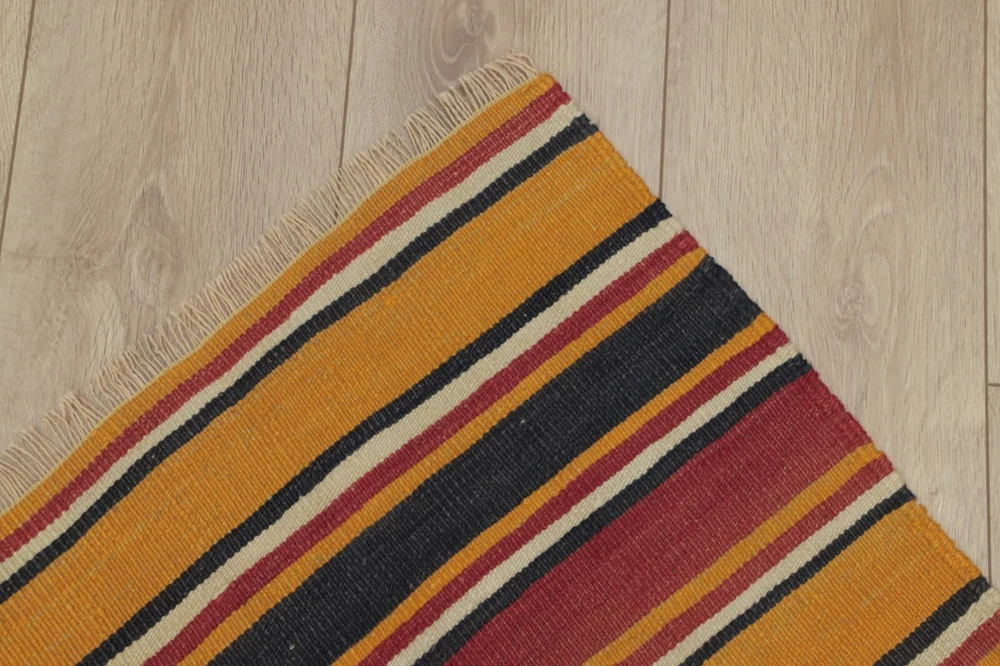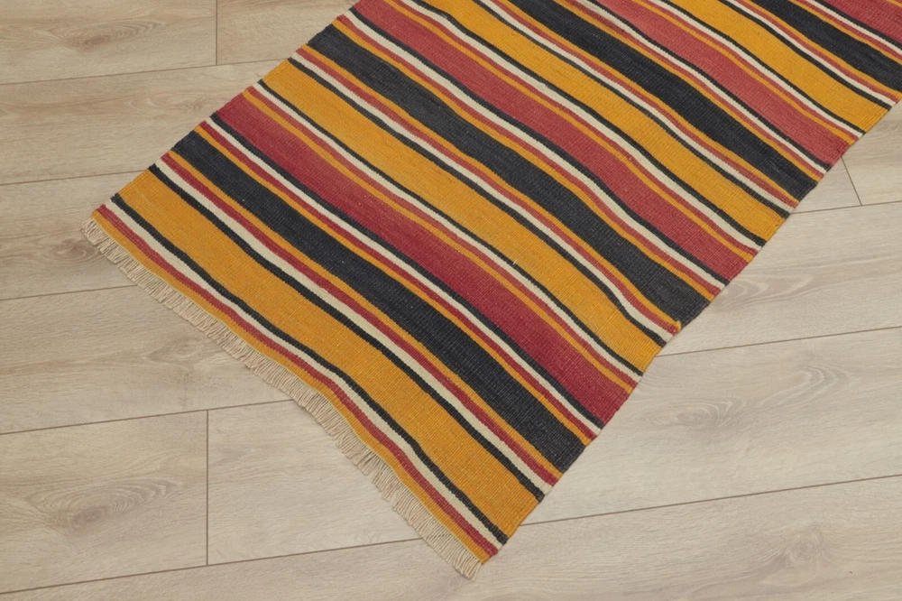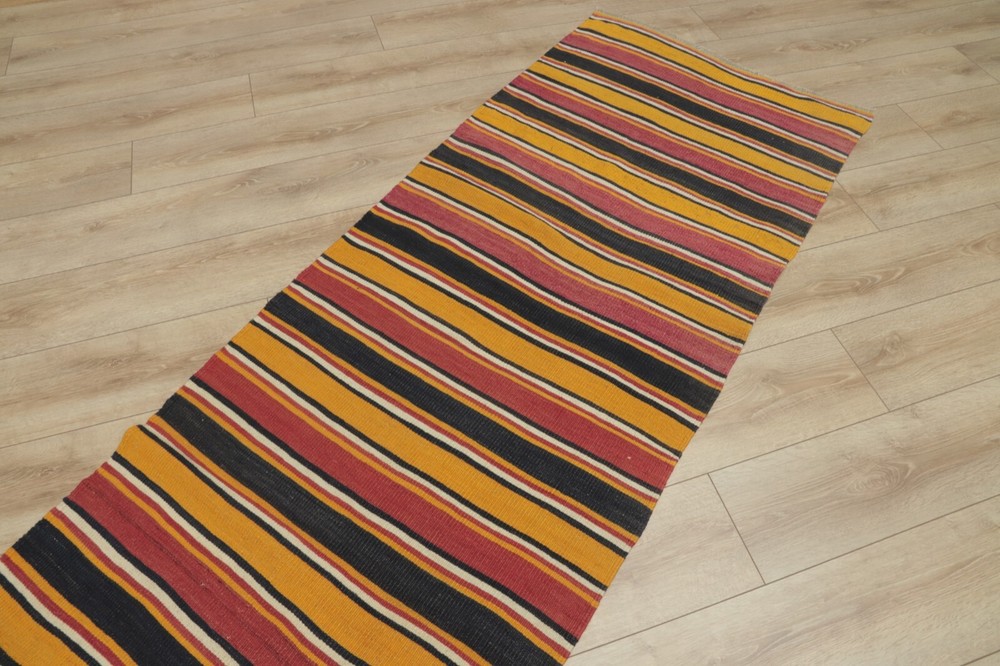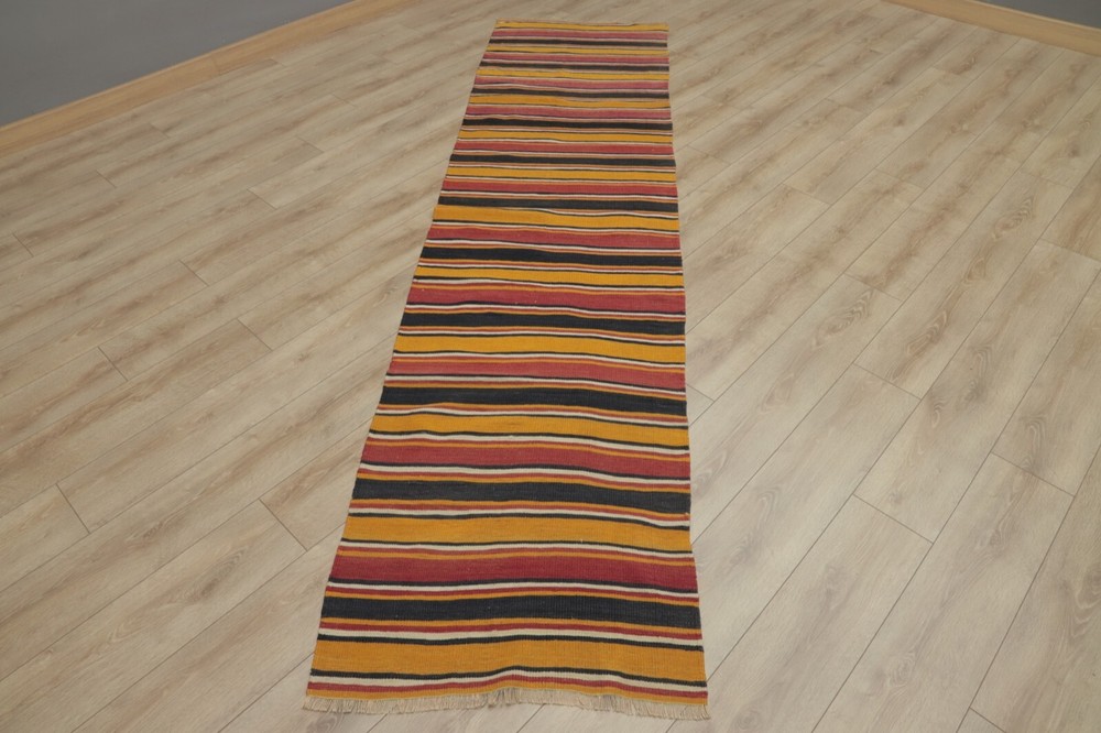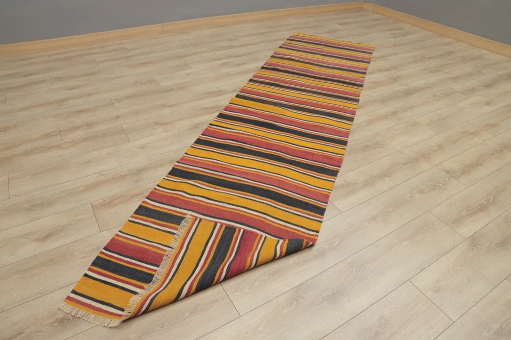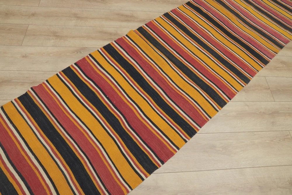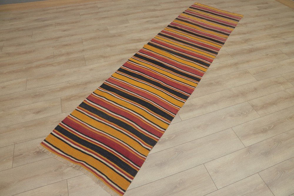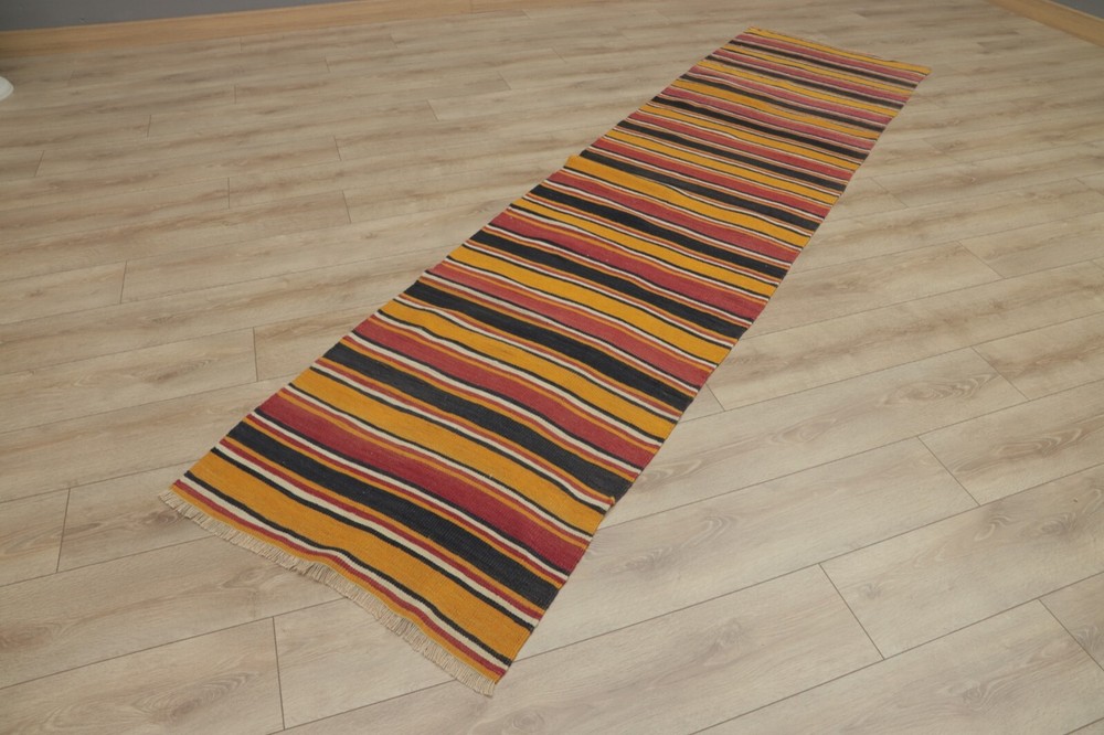 Orange Striped Kilim Runner Rug Anatolian Vintage Handmade Ethnic Carpet Size: 2.6 x 10.1 ft ( 77 x 308 cm) 30 x 121 inches Color: Organic Natural Dye ( Orange,Black,Red,White ) Material: 100% Hand Spun Organic Wool Condition:Professionally washed and cleaned.Ready to use. We offer only perfect rugs with no wear, stains, or odor. Perfect for an entry, kitchen, stair landing, library, bedroom, studio, loft lounge, office and living room. Fast Shipping: Delivery in 1-3 Business Days in your address. Return:The buyer is responsible for the returning shipping cost. All my rugs are vintage, handmade, village made Turkish rugs. Each one is a unique work of art and one of a kind. They are handwoven by the traditional tribes of Anatolia, Turkey. Each and every rug has an attached story with it. Don't forget to look at the other beautiful rugs of my store. Please don't hesitate to contact me if you have any questions! Thank you very much. Best Regards.