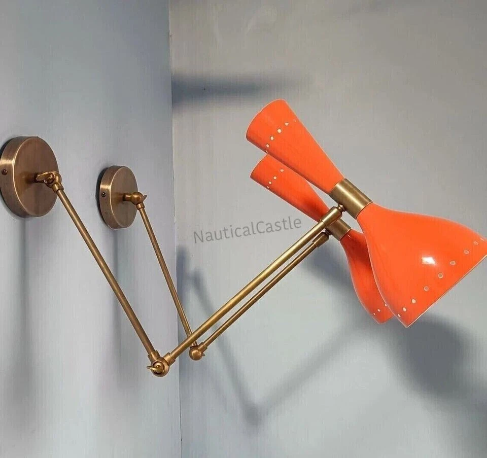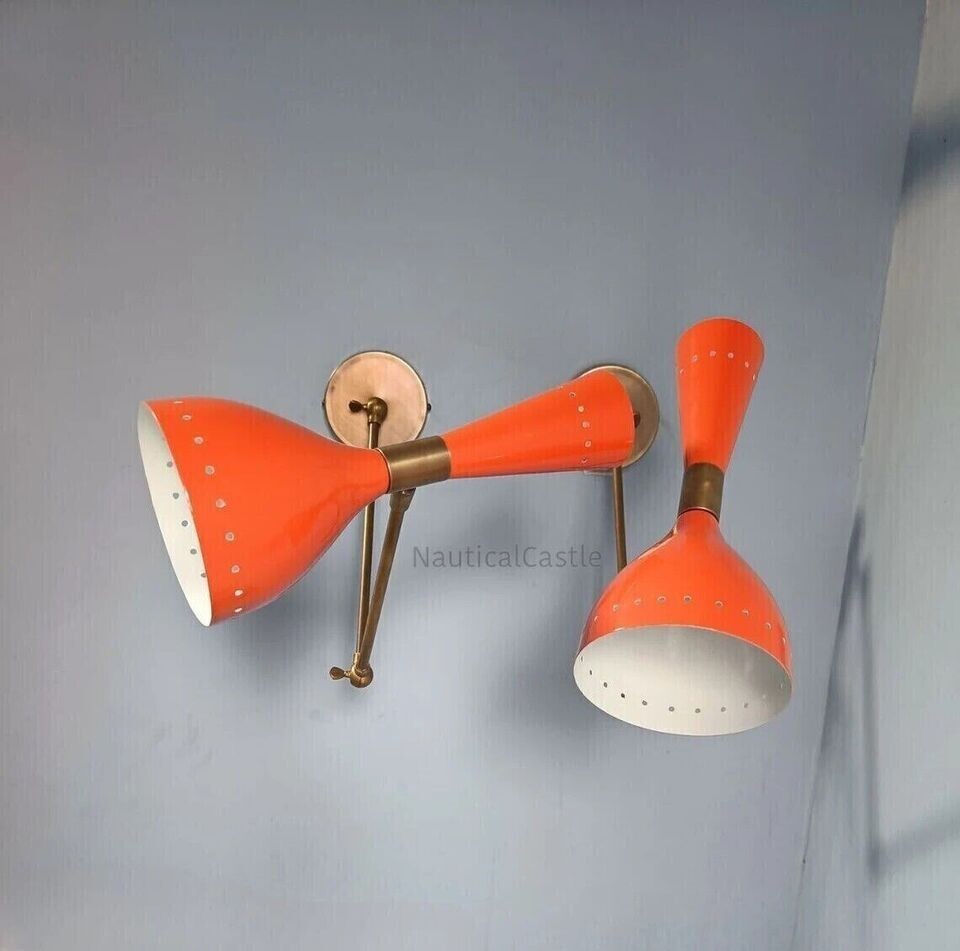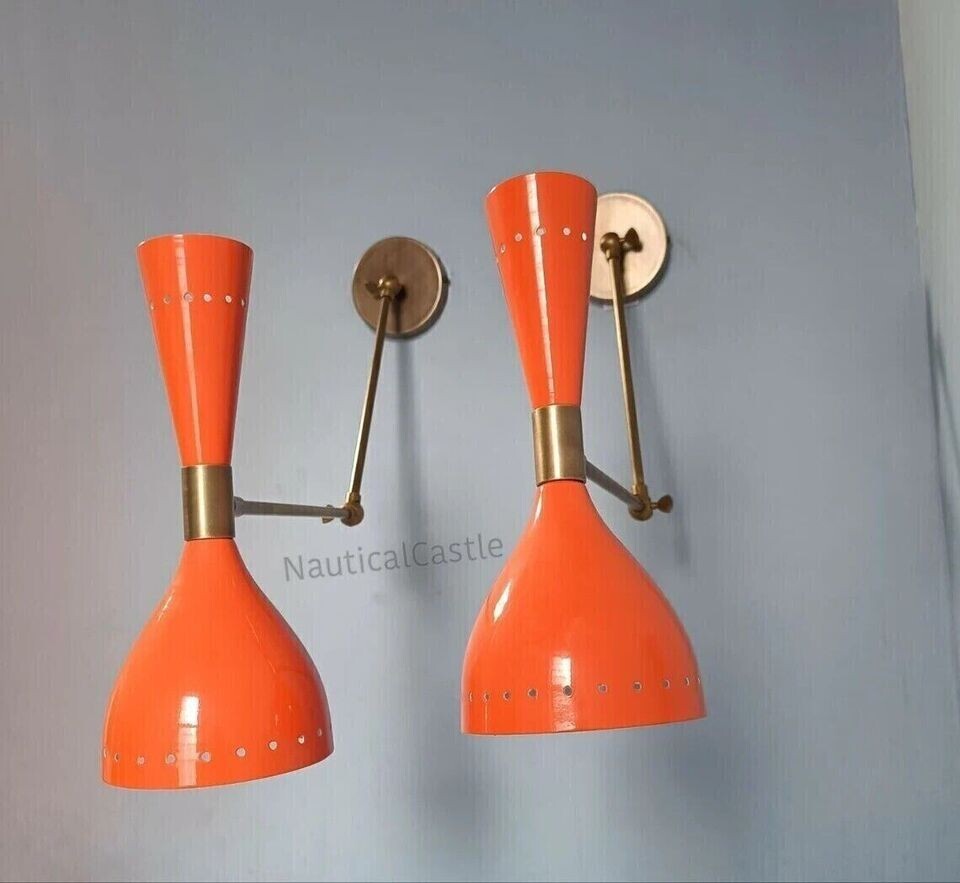 Wall Sconce Diabolo Pair of Two Modern Italian Wall Lights Black & White Wall Fixture Light . This is Stilnovo Style light fixture is made with UL approved parts. It has 1 arms/lights and measures 5" in diameter without light bulbs. It uses standard sconce socket light bulbs. We recommend 15W to 40W max. Light bulbs are not included. Wall canopy can be adjustable at different angles so you can mount this sconce. We hand craft all of our light fixtures. This chandelier has been made with brass material. Minor variations in finish are an inherent characteristic of such material and add to the beauty and uniqueness of the product. PRODUCT SPECIFICATIONS: • Premium quality mid-century Wall Fixture. • Made of pure brass brass shiny finish . other brass finishes are available at request. • Measurements is :L x 10.5 inch B x 5'' inch H x 8'' inch Wall canopy To Light Socket Edge • Set of Two Diabolo Wall Fixture • Orange, Brass, Glass Finish • Wall Fixture used standard sconce E-12 or E-14 light bulbs. (not included) • Canopy 4 Inches • This Is Reproduction Production Not Sold Antique. MATERIALS: • Brass And Iron • All Components are UL approved. BULB TYPE: • Requires Four (4) 15 watt bulb type A (not included). • E-12 or E-14 socket Rated with 125 voltage, 75 watt max. • 7 watt to 15 watt bulbs are recommended. • These Wall Sconce Use Incandescent Bulbs, Energy Saying, LED Bulbs.
