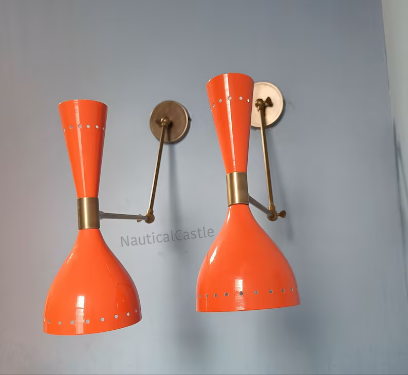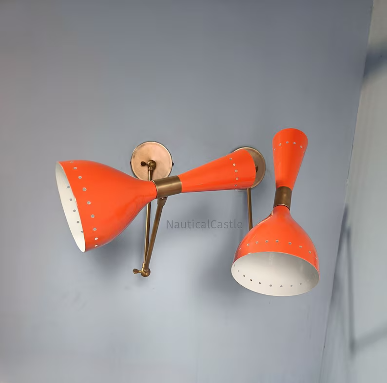 Width: 5 inches Height: 10.50 inches Depth: 8 inches Wall Sconce Diabolo Pair of Modern Italian Wall Lights Orange Wall Fixture Lamps. PRODUCT DETAILS:- Wall Sconce Diabolo Pair of Two Modern Italian Wall Lights Black & White Wall Fixture Light . This is Stilnovo Style light fixture is made with UL approved parts. It has 1 arms/lights and measures 5" in diameter without light bulbs. It uses standard sconce socket light bulbs. We recommend 15W to 40W max. Light bulbs are not included. Wall canopy can be adjustable at different angles so you can mount this sconce. We hand craft all of our light fixtures. This chandelier has been made with brass material. Minor variations in finish are an inherent characteristic of such material and add to the beauty and uniqueness of the product. PRODUCT SPECIFICATIONS: • Premium quality mid-century Wall Fixture. • Made of pure brass brass shiny finish . other brass finishes are available at request. • Measurements is :L x 10.5 inch B x 5'' inch H x 8'' inch Wall canopy To Light Socket Edge • Set of Two Diabolo Wall Fixture • Orange, Brass, Glass Finish • Wall Fixture used standard sconce E-12 or E-14 light bulbs. (not included) • Canopy 4 Inches • This Is Reproduction Production Not Sold Antique. MATERIALS: • Brass And Iron • All Components are UL approved. BULB TYPE: • Requires Four (4) 15 watt bulb type A (not included). • E-12 or E-14 socket Rated with 125 voltage, 75 watt max. • 7 watt to 15 watt bulbs are recommended. • These Wall Sconce Use Incandescent Bulbs, Energy Saying, LED Bulbs.