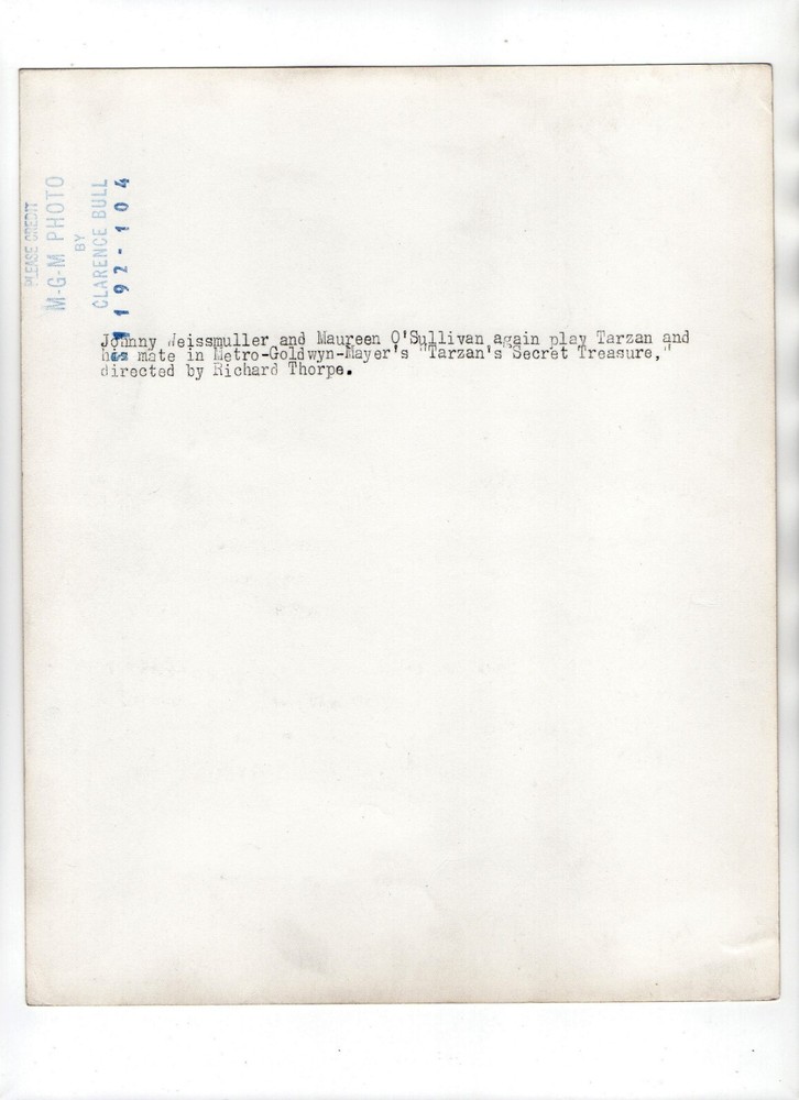 This is a RARE ORIGINAL 8 x 10 inch DOUBLE WEIGHT publicity portrait of co-stars, JOHNNY WEISSMULLER as Tarzan and MAUREEN O’SULLIVAN as Jane in costume as Edgar Rice Burroughs romantic duo in MGM’s 1941 film, “TARZAN’S SECRET TREASURE”. Portrait by CLARENCE SINCLAIR BULL. Well Documented Photo! The photo is Semi-Gloss Finish and in VERY FINE to EXCELLENT condition with minor wear. Absolutely Gorgeous! There are no tariffs/duties on comic books or vintage Hollywood photographs, negatives and slides. I do combine shipping on multiple items. Shipping in Canada and the USA is 12.00. (I take my packaging and shipping very seriously, see my feedback) I will also ship Internationally, Tracked Packet-International for 40.00. Payment is due within 3 days of auction ending. Please Note: I do not make money on shipping charges and will refund the difference.