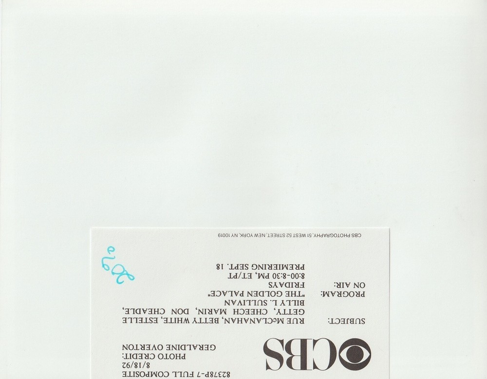 Here's an original 7 x 9" publicity photo of Rue McClanahan, Betty White, Estelle Getty, Cheech Marin, Don Cheadle, and Billy L. Sullivan in the tv show, The Golden Palace. Photo is dated 8-18-92. What you see in the picture is a scan of the actual photo. This is being sold strictly as a collectors' item from one collector to another and no rights are transferred or implied. Photos are shipped in a sturdy weatherproof photo mailer for extra protection. THIS IS A USED PRESS PHOTO AND IS SOLD AS-IS. The word CELLULOIDMEMORIES will not appear on the actual photo. Photo has a tiny indentation and minor wear on the image. There are small bends and minor wear at the corners and edges. This is from a smoke-free environment.