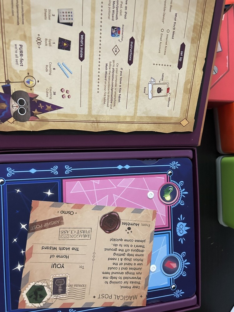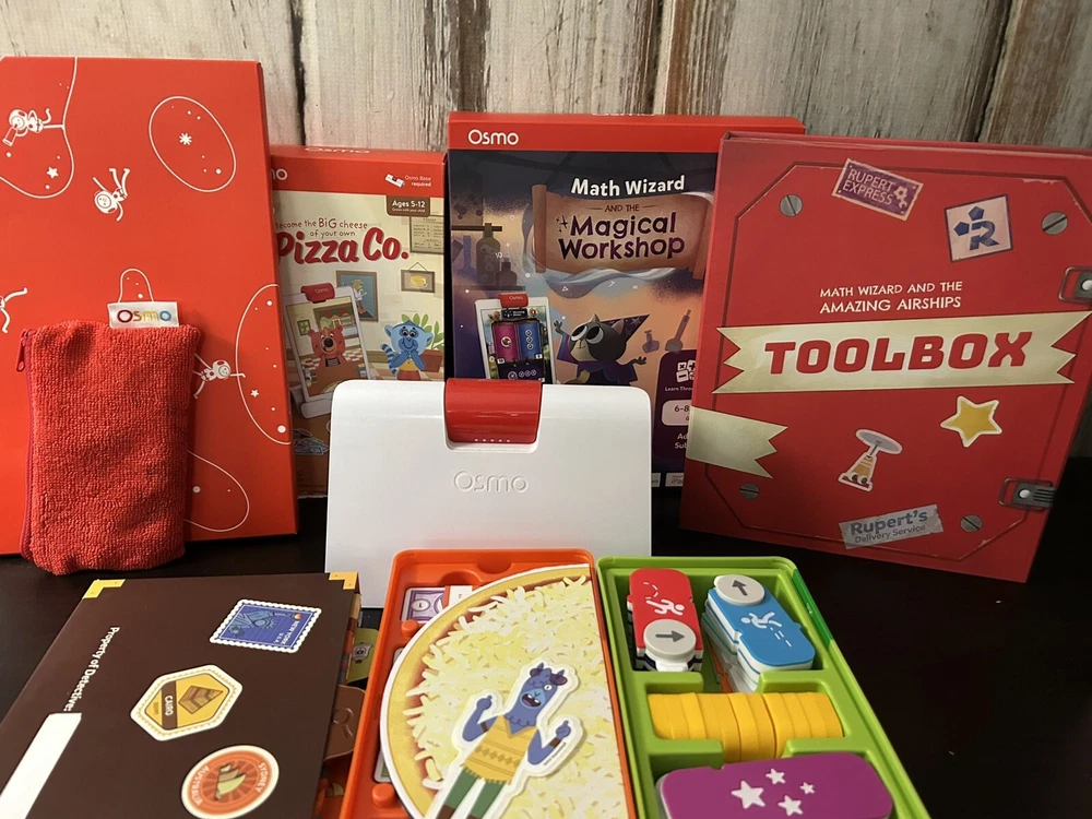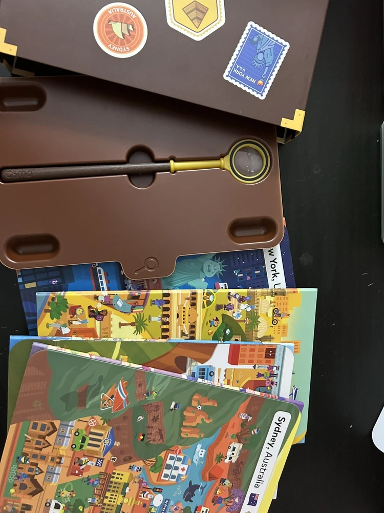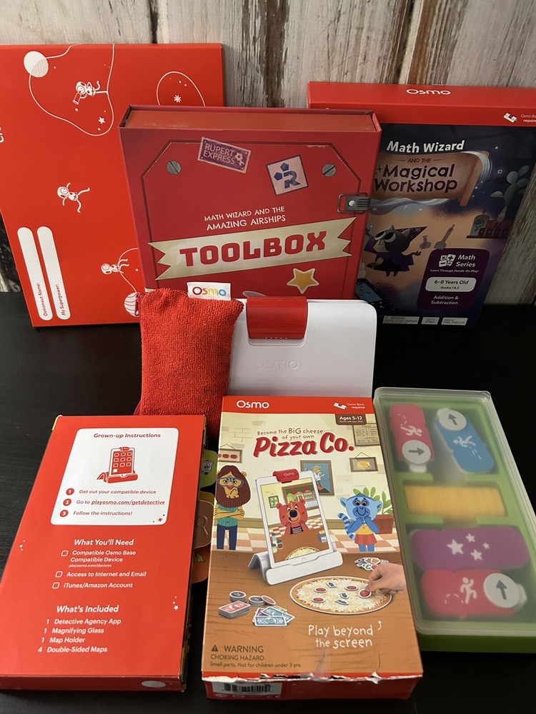 Good used condition. Includes base for Kindle Fire, Magical Wizard Math Workshop, Pizza Co, Creative Board w/Markers, Coding, Detective Agency. Pizza and Magical Workshop have their original boxes but Pizza one shows rips and wear. See photos.