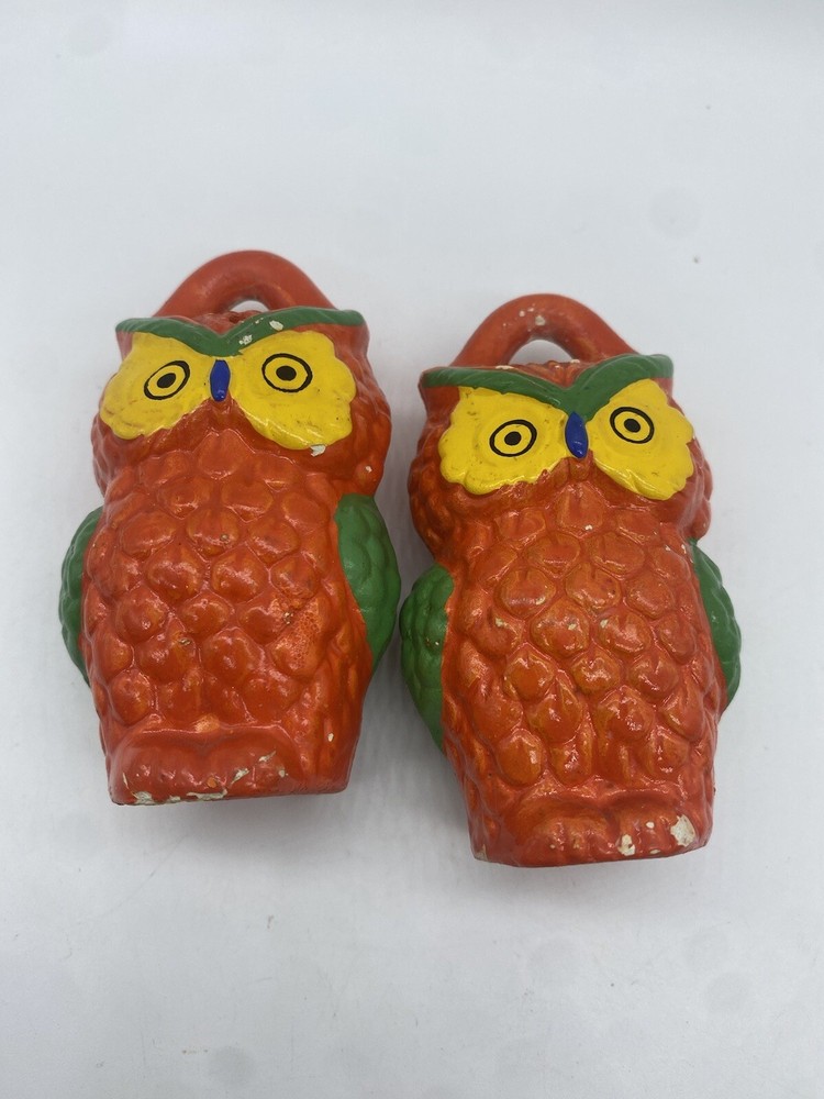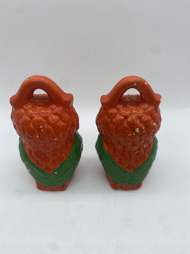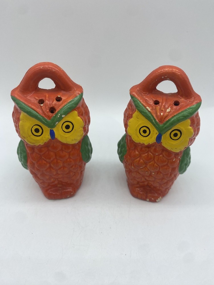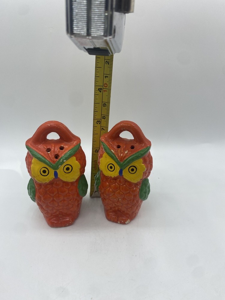 Add a touch of retro charm to your kitchen with this adorable set of Owl Bird Salt and Pepper Shakers. Made from ceramic, this set includes a Pepper Shaker and a Salt Shaker, both measuring 3 inches in width. The shakers are designed in the shape of an Owl, featuring a bright yellow color with orange and green accents, perfect for adding a pop of color to your dining table. These shakers are perfect for collectors or those who simply enjoy quirky kitchen accessories. The set is ideal for a retro theme or anyone who loves animation. So why wait? Add this charming set to your collection today! Some chipping see pictures
