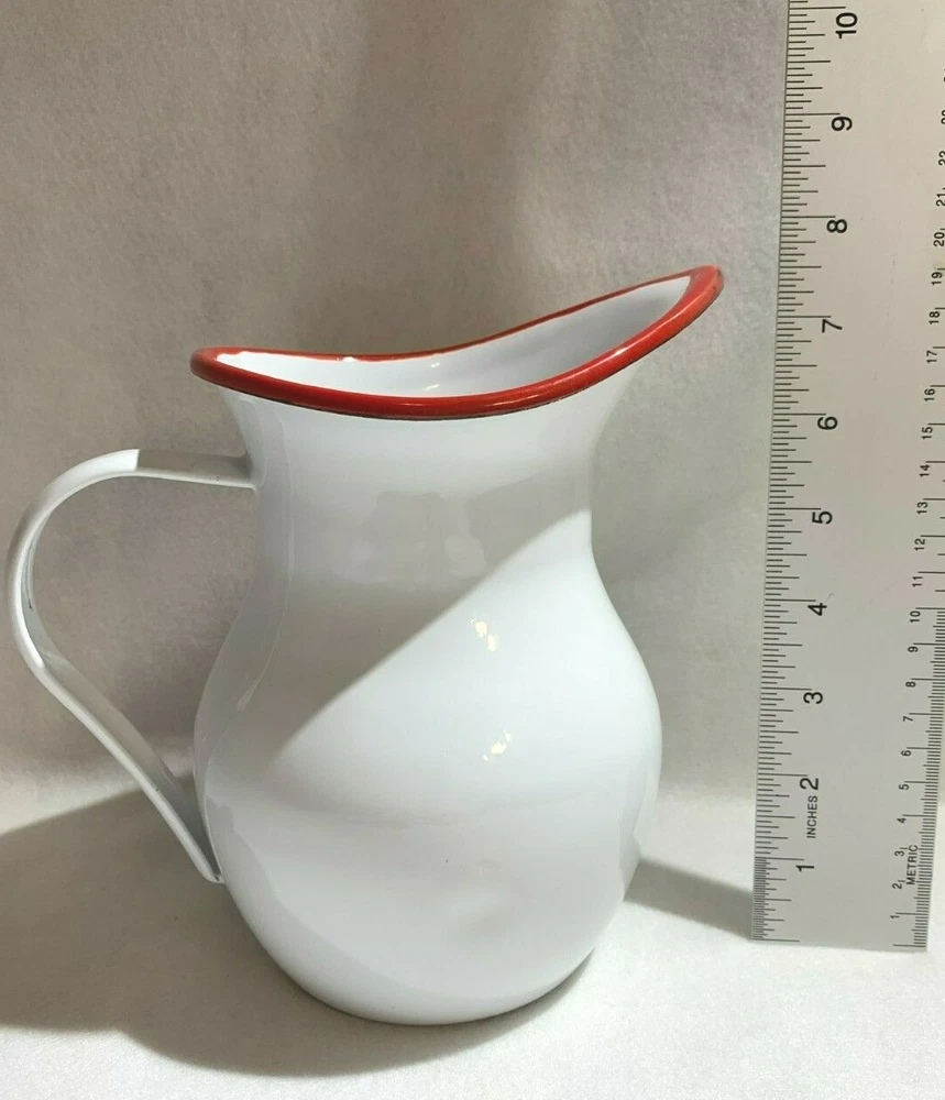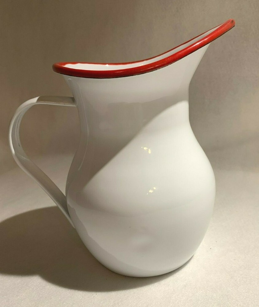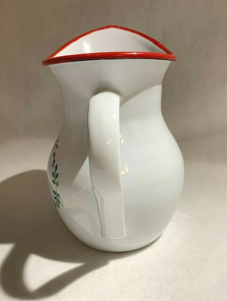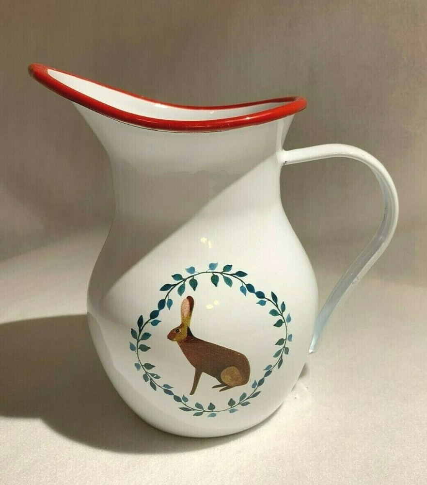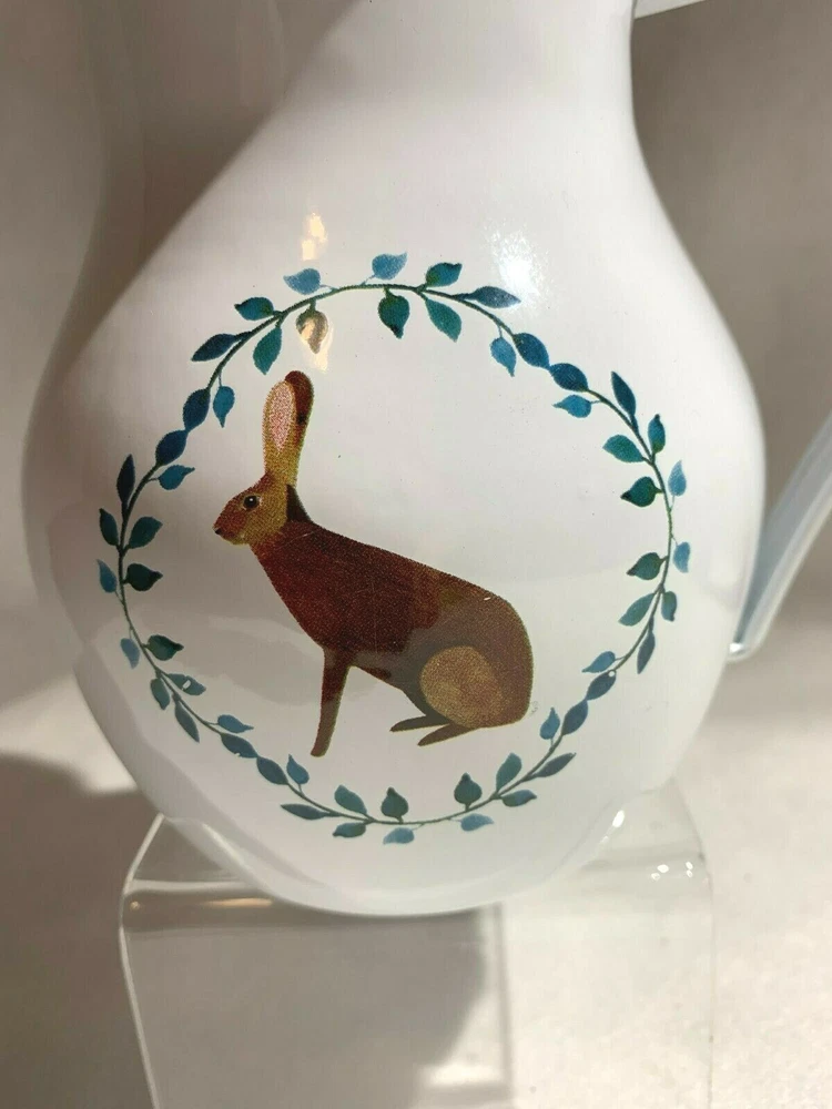This unique pitcher with a charming rabbit decoration is a must-have for any kitchen. It is made of high-quality enameled metal ware and is hard to find. The pitcher is perfect for serving your favorite beverage, and the white and multi-color design will complement any home decor. The brand behind this beautiful piece is Creative Co-Op, a trusted name in the industry. The pitcher is ideal for use during dinner parties or gatherings, but is a fantastic decorative item and its sturdy construction ensures that it will last for years to come. The material is metal, which gives it a durable and long-lasting quality. This pitcher is a great addition to any collection and is sure to be a conversation starter. Please examine all photos before purchase. Item is not new. This is a found item, Seller does not know the exact origin of the piece.