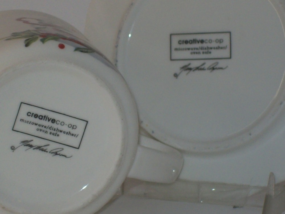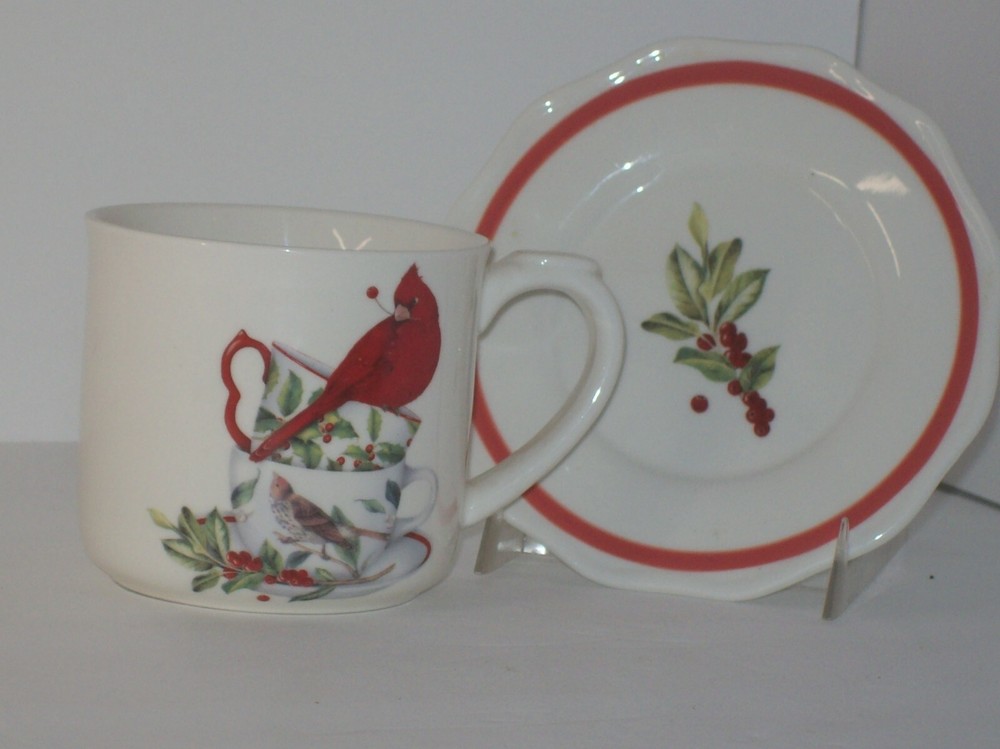 PORCELAIN CUP AND SAUCER WITH A CARDINAL DESIGN ON CUP AND HOLLY AND BERRIES ON THE SAUCER BY CREATIVE CO-OP. BOTH THE CUP AND SAUCER ARE IN EXCELLENT CONDITION NO CHIPS OR CRACKS. THEY ARE OVEN, MICROWAVE AND DISHWASHER SAFE. THEY MEASURES APPROXIMATELY - SAUCER - 5.5 INCHES IN DIAMETER CUP- 3.25 INCHES TALL, 3.75 INCHES DIAMETER AND RIM TO HANDLE 4.75 INCHES. PLEASE ASK ANY QUESTIONS YOU MAY HAVE. THANK YOU FOR STOPPING PS. VISIT MY STORE, :SMYLIN' DOG TREASURES" AND DISCOVER EVEN MORE GEMS.