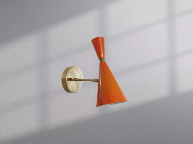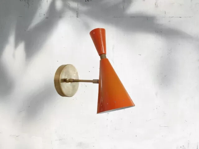 Note : Set Of 2 Pices Note- ANY MODEL OF LIGHT CAN BE CUSTOMIZE AS PER BUYER NEEDS No Extra Cost for Colour Customisation - Premium quality Diabolo Wall Sconce. - Made of pure brass. light in the Pictures are in Raw Brass Finish-other brass finishes & Sconce Colour are available at request. -Measurements is : L x 10.5 inch B x 5'' inch H x 8'' inch Ceiling Wall canopy To Light Socket Edge, For more clarity on Size Kindly go through the images. Product Specifications: - 1 Arms 1 Light wall fixture - Raw Brass & Sconce is in Orange Color Finish - Canopy 5''inch - Reproduction *Illumination:** Experience warm and inviting illumination with the Modern Diabola lamps. The opal glass shades diffuse light evenly, casting a soft and ambient glow that transforms your space into a welcoming haven. Whether used as a focal point in your living room or as bedside lighting, these lamps bring a touch of sophistication to any setting. *Installation:** Setting up your new lighting is a breeze with our user-friendly installation instructions. The lamps come with all the necessary hardware, ensuring a hassle-free and enjoyable process. **Adjustable Features:** Versatility meets functionality with the adjustable features of our Diabola lamps. The swiveling shades and adjustable height allow you to customize the lighting according to your preferences, providing both style and adaptability for various settings. *Materials:** Our lamps are constructed using high-quality materials that ensure durability and style. The combination of premium metal finishes, such as Raw brass or matte black, with opal glass shades creates a luxurious yet understated look. The choice of materials reflects our commitment to both aesthetics and functionality. Standard candelabra E26/E27 light bulbs used this chandelier. (not included). Bulb Type Require 1 lamps (not included) 110-120 voltage, 50watt max With E26 socket rated. (US). 220-230 voltage, 50 watt max With E27 socket rated. (Europe) Recommended bulbs are 7 watt to 15 watt. Halogen Bulbs or LED Bulbs. VISIT OUR SHOP FOR MORE BEAUTIFUL WALL SCONCES: