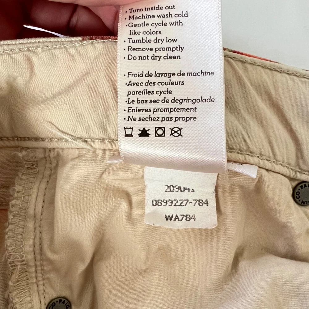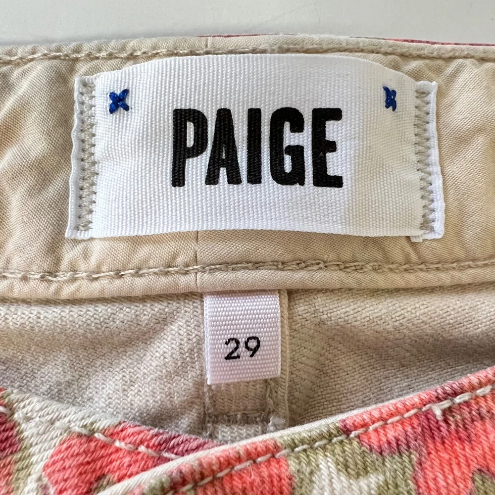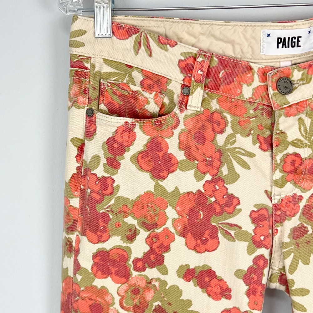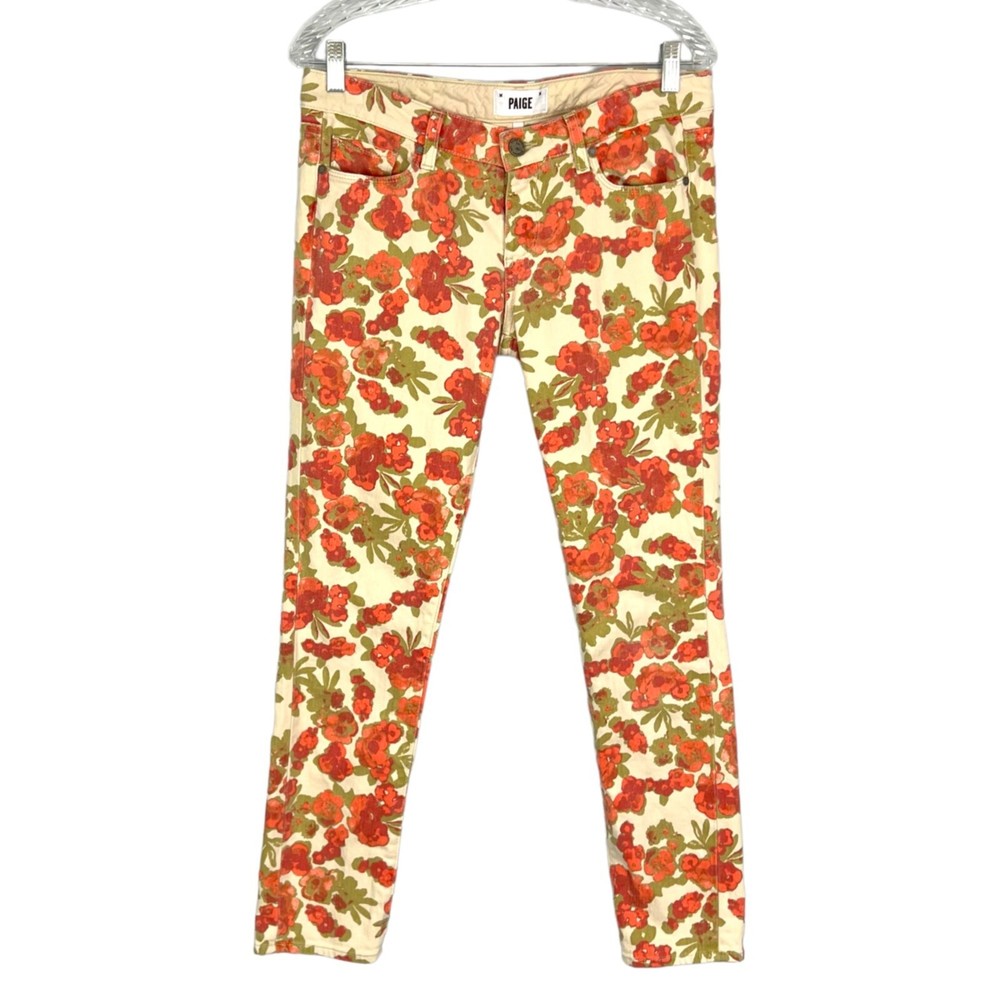 Paige orange floral skyline ankle peg skinny jeans, size 29 - cream / off white with orange floral print - skinny leg - cropped ankle length - mid rise - front zip and button closure - 5 pocket style - cotton, elastane Very good preowned condition Approx measurements (flat) Inseam 29” Rise 8” Waist 15.75” Style profile: business casual dressy chic trendy weekend vacation outdoors date night concert festival every day denim comfortable comfy fresh trendy chic college school country basic boho bohemian
