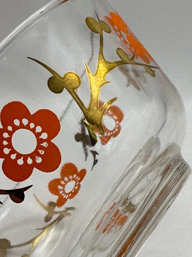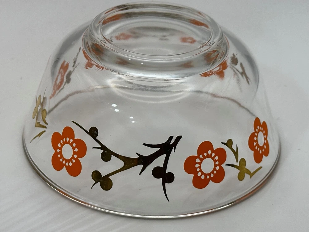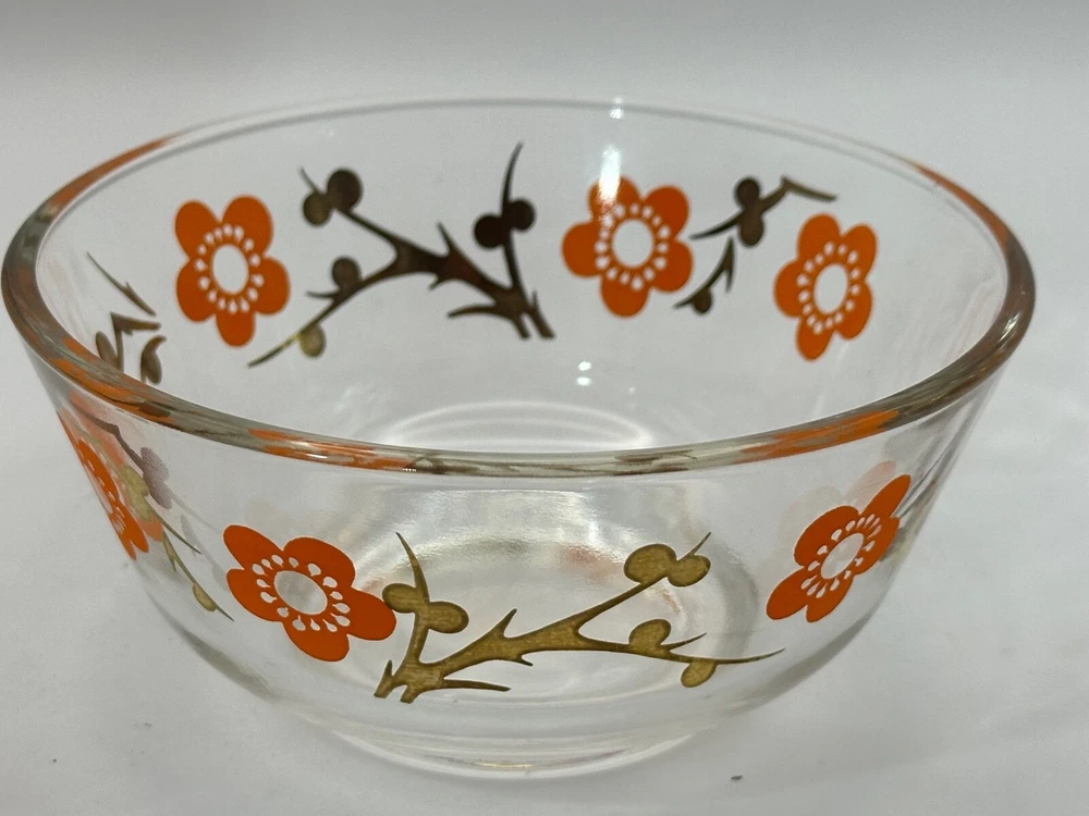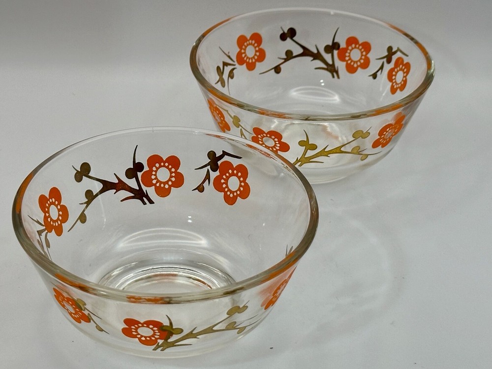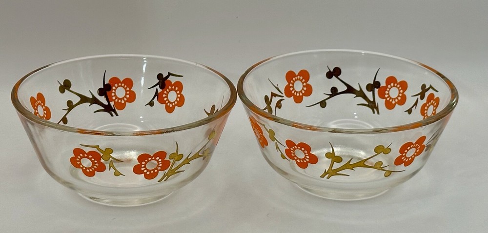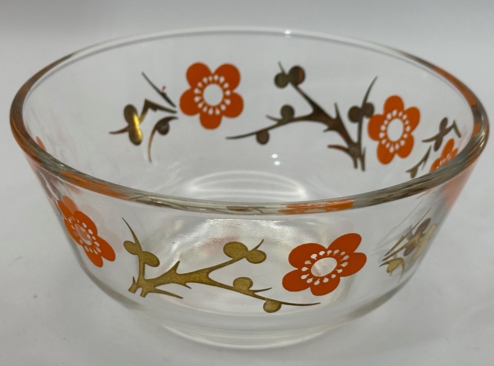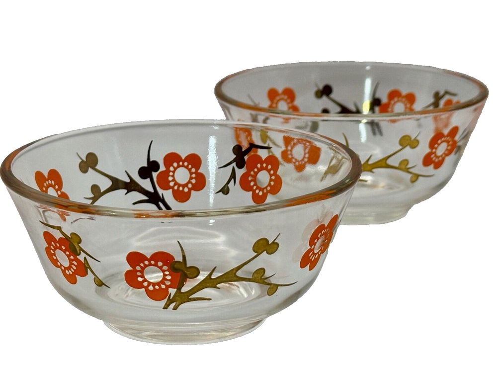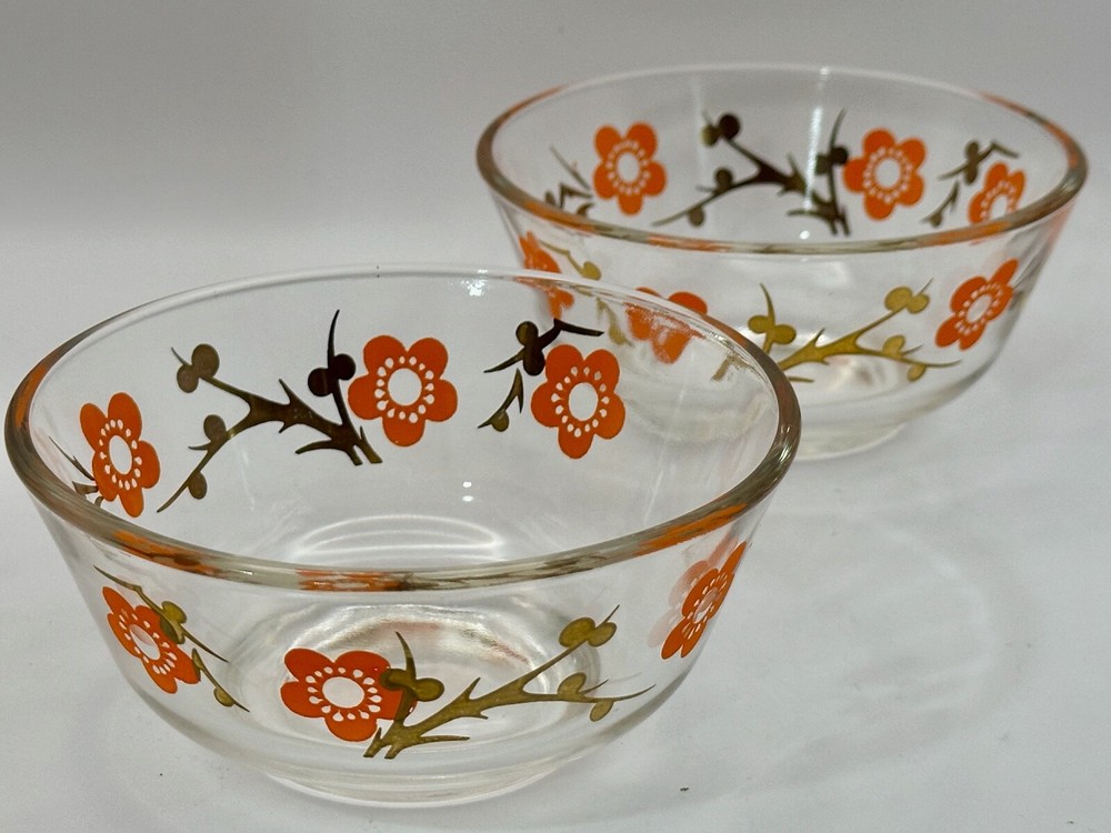 Welcome to my eBay store Capri Rocks! Quality Antiques, Collectibles, Mid Century Glass, Crystals, Rocks, Specimens and more. Be sure to follow me as a favorite seller and check back often as new listings are added daily. Wonderful pair of 1960s glass bowls. Cool 24k gold design with orange flowers. Great color combo and outstanding design. Perfect for any setting, very funky retro. Perfect for nut, dipping bowls or anything you can think of. Great Barware item or for a Mod Kitchen. Measures 5" across the top and 2 3/8" tall. Both in excellent condition. Please view all images as they are part of the description and condition. Message me any questions or if additional images are needed. Thank you. Items are guaranteed as stated in the description and shown in images. All my items are inspected prior to listing and again before they are packed. If any errors are made in the description a full refund will be issued upon return of the item. Item must be returned the same way it was sent. I ship all items quickly, and pack very carefully. Thank you for looking. ref:shelf