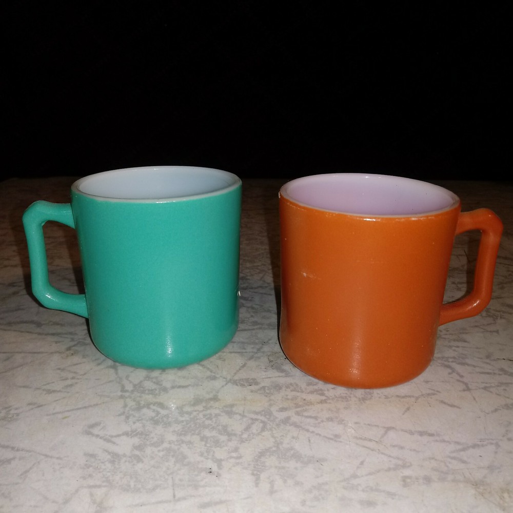 Pair Hazel Atlas Ovide Turquoise Teal Orange Rust Mugs Cups milk glass mid centu. Condition is "Used". Shipped with USPS Priority Mail....