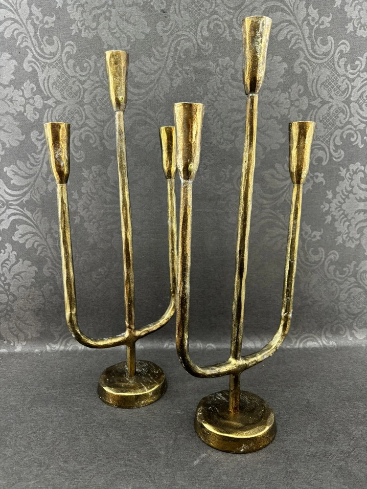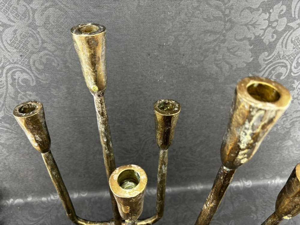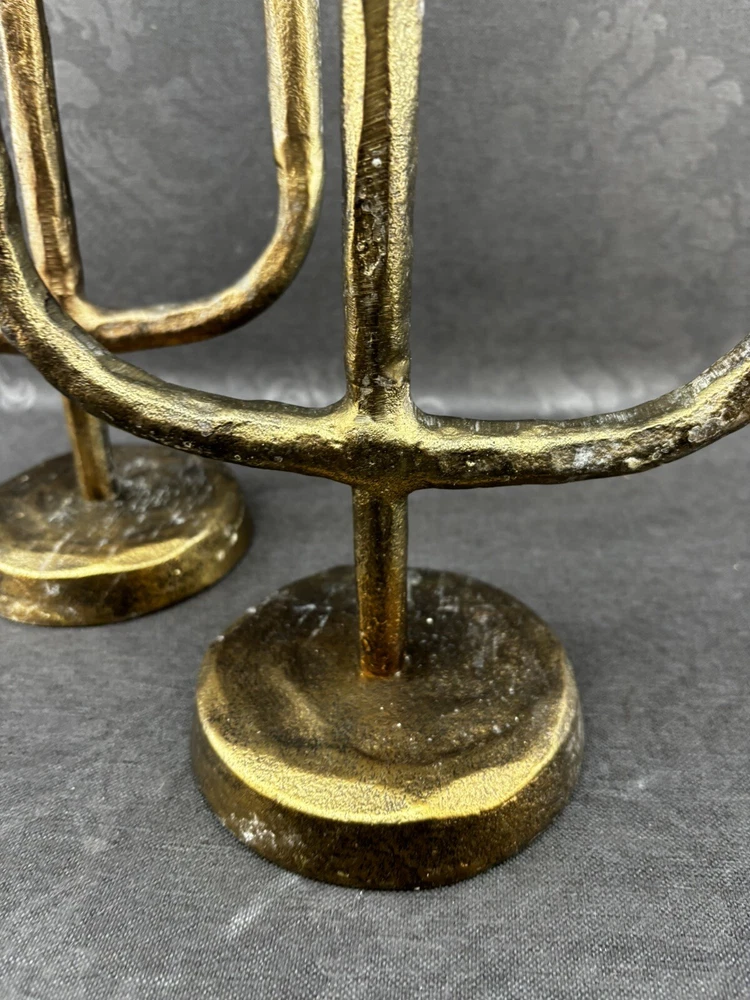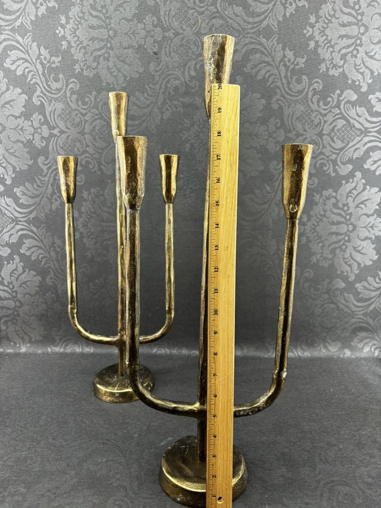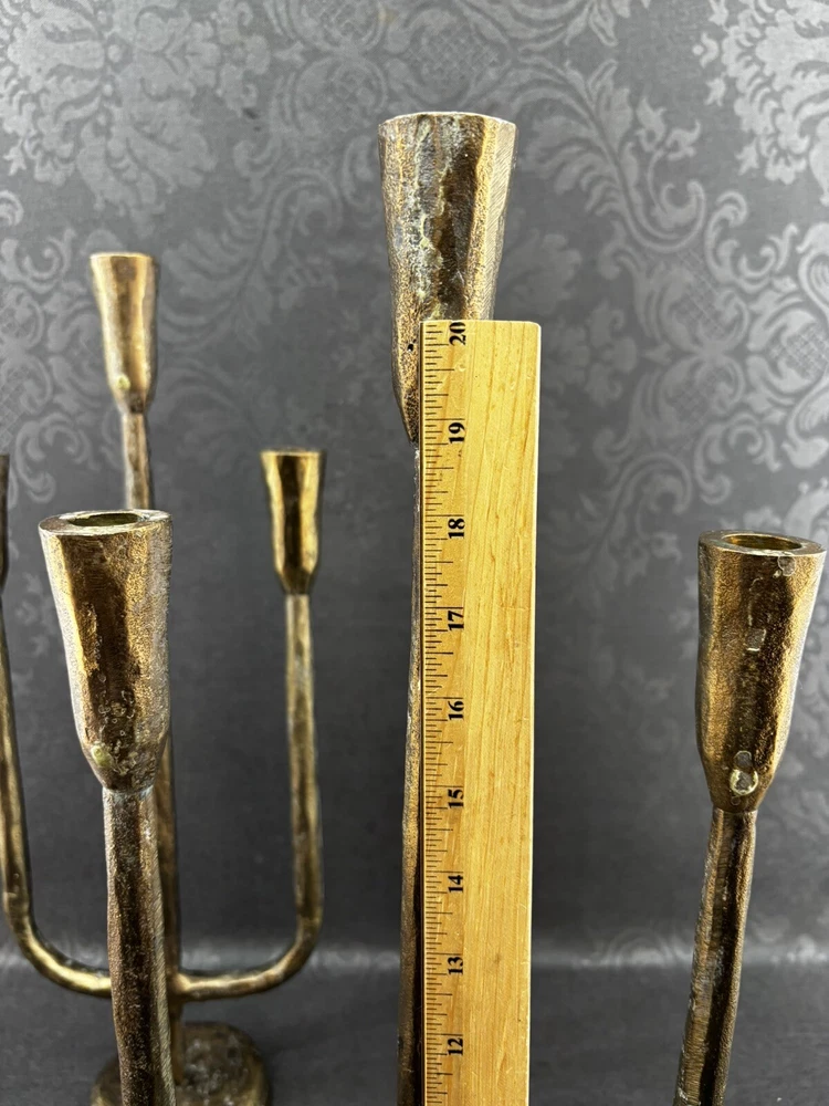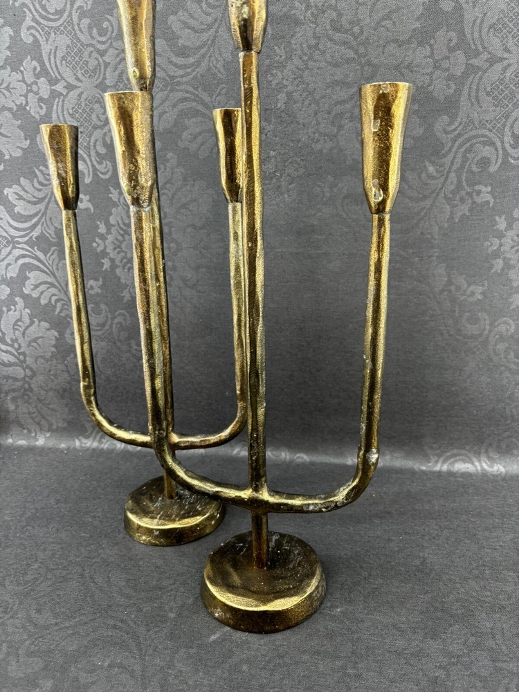 This is a very beautiful pair of large candleholders done in this rich golden finish forged brutalist style. They stand about 21 inches tall and are in excellent condition, light signs of use, they have been used as candleholders after all. Please have a good look at the many photos and thanks for your consideration. I have many other beautiful things posted here and I'm always happy to combine shipping whenever possible. Thanks for having a look! Shipping quoted is for the lower 48 states if you use a PO Box, APO or live anywhere else in the world please contact me directly for the shipping quotation. Canadian shipping exempts remote locations, if you are in question if this applies please contact me. I do everything in my power to insure that your purchase gets to you safely. If it should be damaged in shipping please remember to keep the packaging as well as the item. Contact me directly with photographs of both the item and packaging materials. No insurance claim can be submitted without these documents. I will handle the insurance claim and look after refunding your purchase price.