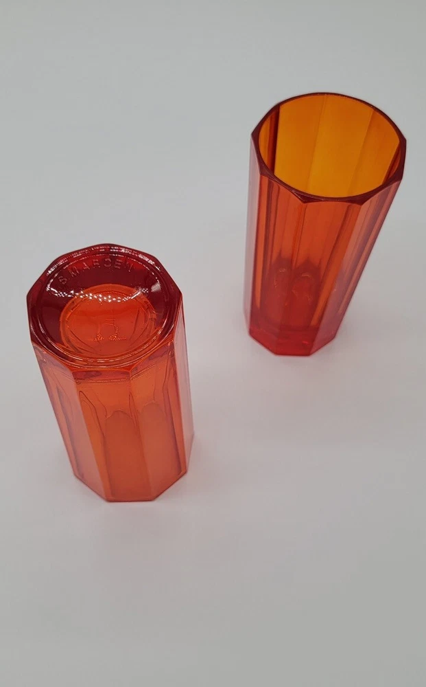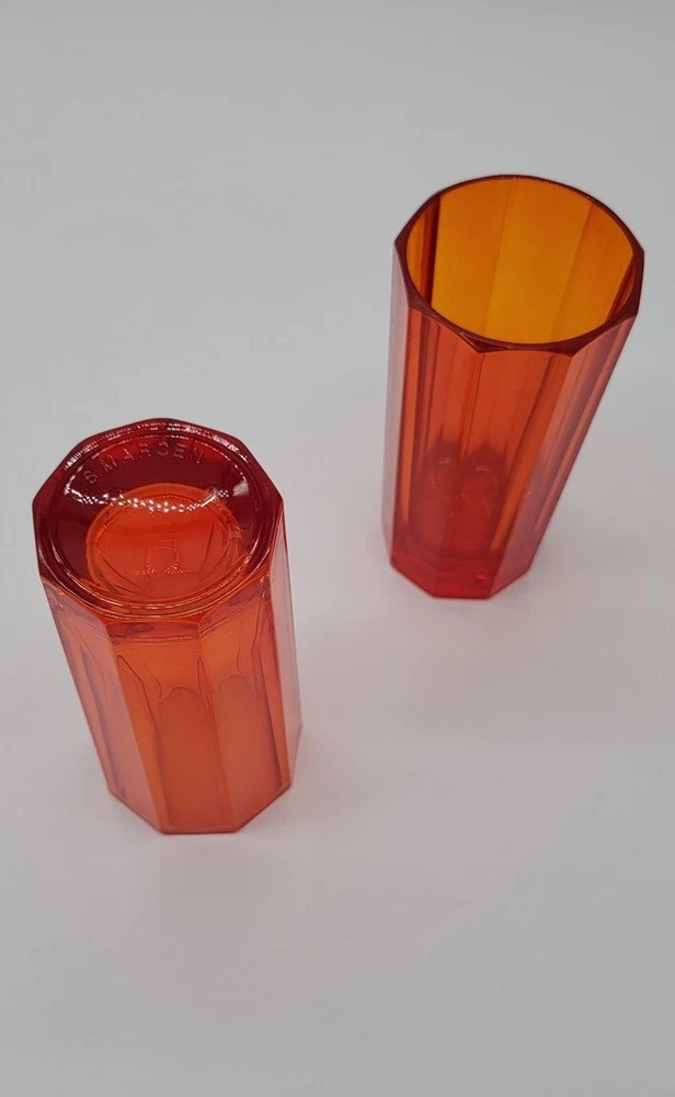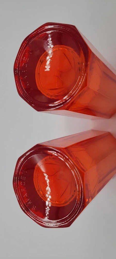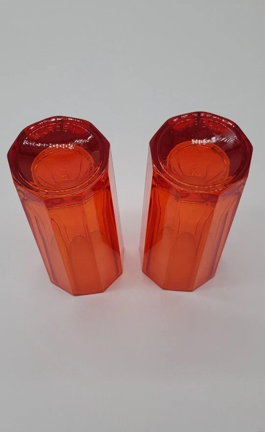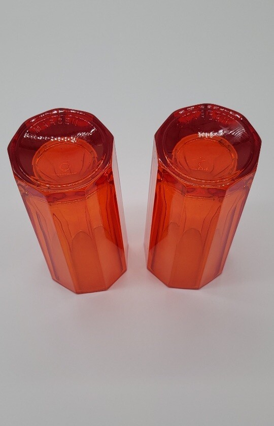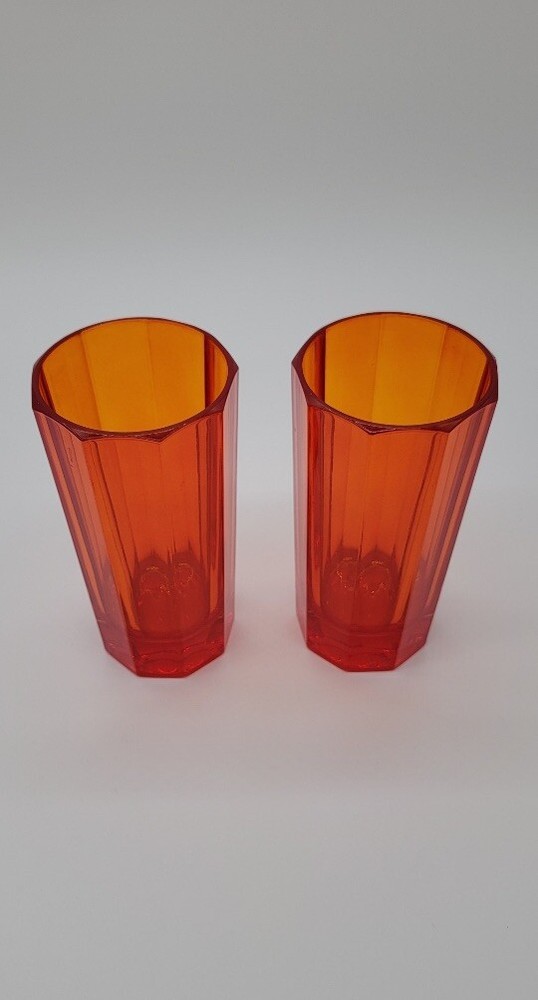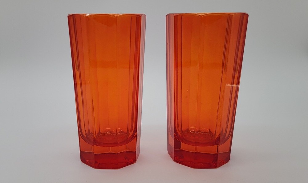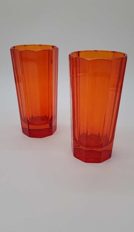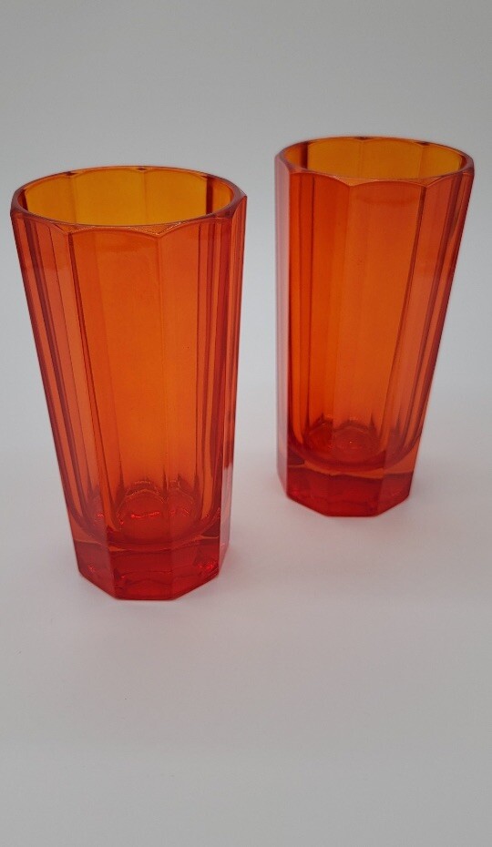 Add a touch of vintage charm to your drinkware collection with these rare Sebastian Marcen highball glasses. The glasses feature a unique 9 panel design in a translucent orange that is sure to catch the eye of any guest. The round shape and heavy, decorative construction make them a perfect addition to any Mid-Century Modern bar setup. Crafted from high-quality glass and standing at approximately 6.5 inches tall, these glasses are both original and functional. With a diameter of 3 inches across the top of the glass, they are perfect for serving a variety of beverages. The item weight is approximately 1.5lbs each and they come in a set of two. Add a touch of elegance to your home bar with these vintage highball glasses.