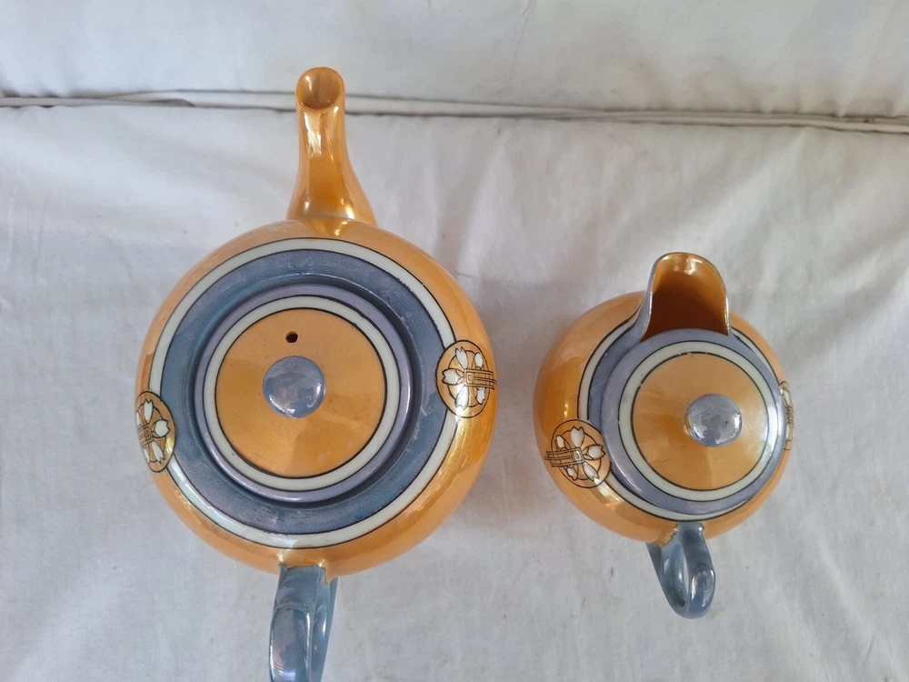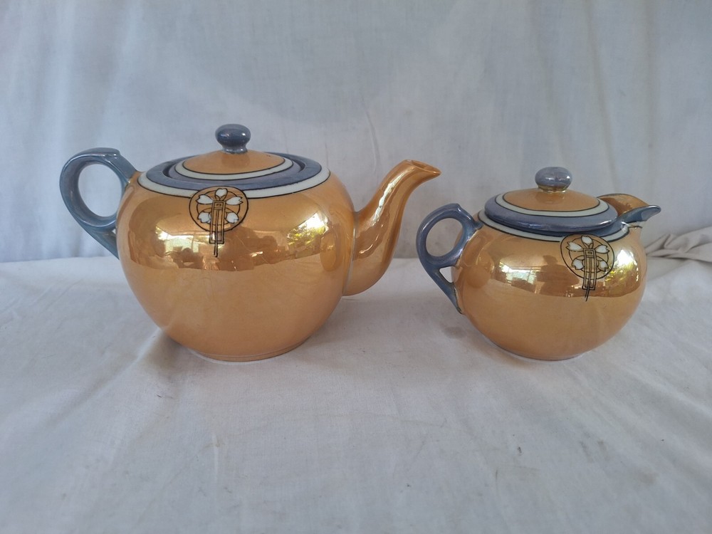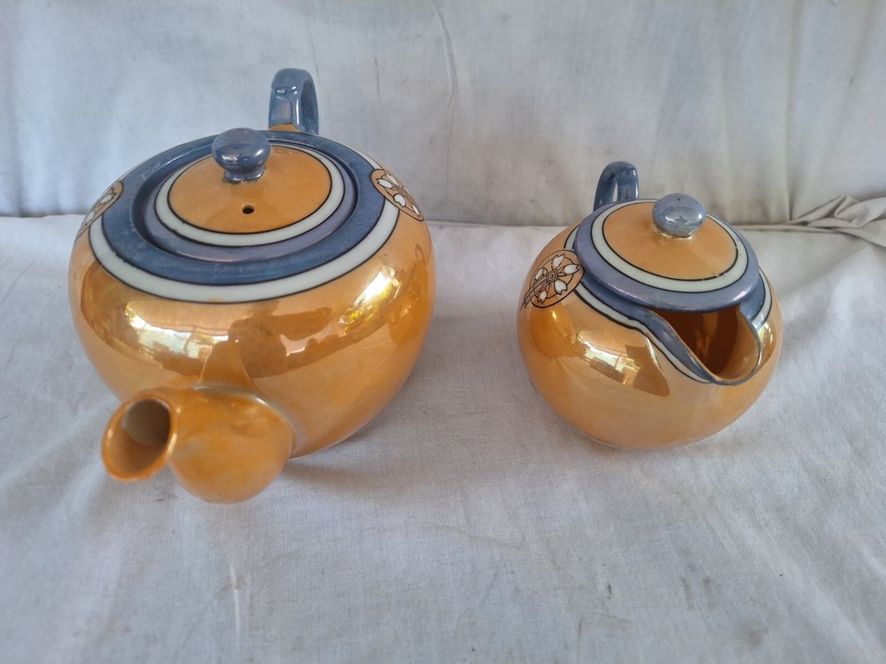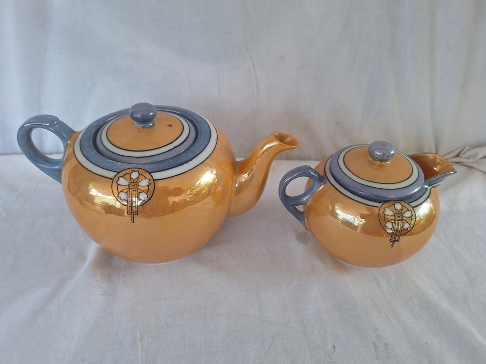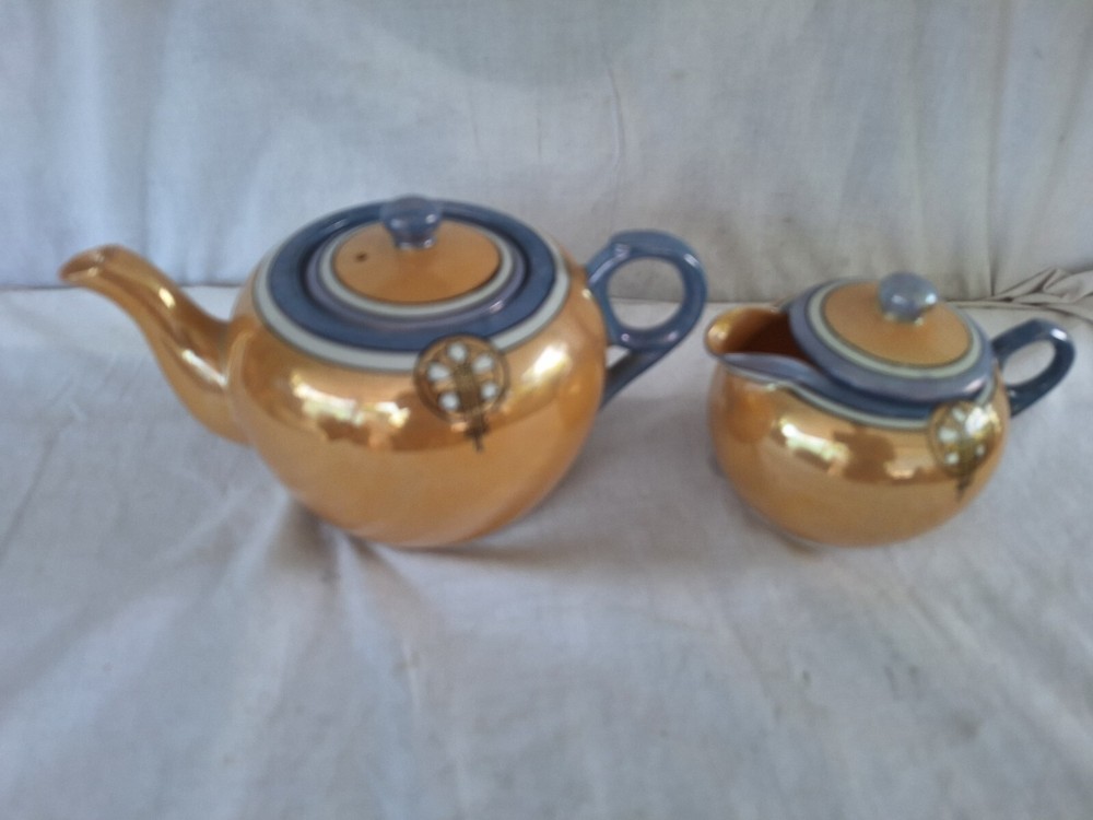 This vintage teapot set from Japan is a beautiful addition to any collection. The blue and orange lusterware design adds a touch of elegance to any tea time. Made in Japan, this set is a true representation of Japanese culture and craftsmanship. Perfect for serving creamer or tea, this set is sure to impress. Add a touch of Asian sophistication to your tea party with this stunning set. Has some wear in finish see detailed photos.