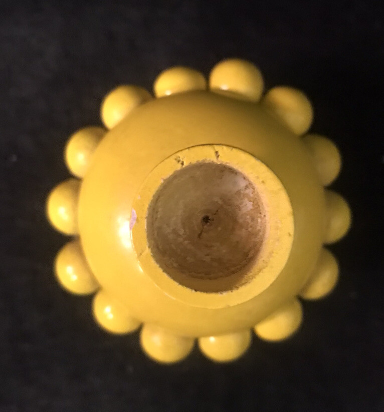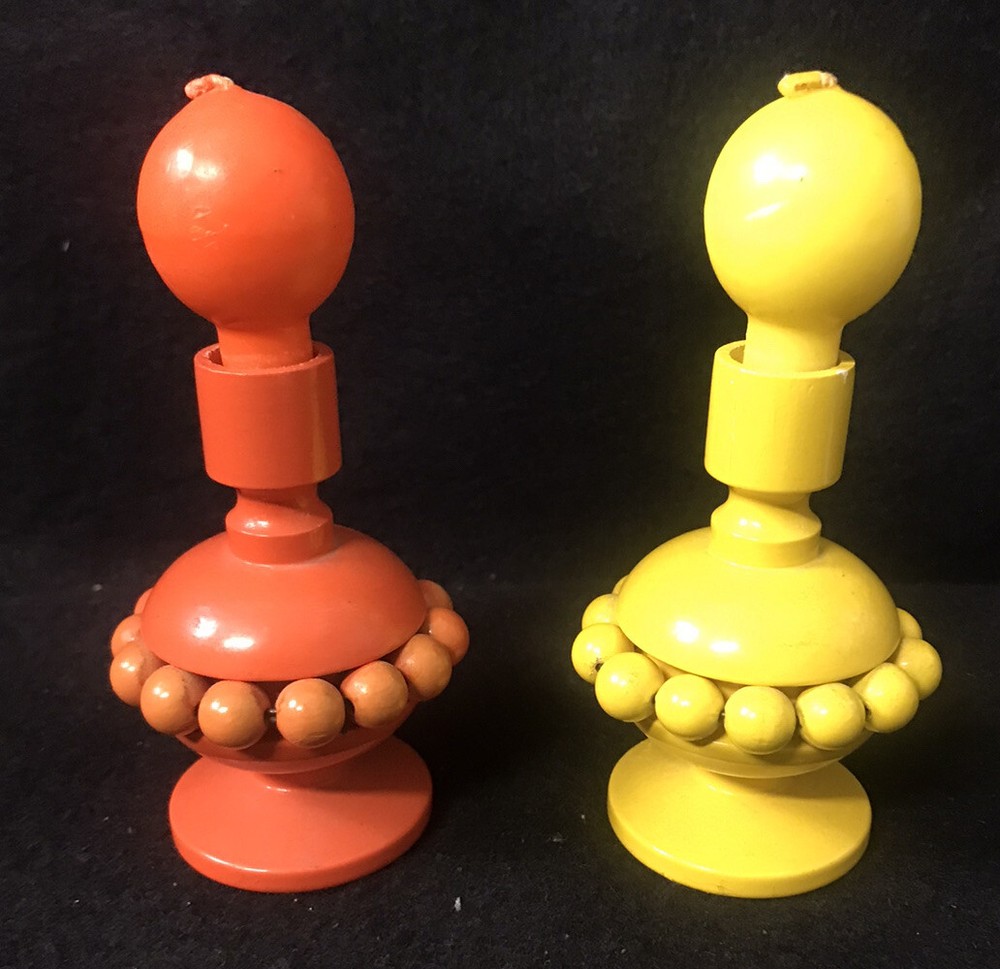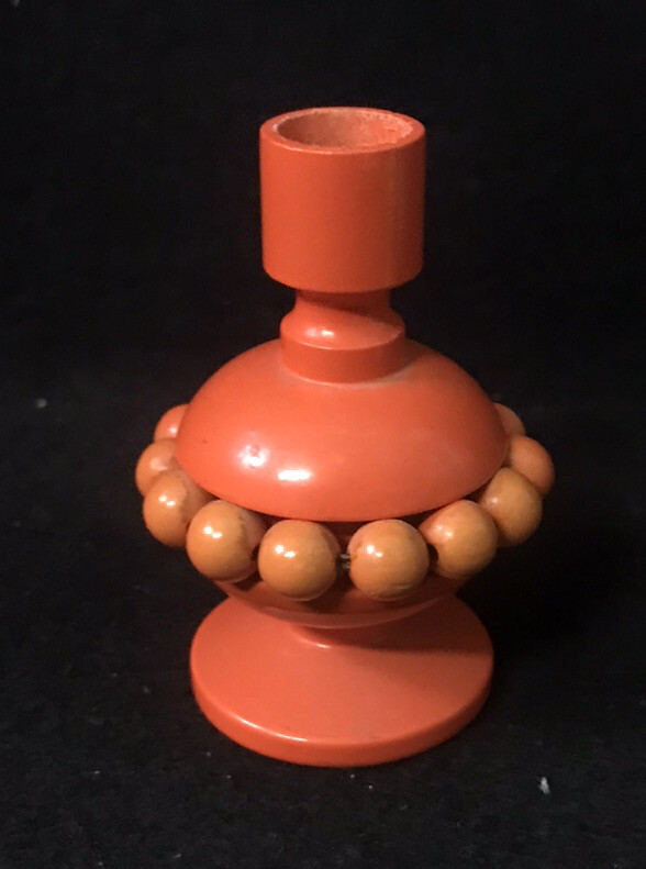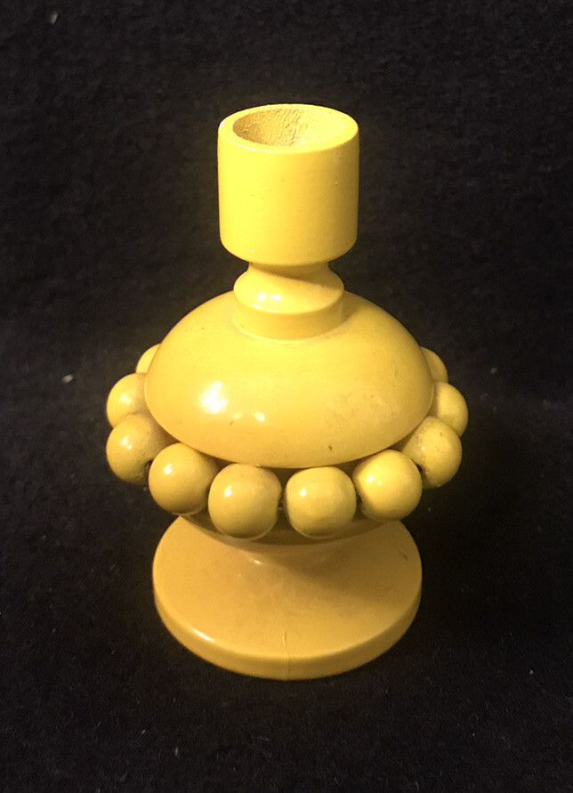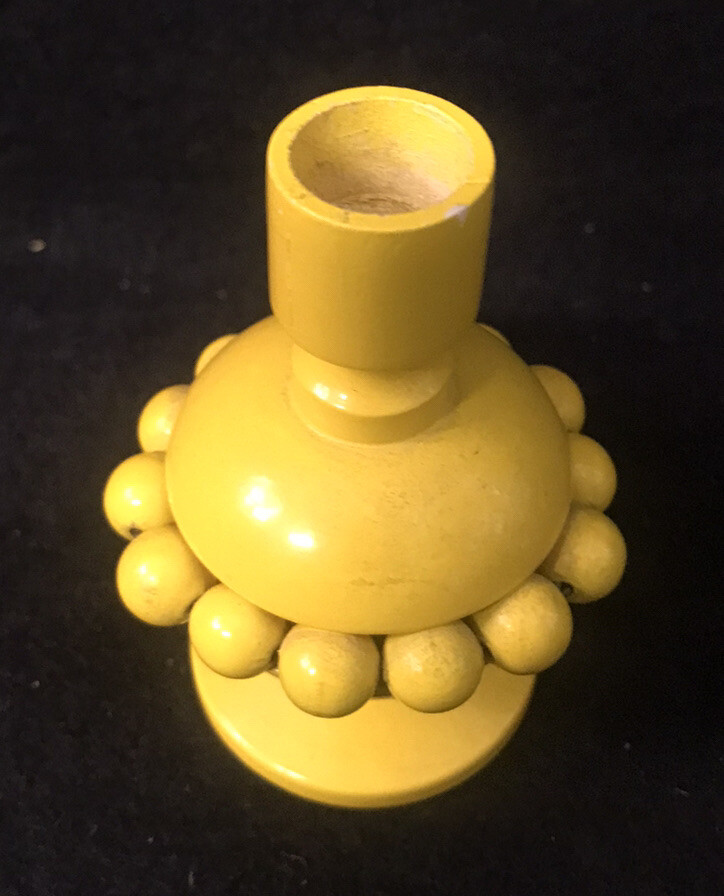 Pair of vintage yellow and orange Aarikka candle holders with beads from Finland. Two vintage matching candles are included. They measure approximately 3-1/4” tall by 2-1/4” in diameter. ( Without the candles inserted.) Great pair of pop art or Mid Century Modern designed candle holders.