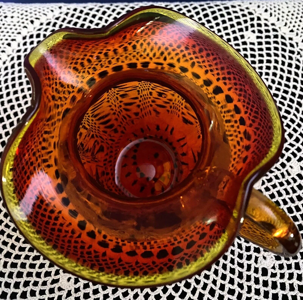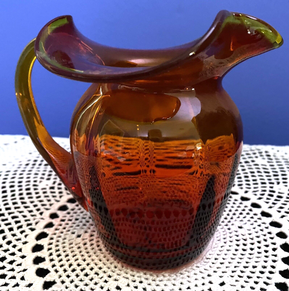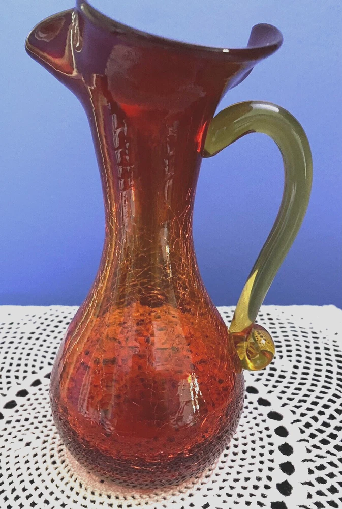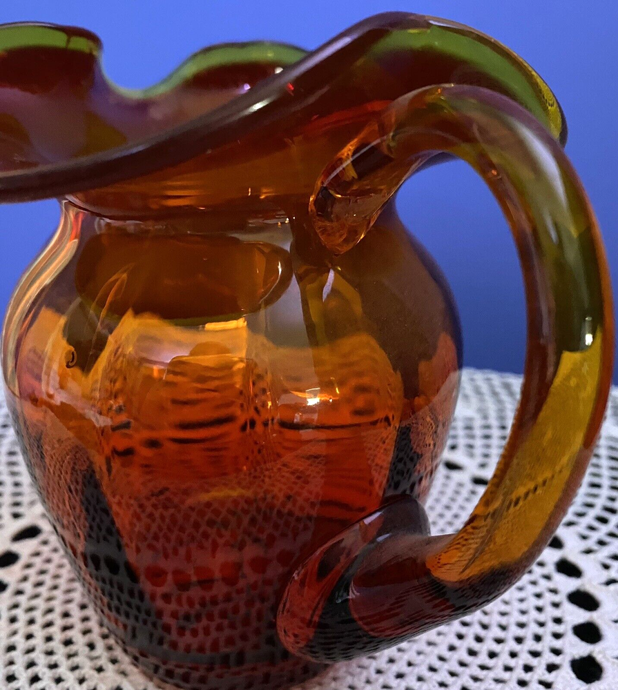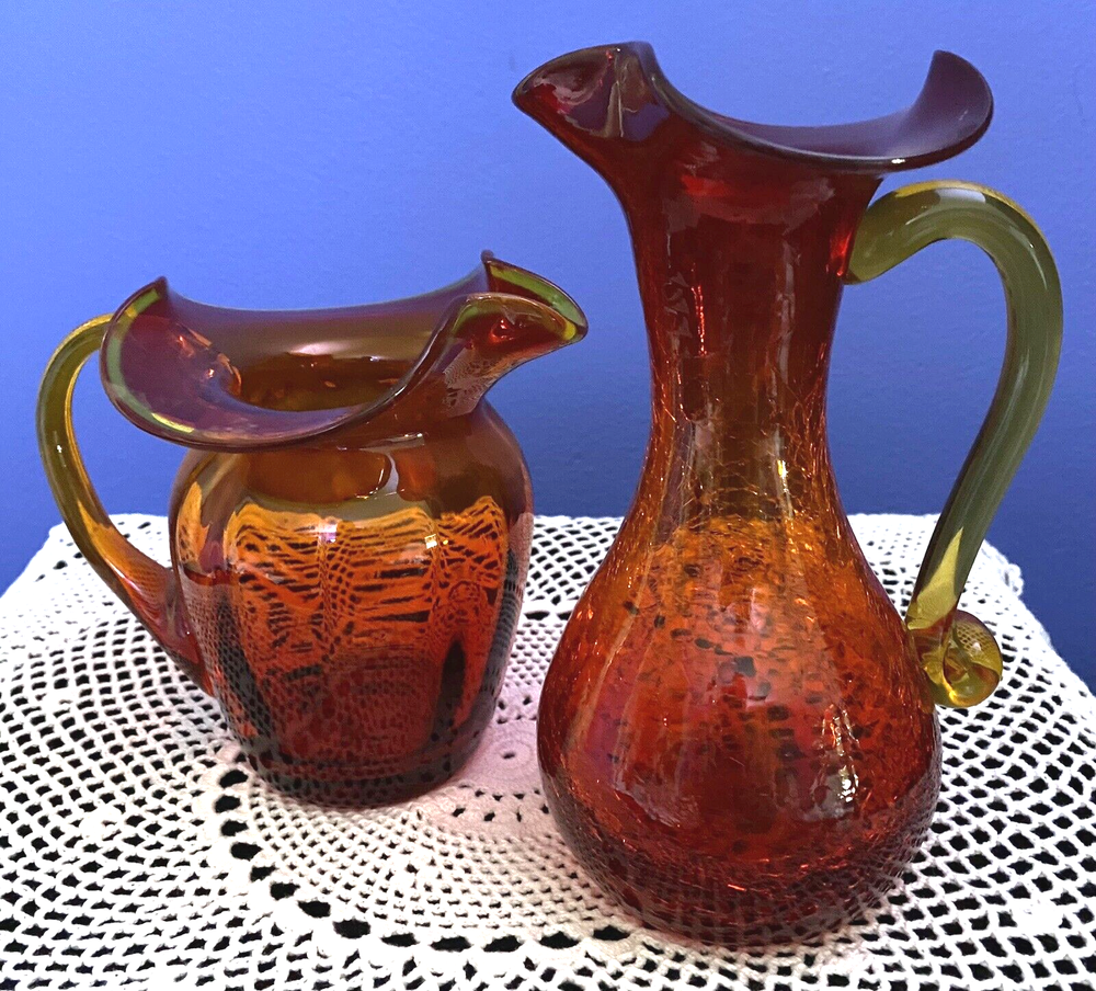 This is a pair of pretty orange or “Amberina” MCM hand blown glass pitchers with large “ruffled” tops. The taller one stands 7” and the other is 5” tall. The 2 have a nice orange and yellow blend to them, and have clear yellow applied handles. Both are in excellent condition with no damage. Please see photos. They will be carefully wrapped and boxed, and ships by USPS Priority Mail or Ground Advantage, your choice. Combined shipping available.