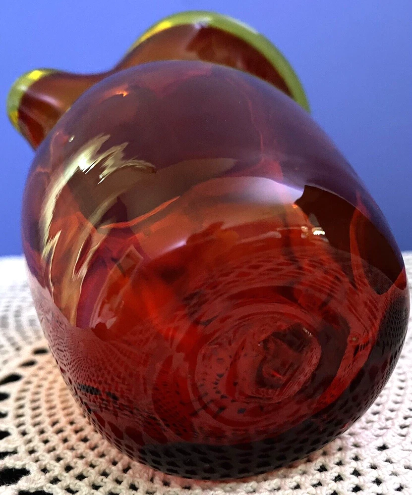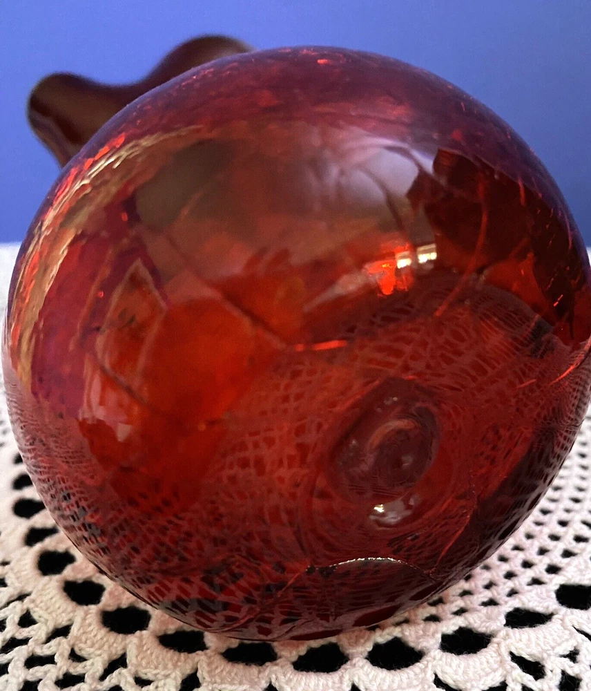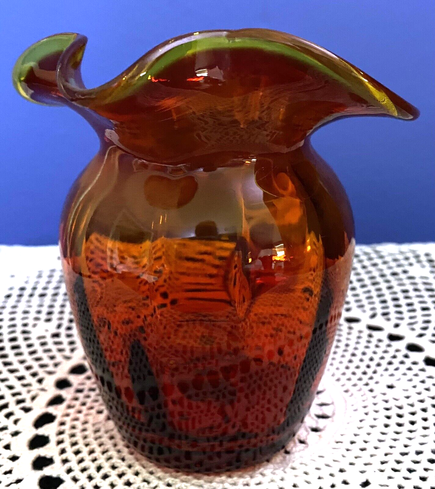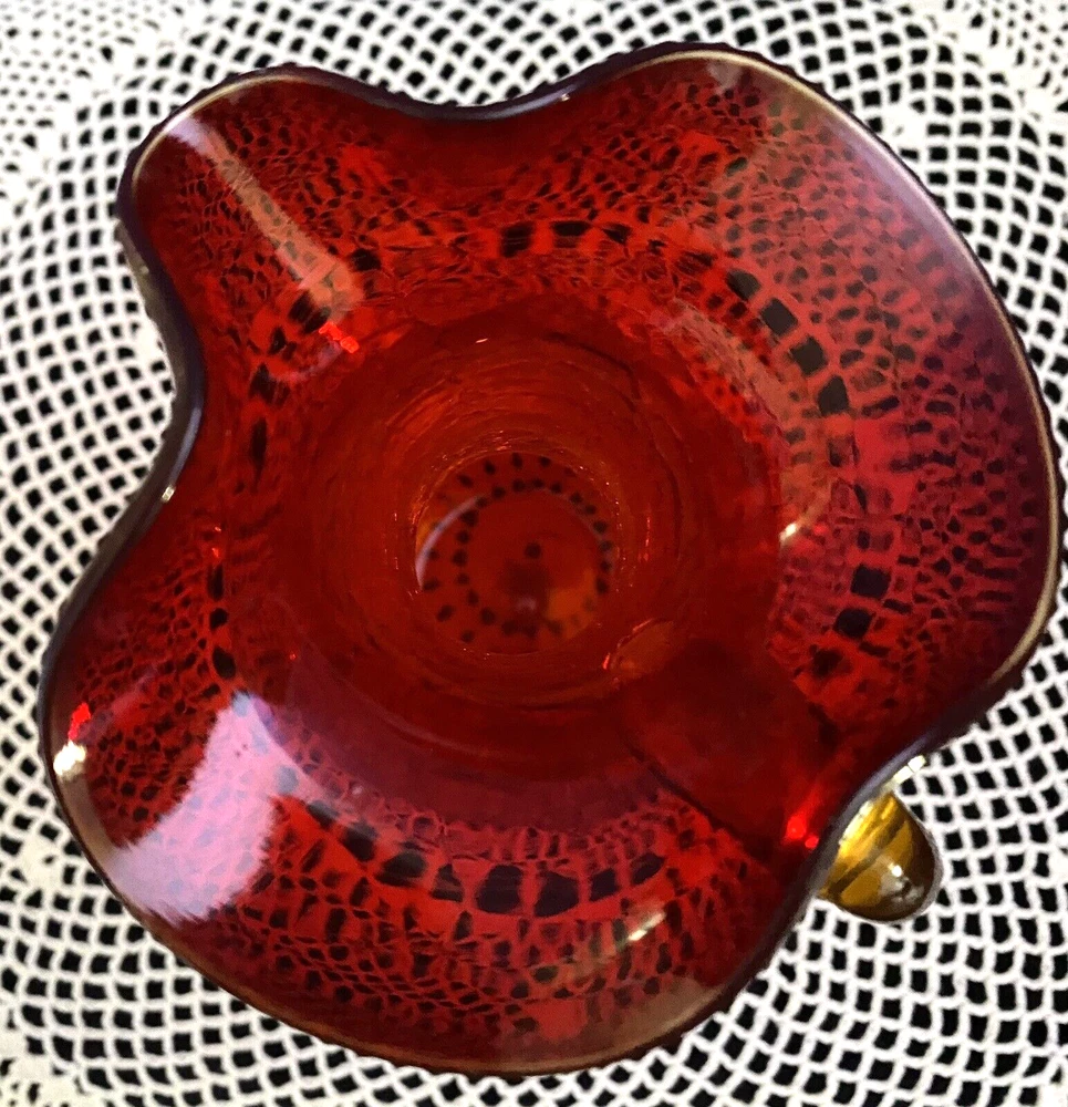 This is a pair of pretty orange or “Amberina” MCM hand blown glass pitchers with large “ruffled” tops. The taller one stands 7” and the other is 5” tall. The 2 have a nice orange and yellow blend to them, and have clear yellow applied handles. Both are in excellent condition with no damage. Please see photos. They will be carefully wrapped and boxed, and ships by USPS Priority Mail or Ground Advantage, your choice. Combined shipping available.