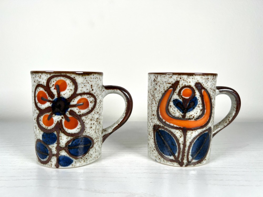 Pair of Mid Century Orange & Blue Floral Ceramic Mugs...