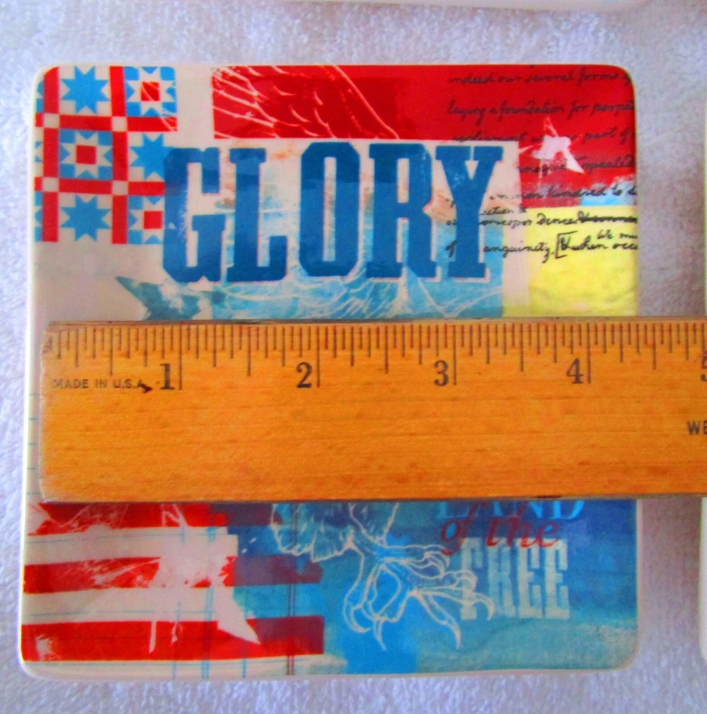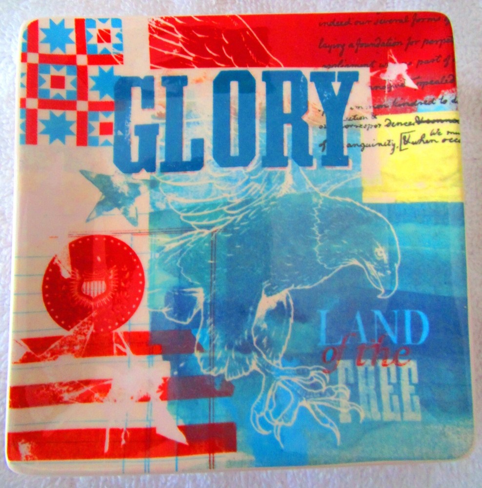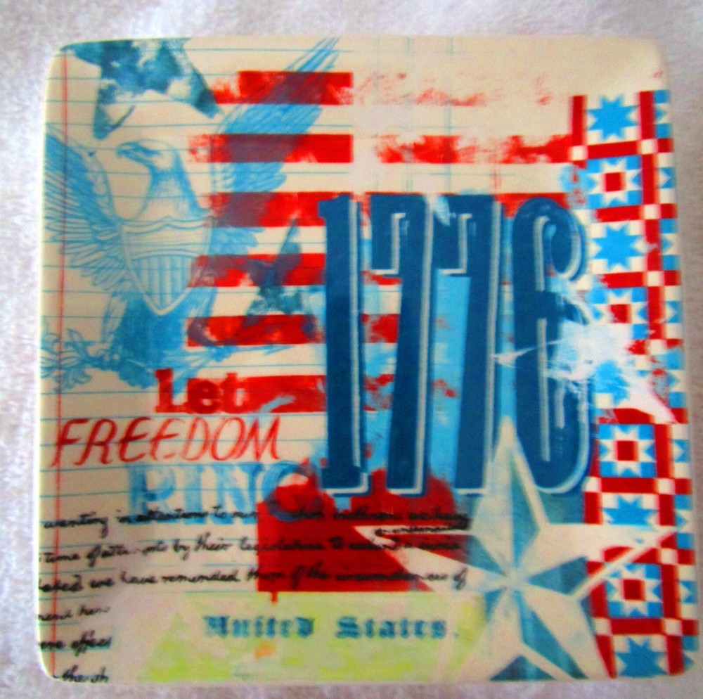The Phoenix Creative Co-op Mini Plate Set features a patriotic "Land Of Liberty" 4th of July, American flag design on square ceramic plates measuring 4.5" x 4.5". These multicolor plates have a glossy finish and are suitable for any room as decorative pieces. The set does not require any additional parts and is branded by Creative Co-Op. Plates are new in original box and have never been used.