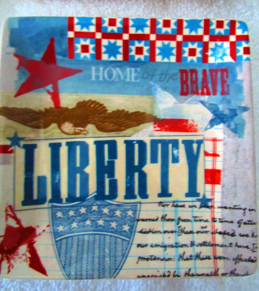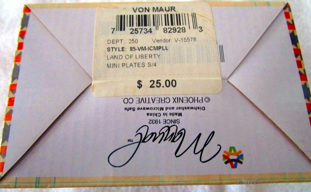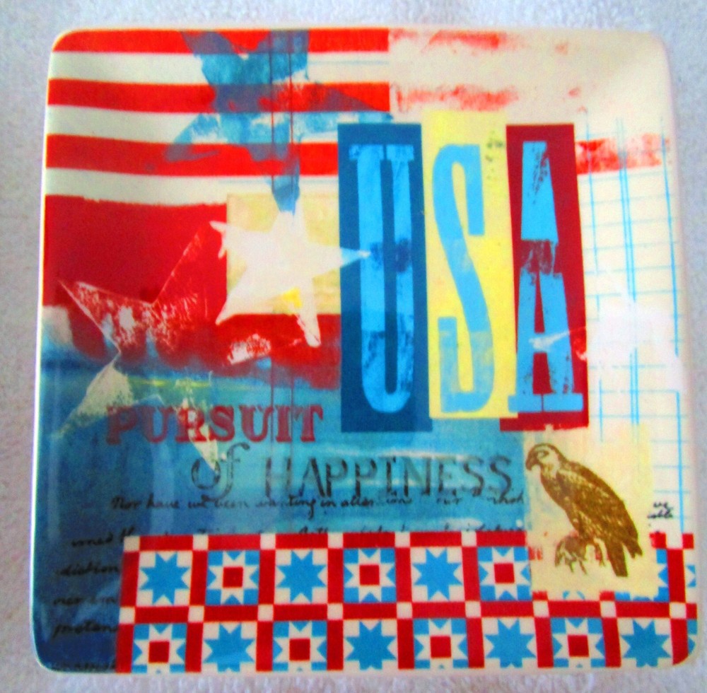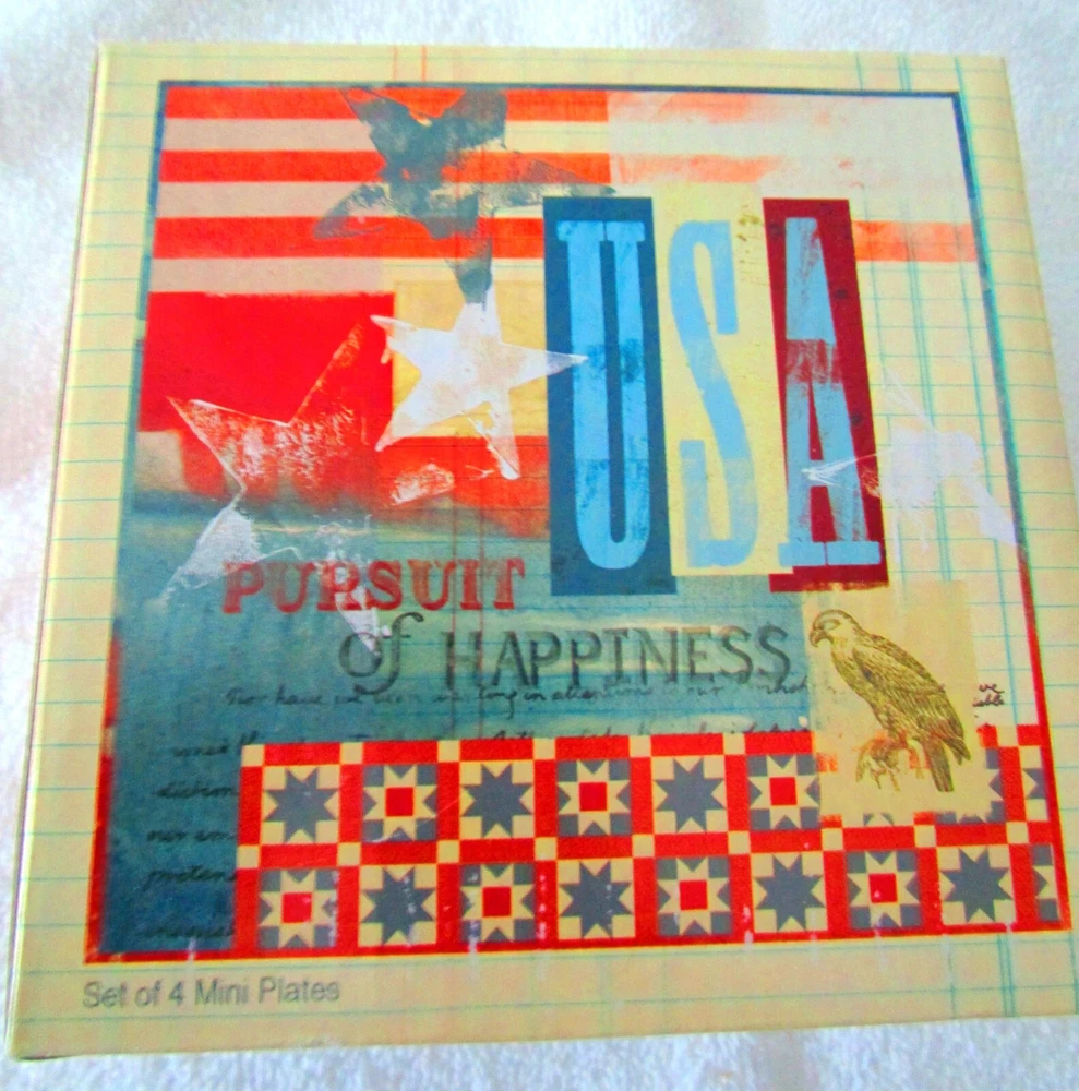 The Phoenix Creative Co-op Mini Plate Set features a patriotic "Land Of Liberty" 4th of July, American flag design on square ceramic plates measuring 4.5" x 4.5". These multicolor plates have a glossy finish and are suitable for any room as decorative pieces. The set does not require any additional parts and is branded by Creative Co-Op. Plates are new in original box and have never been used.