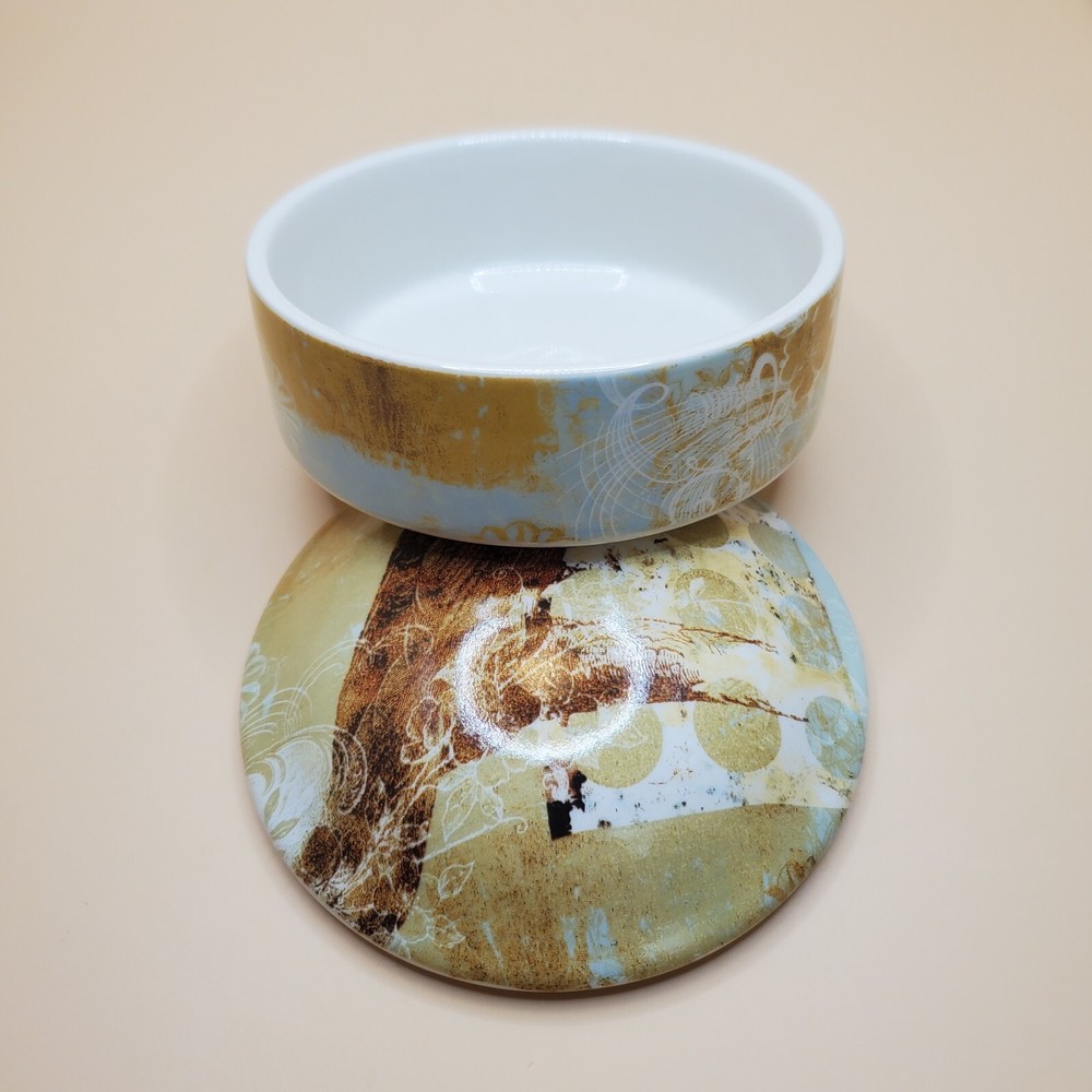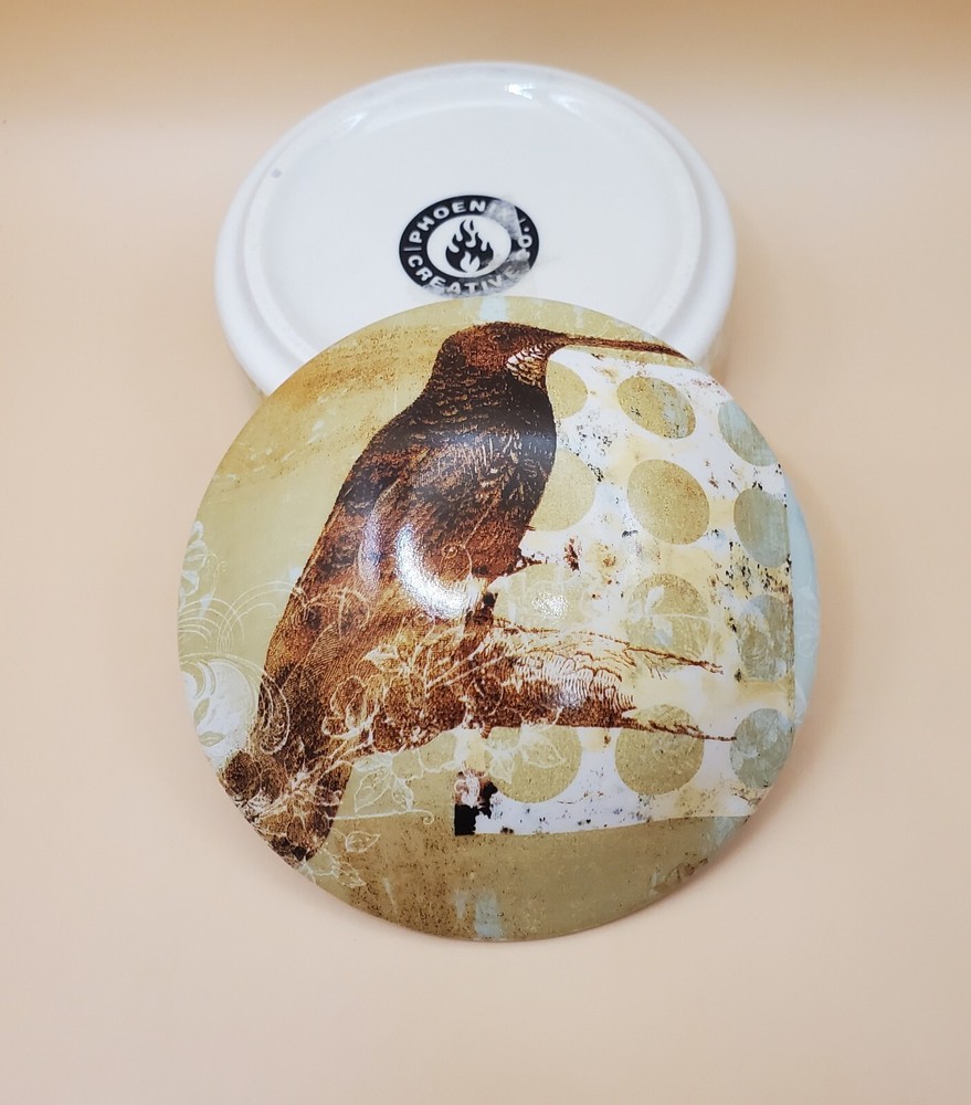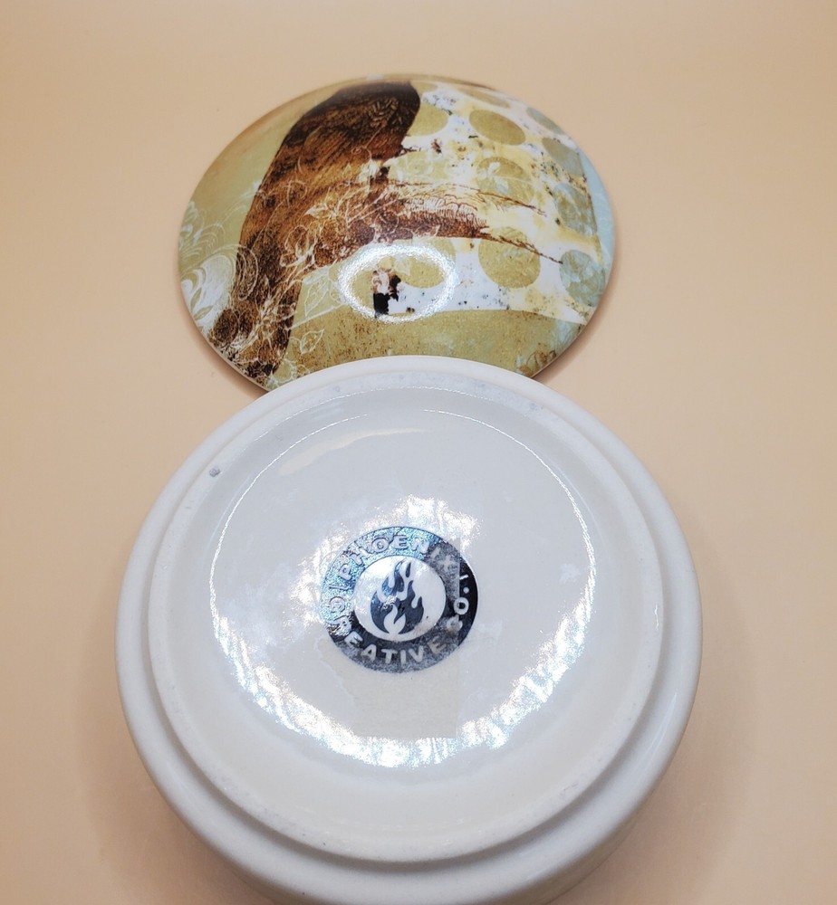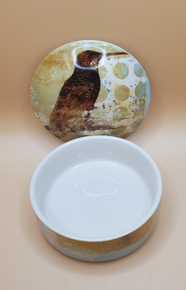 Pretty bird deco box, in very good used condition. Pretty Autumn colors in golds and browns. It has no chips or cracks and measures about 3" x 4 1/2"